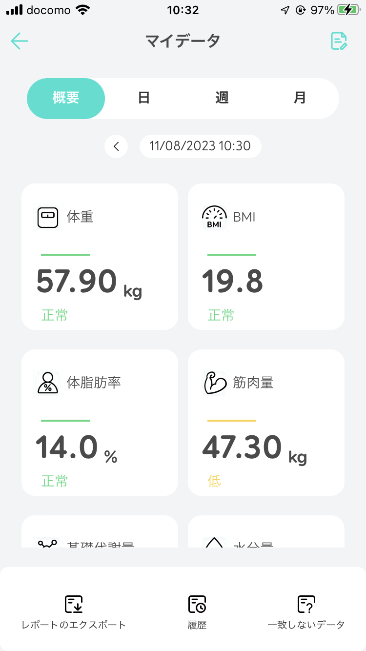 毎日測定していくと、日・週・月ごとの変化を見ることができたり、週に3日以上測定すると週間レポート、月に10日以上測定すると月間レポートが作成されます。