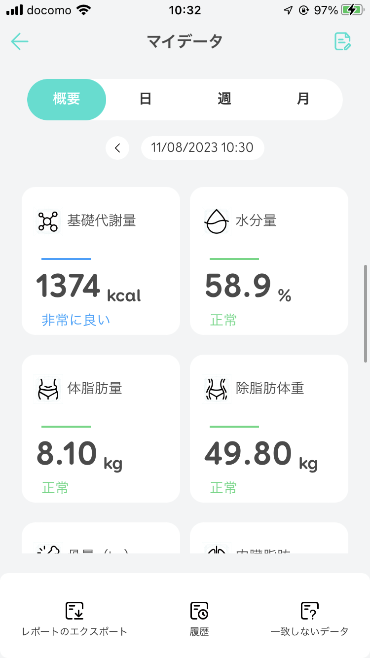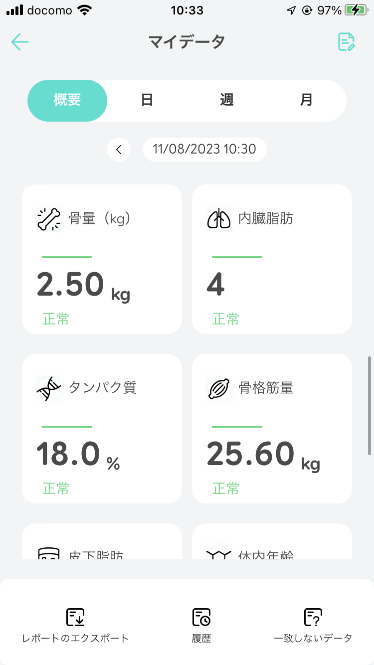 測定完了すると、データが転送され、アプリを開くと最新の測定値が表示されます。