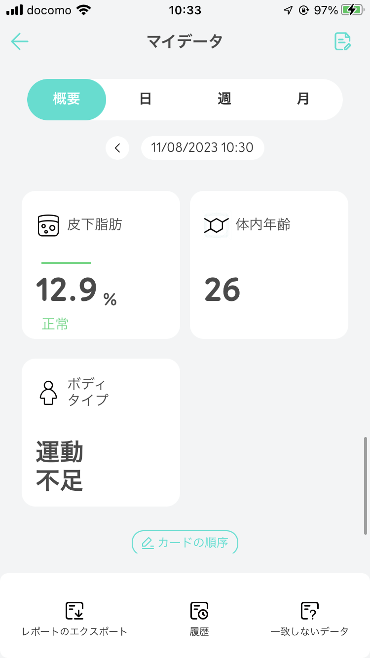 想像より結果が良かったので一安心しましたが、運動不足と表示されてしまいましたので、運動量を増やして筋肉量増加と体脂肪率低減を目標に頑張ってみたいと思います。