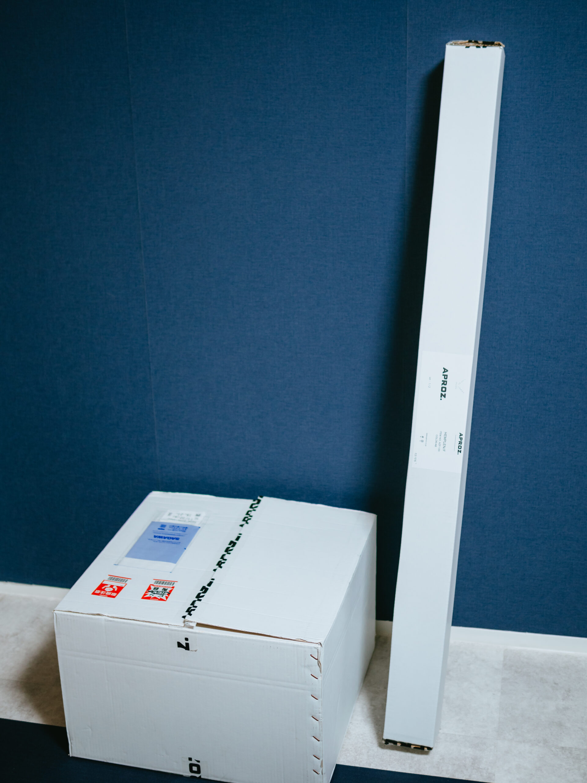 支柱とシェード・土台が2つの段ボールで届きます。組み立ては5分程度で簡単にできます。付属の六角レンチで土台に支柱を固定し、シェードを被せてネジで固定します。