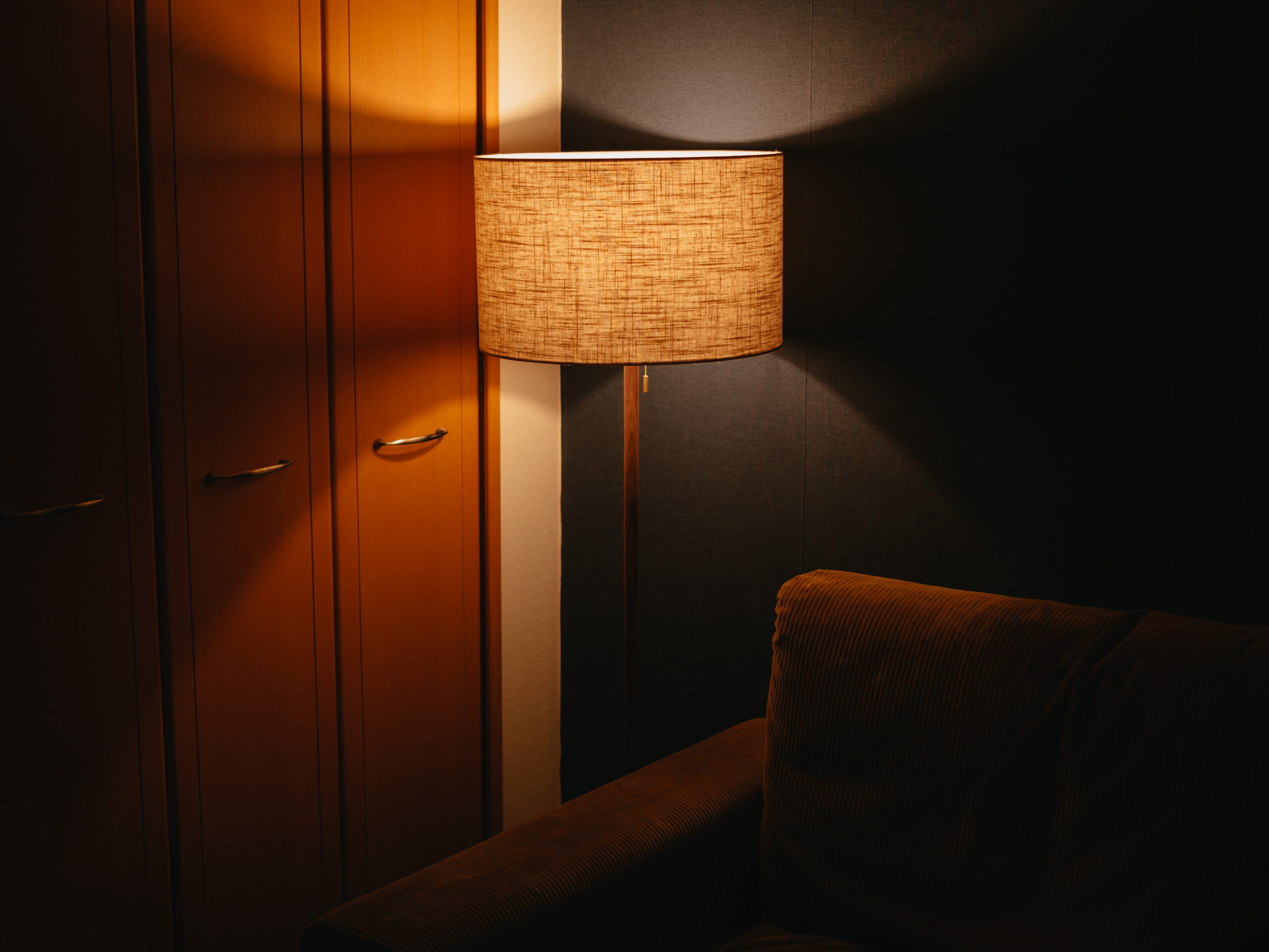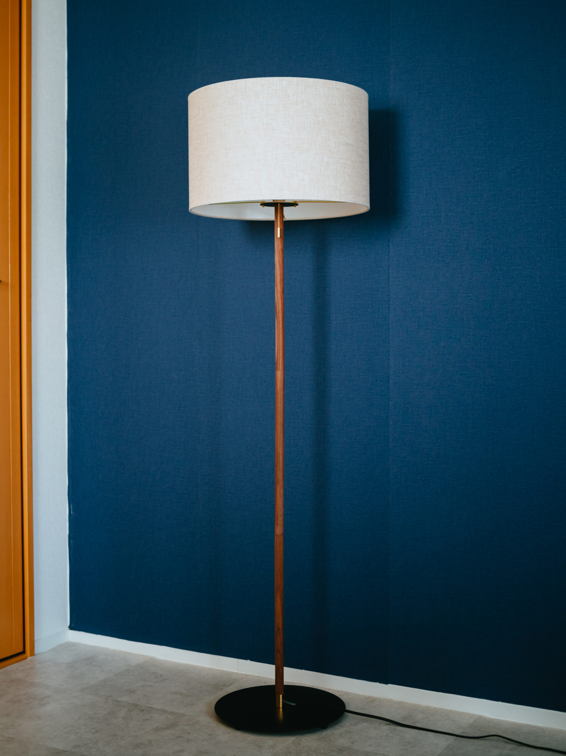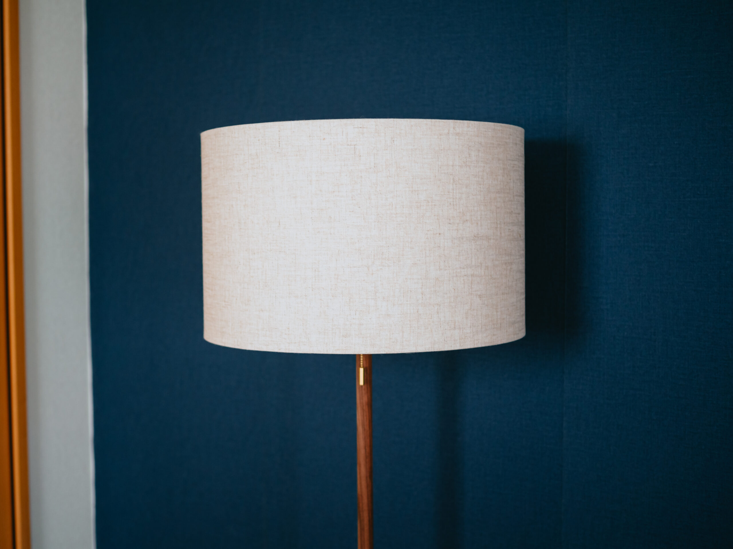 ホテルでよく見かける円柱型のシェードのフロアランプ。シェードが大きく、明かりが灯っていない時もインテリアとしての存在感があります。