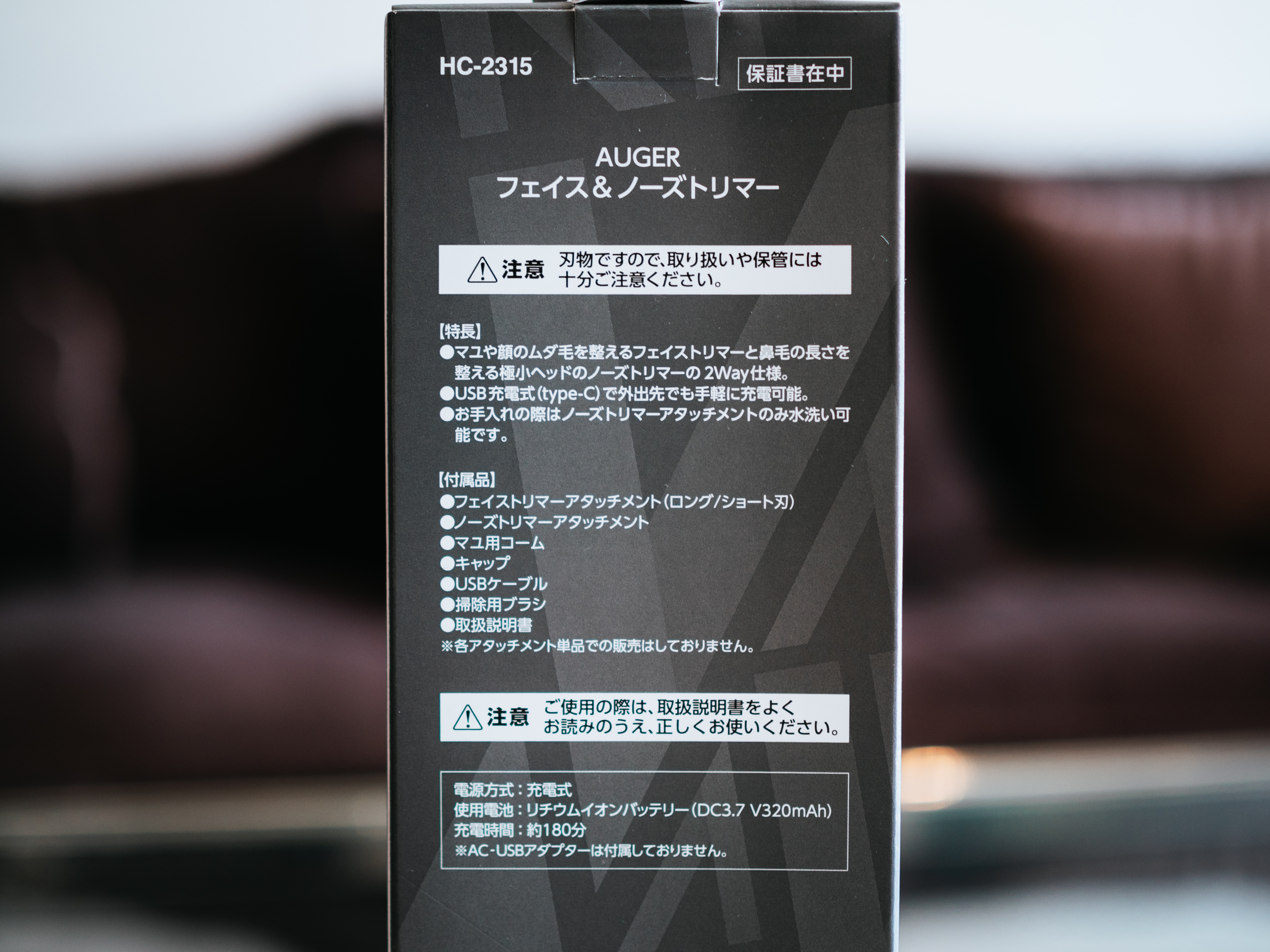 パナソニックの鼻毛トリマーは力強く駆動してしっかり短時間で鼻毛を剃れるので使用感は満足でしたが、本体が大きいため場所を取る、乾電池式でこれだけのために単3電池を買わなければならない、1〜2年くらいで急に動かなくなり故障が多く耐久性に難あり、という点が不満だったため、この機会に他の鼻毛トリマーを探したところ、AUGER(オーガー)の鼻毛以外にもマルチに使える電動トリマーと出会い、購入してみました。