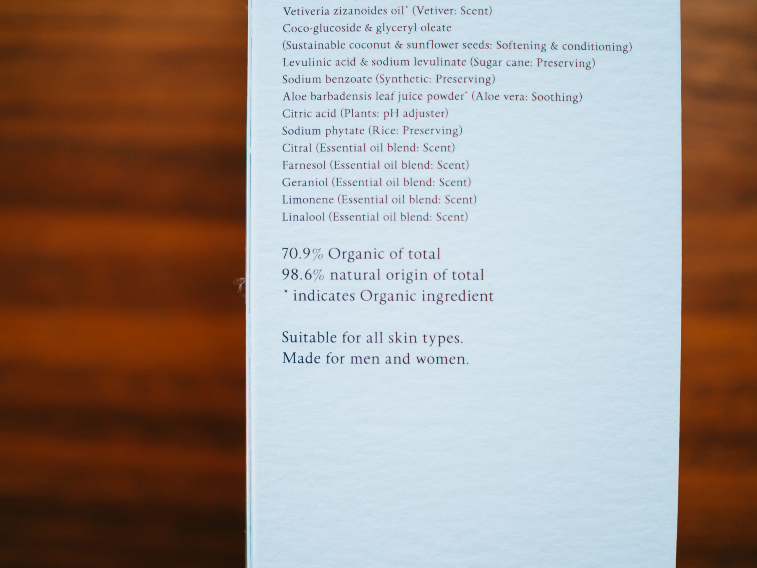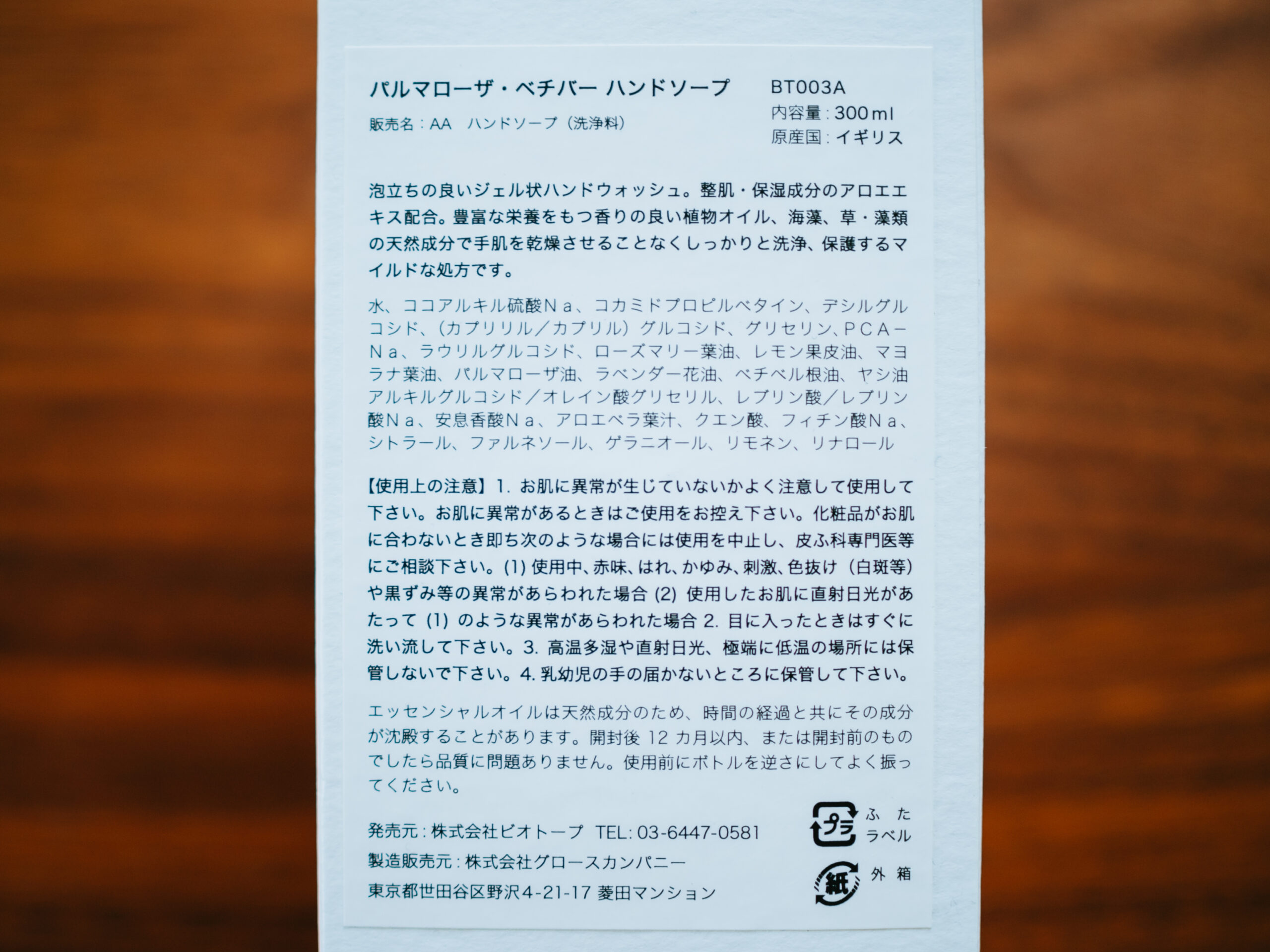 | 水、ココアルキル硫酸Na、コカミドプロピルベタイン、デシルグルコシド、(カプリリル/カプリル)グルコシド、グリセリン、PCANa、ラウリルグルコシド、ローズマリー葉油、レモン果皮油、マヨラナ葉油、パルマローザ油、ラベンダー花油、ベチベル根油、ヤシ油アルキルグルコシド/オレイン酸グリセリル、レブリン酸/レブリン酸Na、安息香酸Na、アロエベラ葉汁、クエン酸、フィチン酸Na、シトラール、ファルネソール、ゲラニオール、リモネン、リナロール |