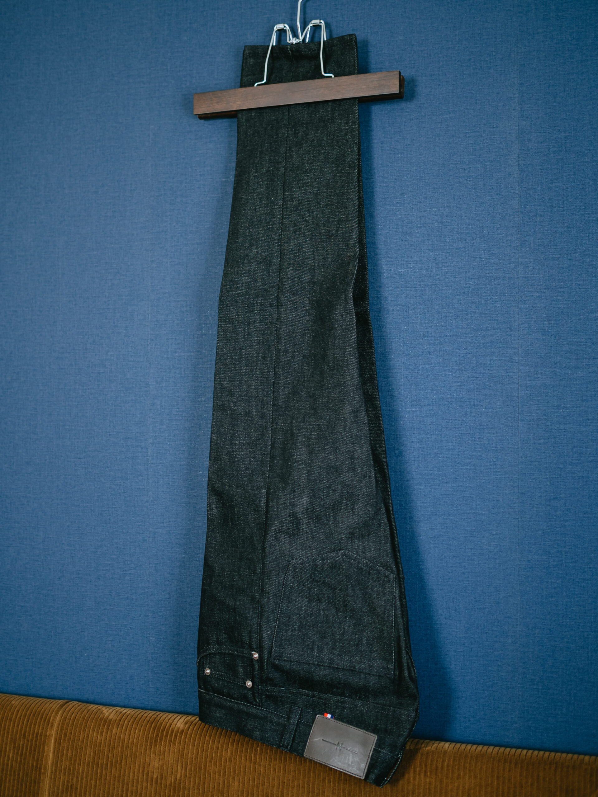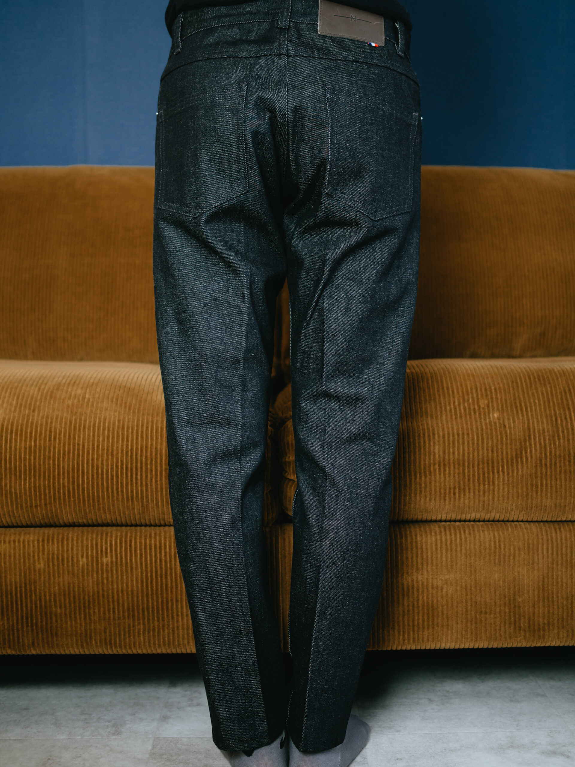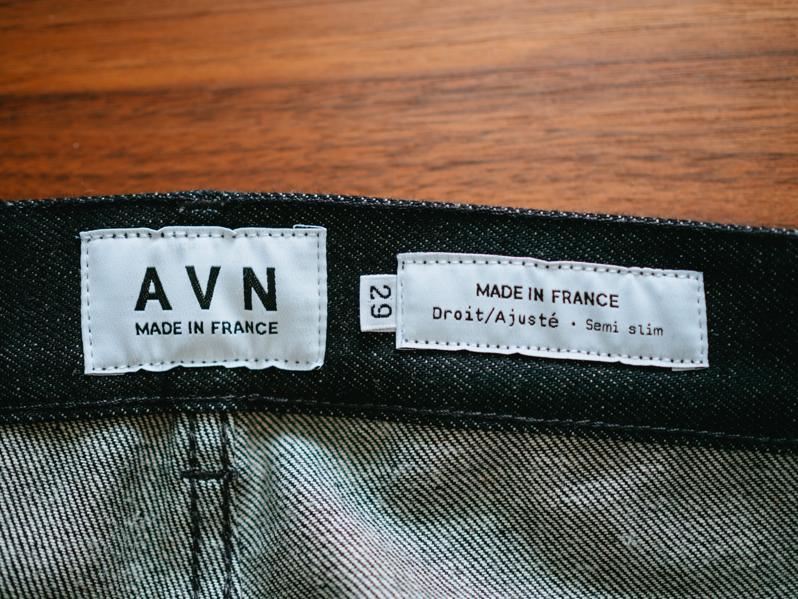 モデル名は「Semi Slim(セミスリム)」。名前の通り、裾にかけて少しテーパードがかかった綺麗なシルエットです。色落ちやダメージ加工が強かったり、スキニージーンズやワイドシルエットのデニムは苦手なのですが、このAVN(エーブイエヌ)のデニムは太すぎず細すぎず、生地の色合いも濃いめでモダンで洗練された見た目で、まさにフランスデニムといった感じ。