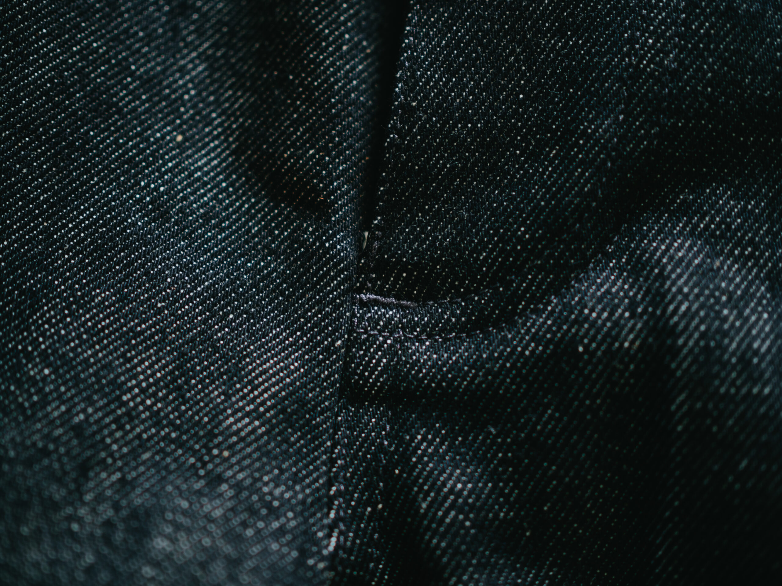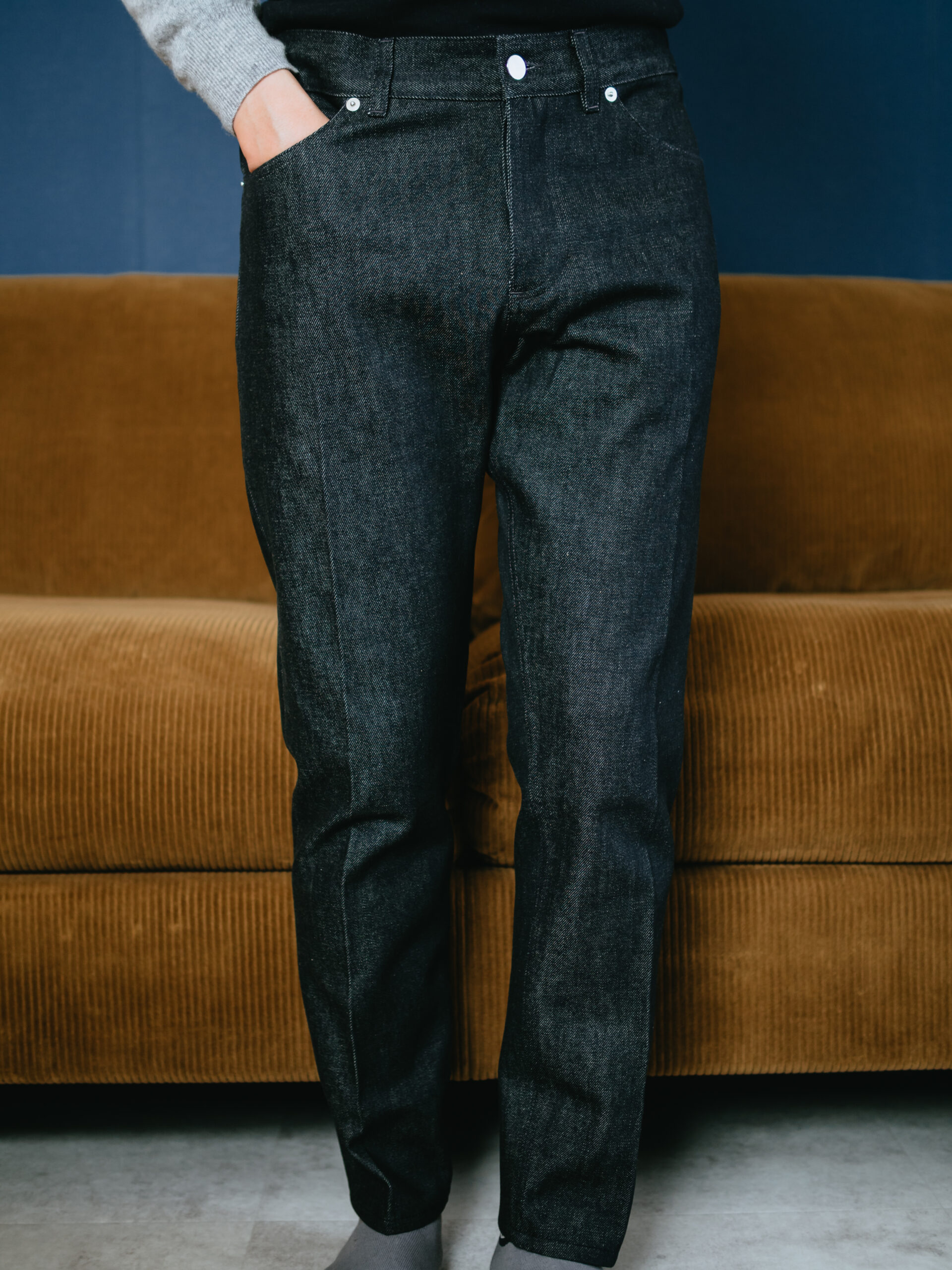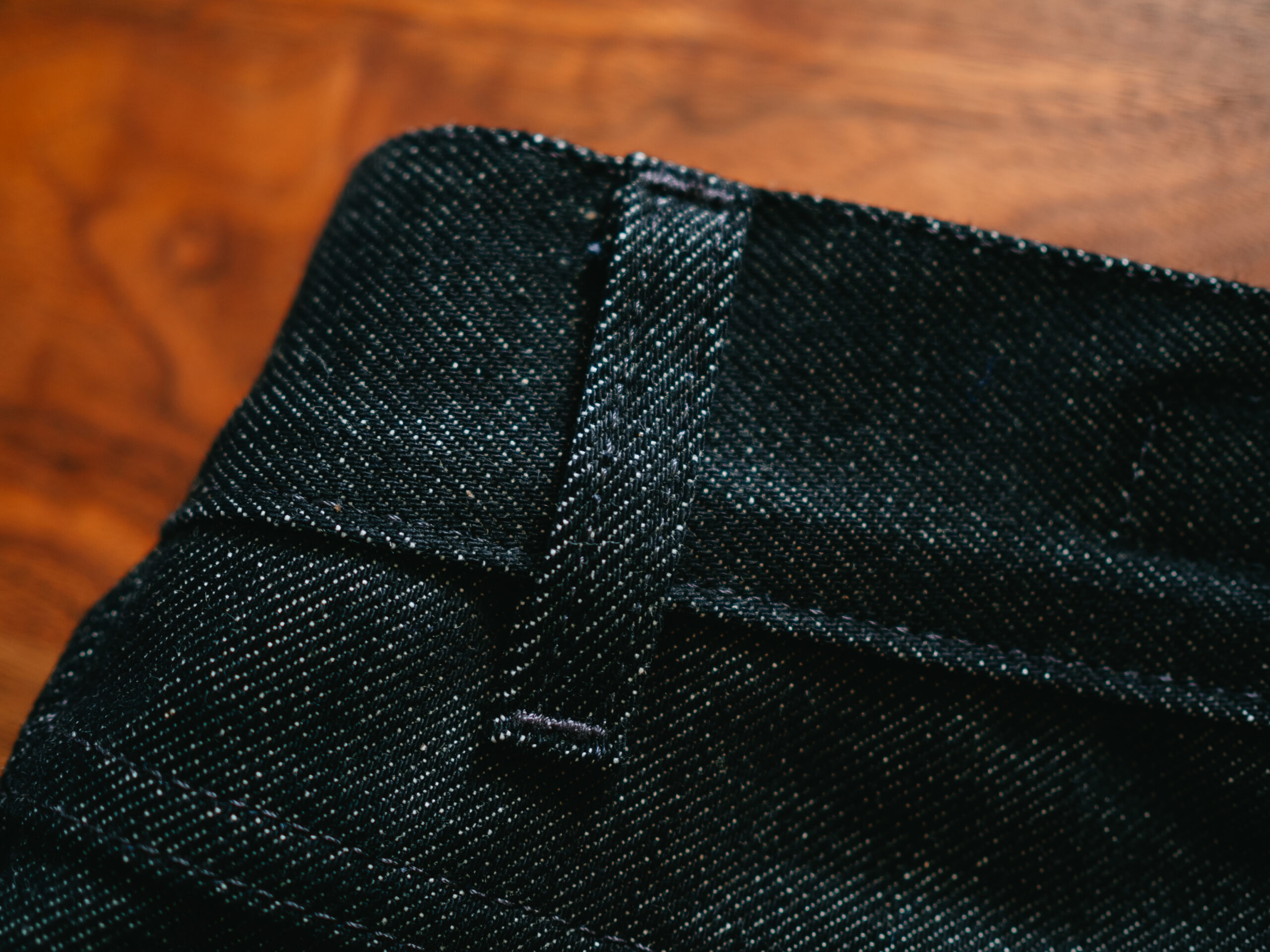 私が購入したのは縦糸黒×横糸生成りのブラックデニム。インディゴ、ブラック、ホワイトのカラー展開もありますが、個人的には真っ黒でも青でもない濃いインディゴのような深い色合いのこのカラーがドンピシャの好みでした。