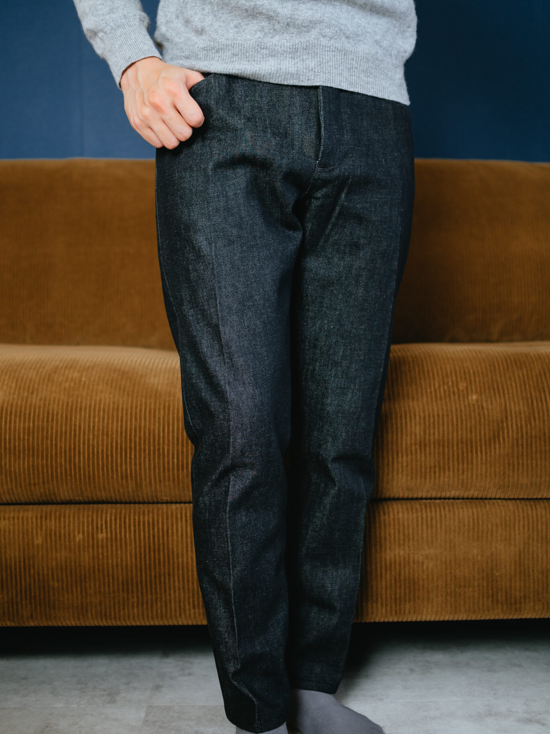 表側はハリコシがありしっかりデニム感がありますが、中は程よく柔らかく、着用していて硬さやゴワゴワ感は感じません。センタークリースを入れて綺麗に着たいアイテム。ロールアップしてスニーカーやローファーと合わせても良さそうです。