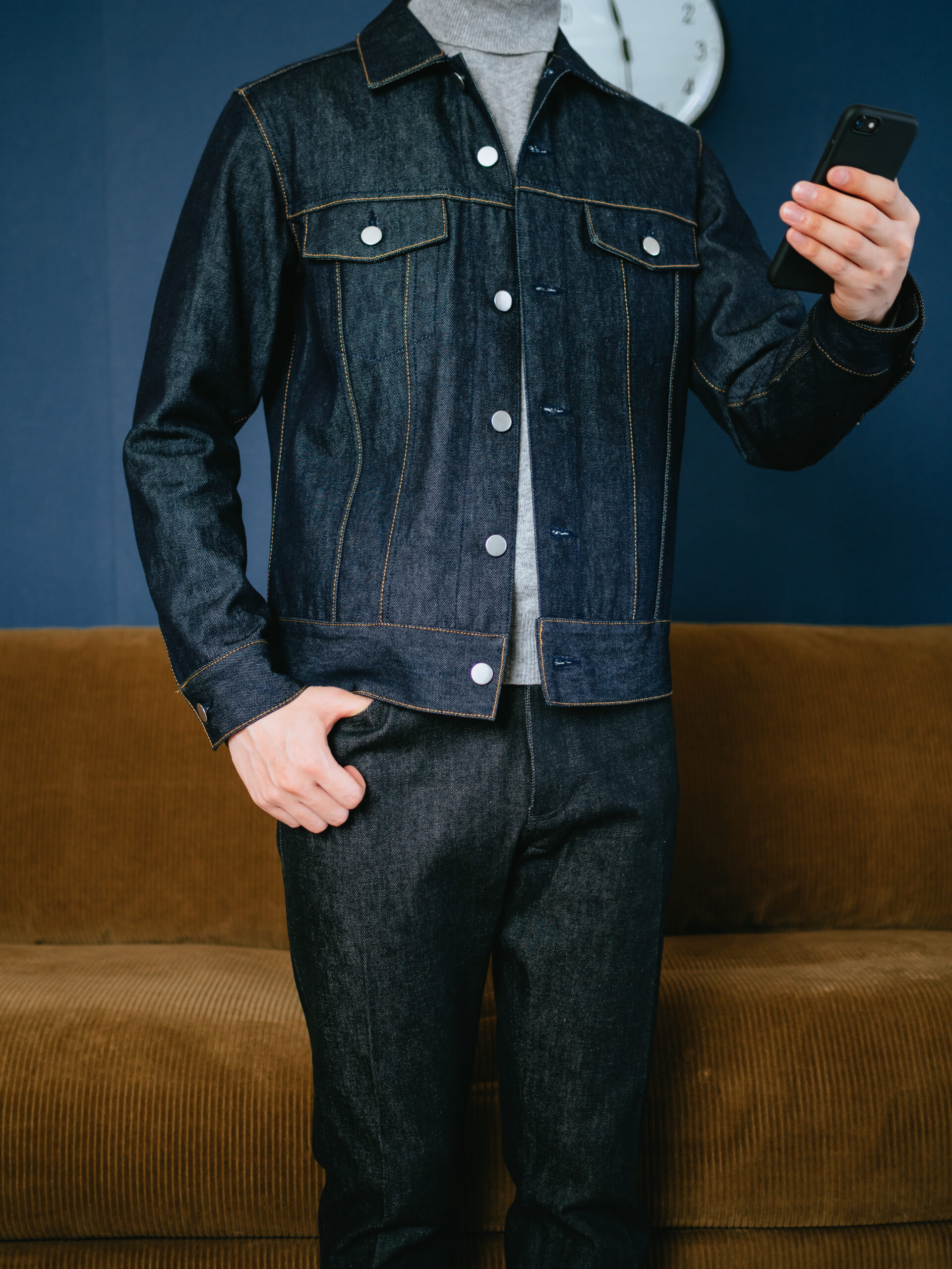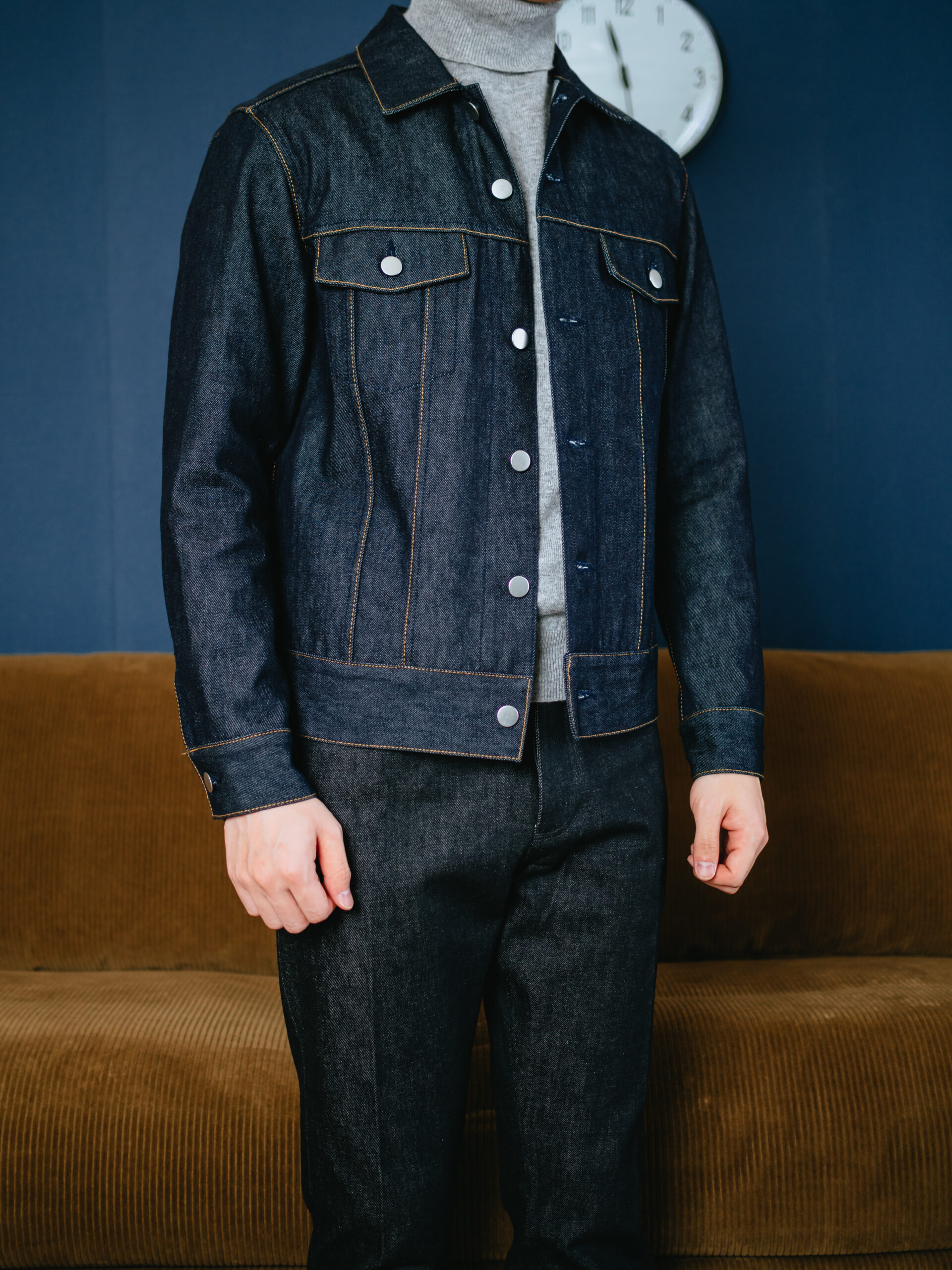 Jeanik(ジーニック)のデニムジャケットと合わせてデニムonデニムでコーディネートしてみました。意図せずロゴ無しのメタルボタンのディテールが共通していて相性が良いです。