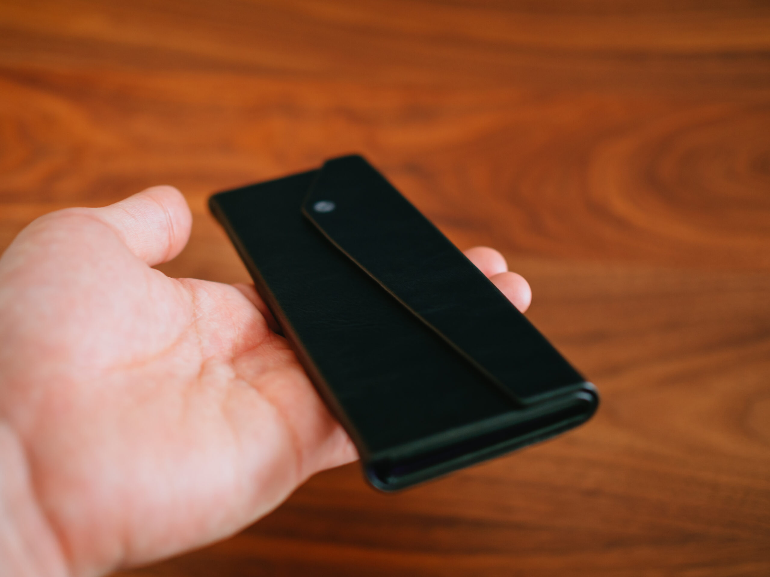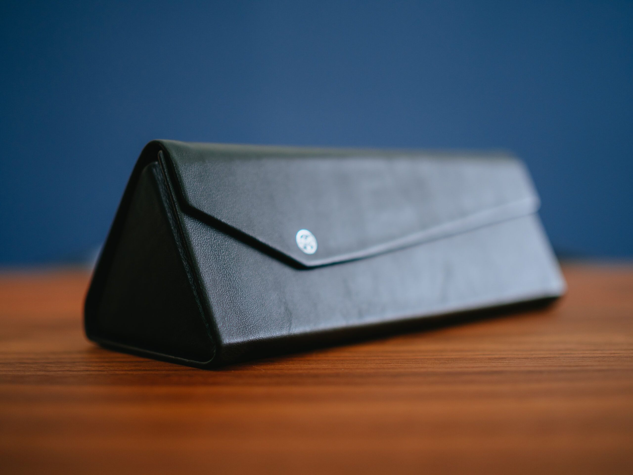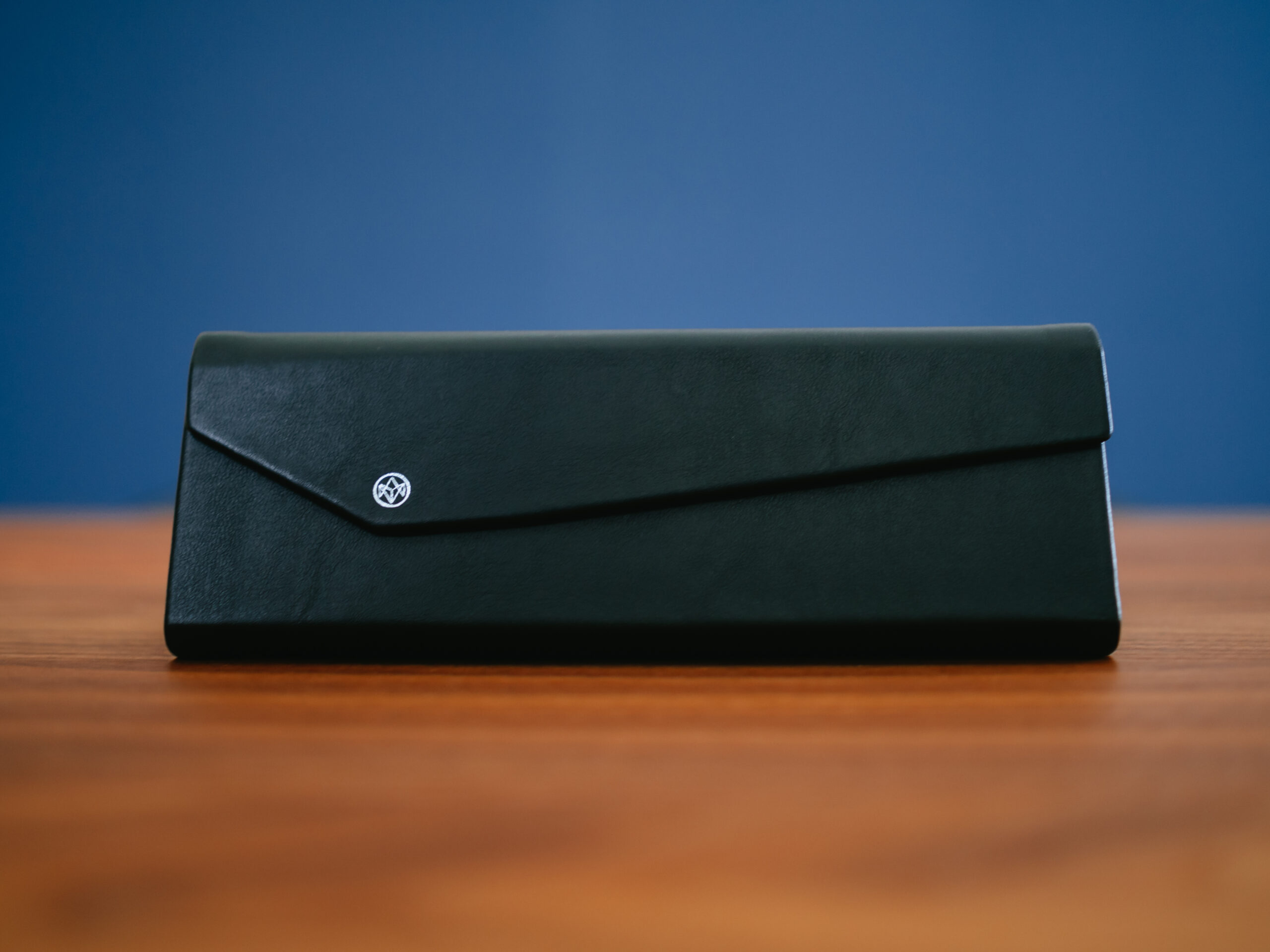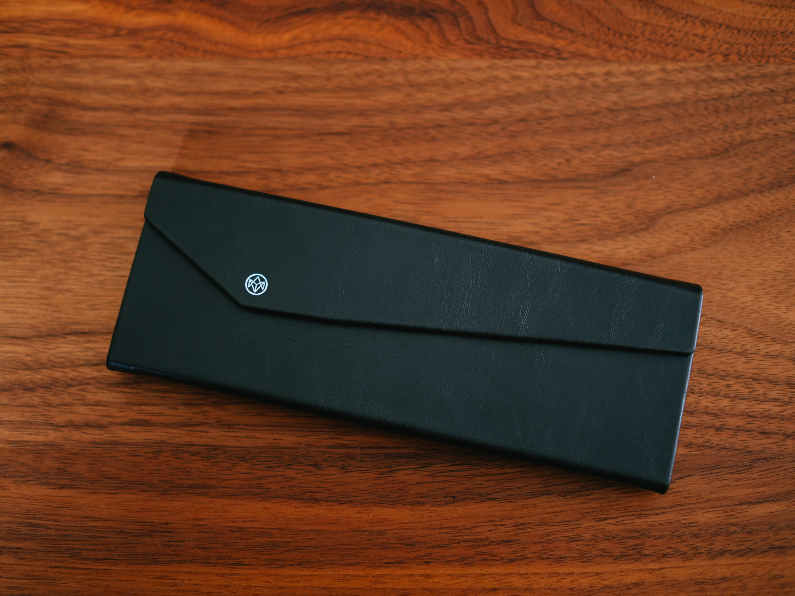 レザー感のある素材にブランドロゴマークが刻印されています。ケースは折りたたみが可能です。