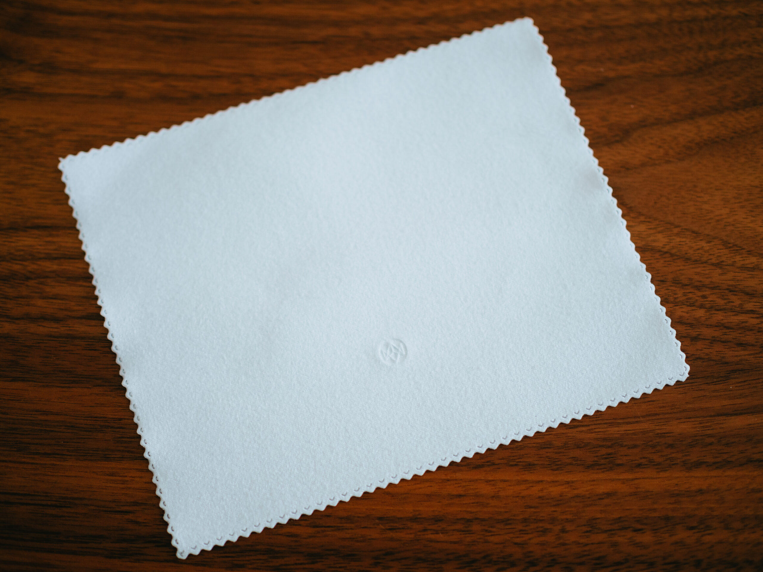 付属の眼鏡ケースと眼鏡拭き。ブランドカラーの紫にシンプルなロゴが映えます。眼鏡拭きはセーム革のような質感です。
