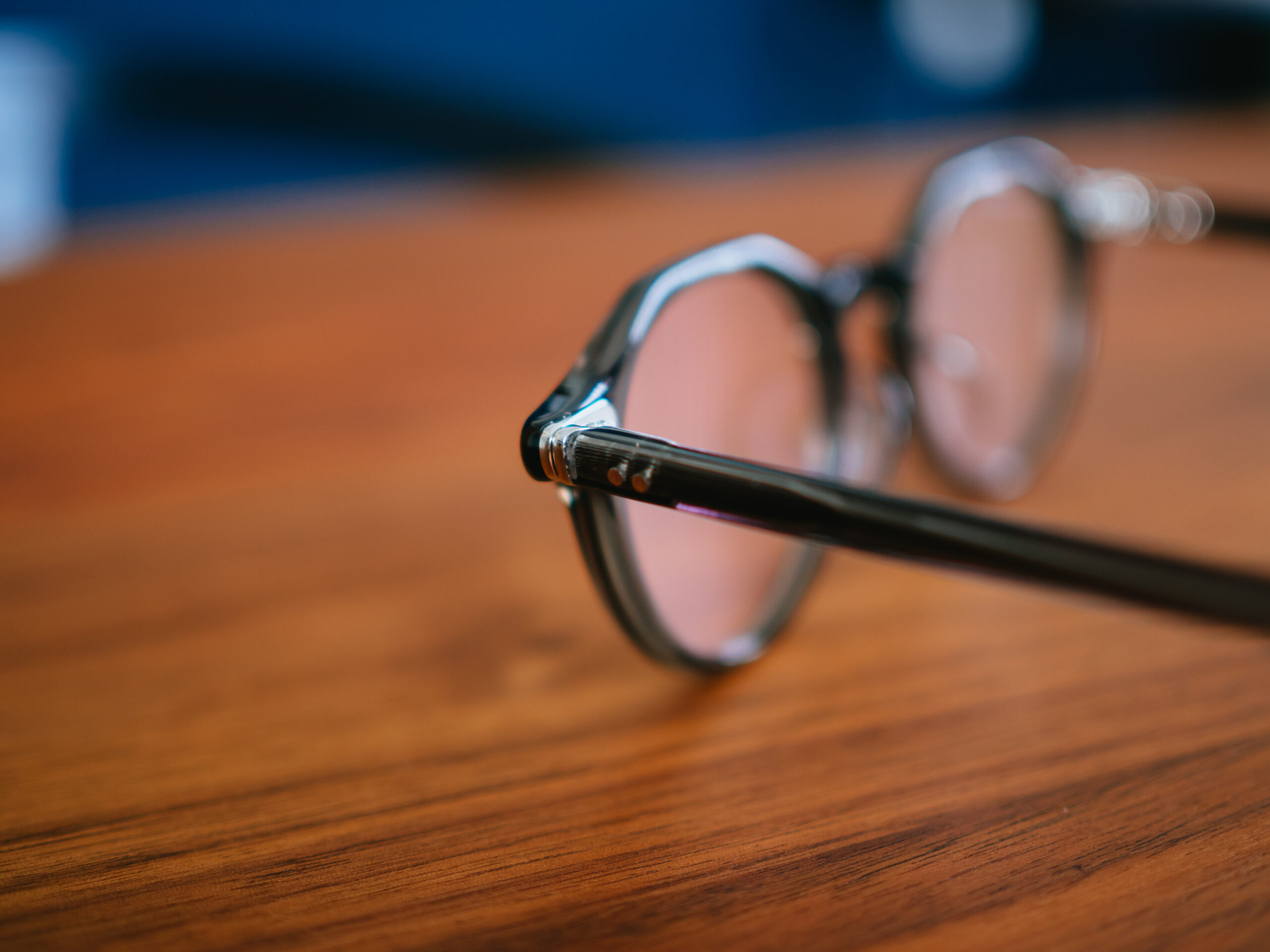 通常カラーは金具部分がゴールドですが、こちらの別注カラーモデルはグレーと相性の良いシルバーの金具で統一されています。智と丁番部分にフロントとテンプルから2ピンのカシメ鋲が埋め込まれています。