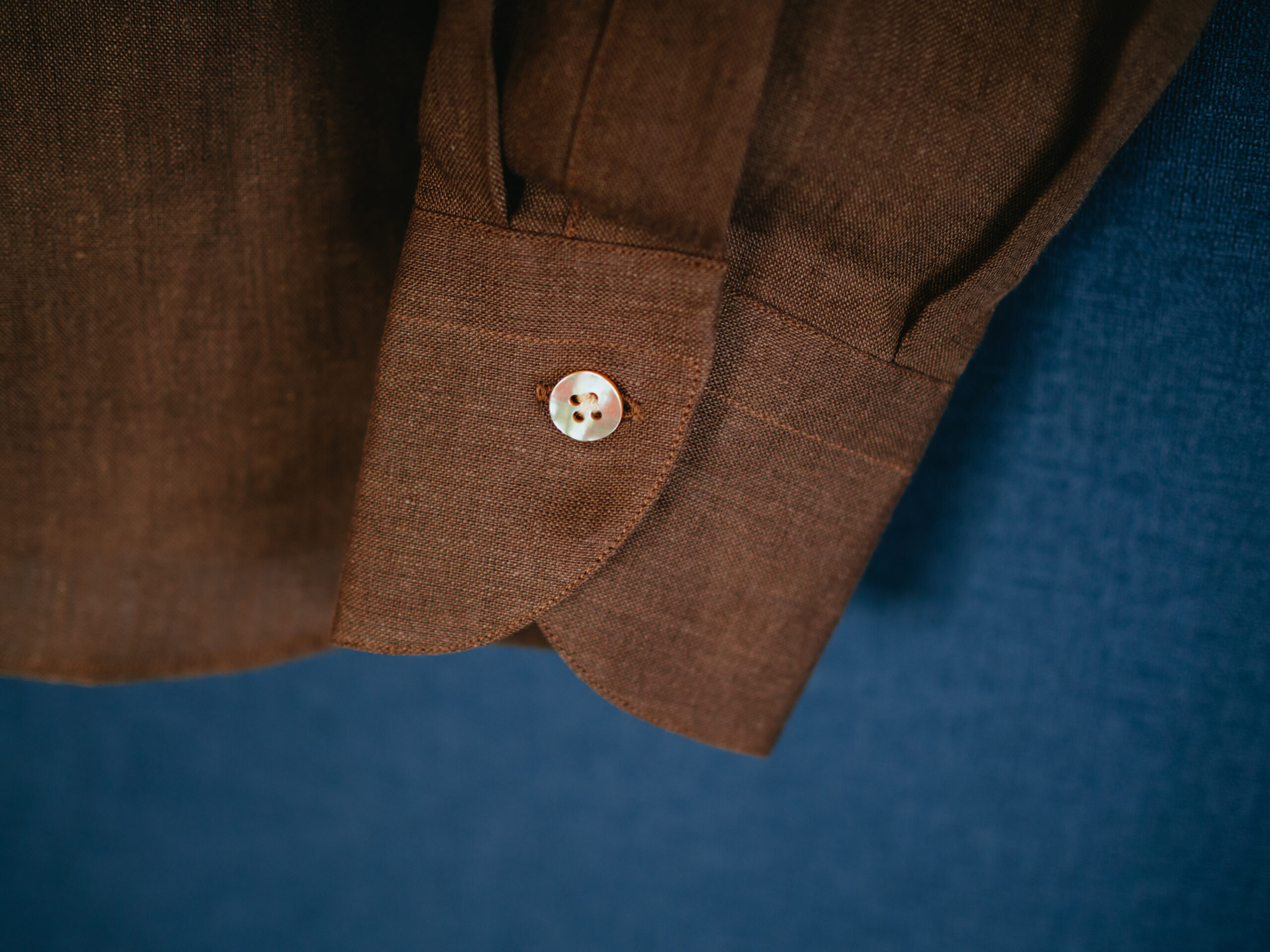 第2ボタンまで開けることを前提に第1ボタンからの距離が短めになっています。普段は第2ボタンを開けない派ですが、このシャツはリネンの素材感と襟のロール感のおかげで第2ボタンまで開けて着たほうが格好良いです。