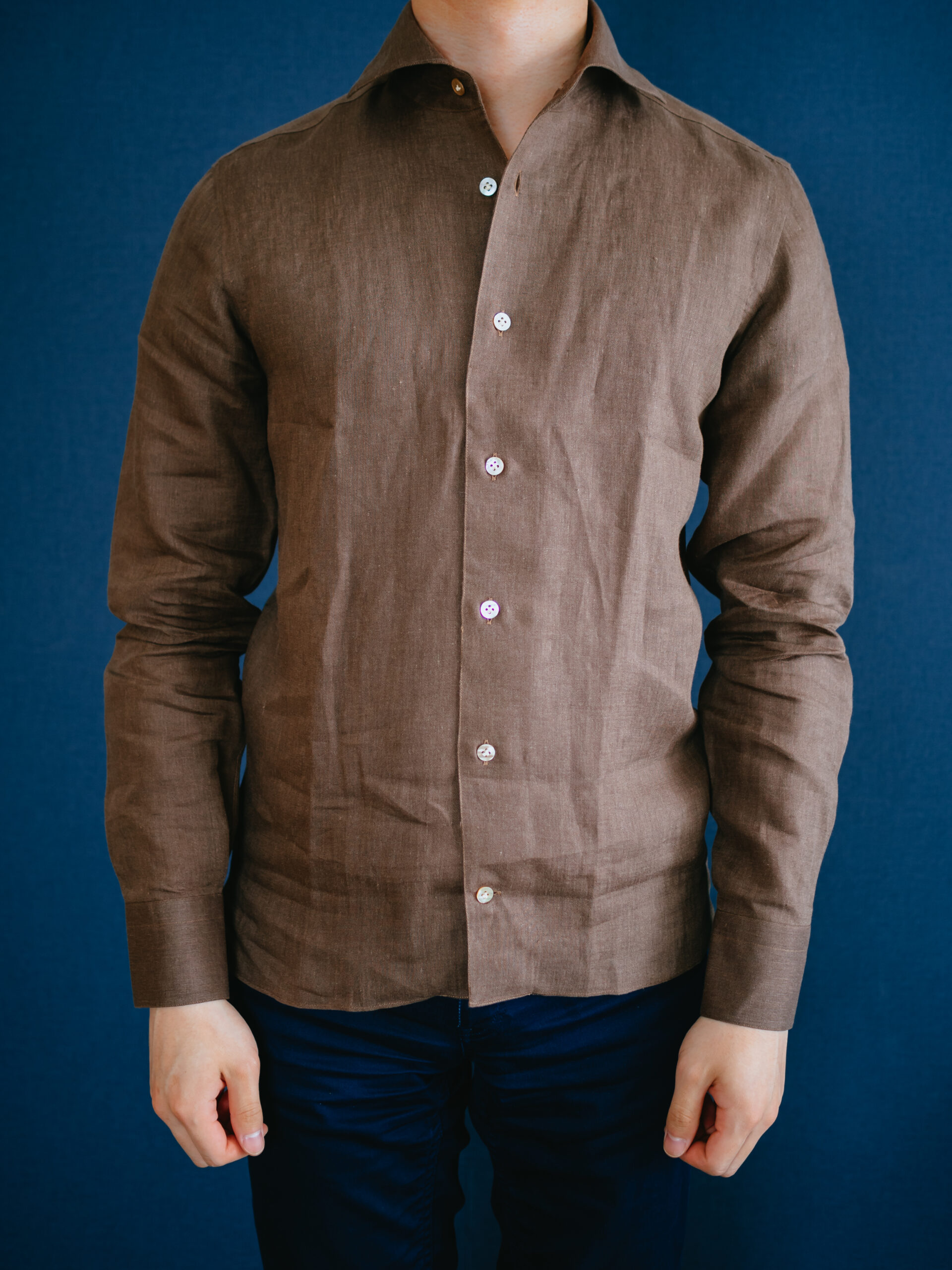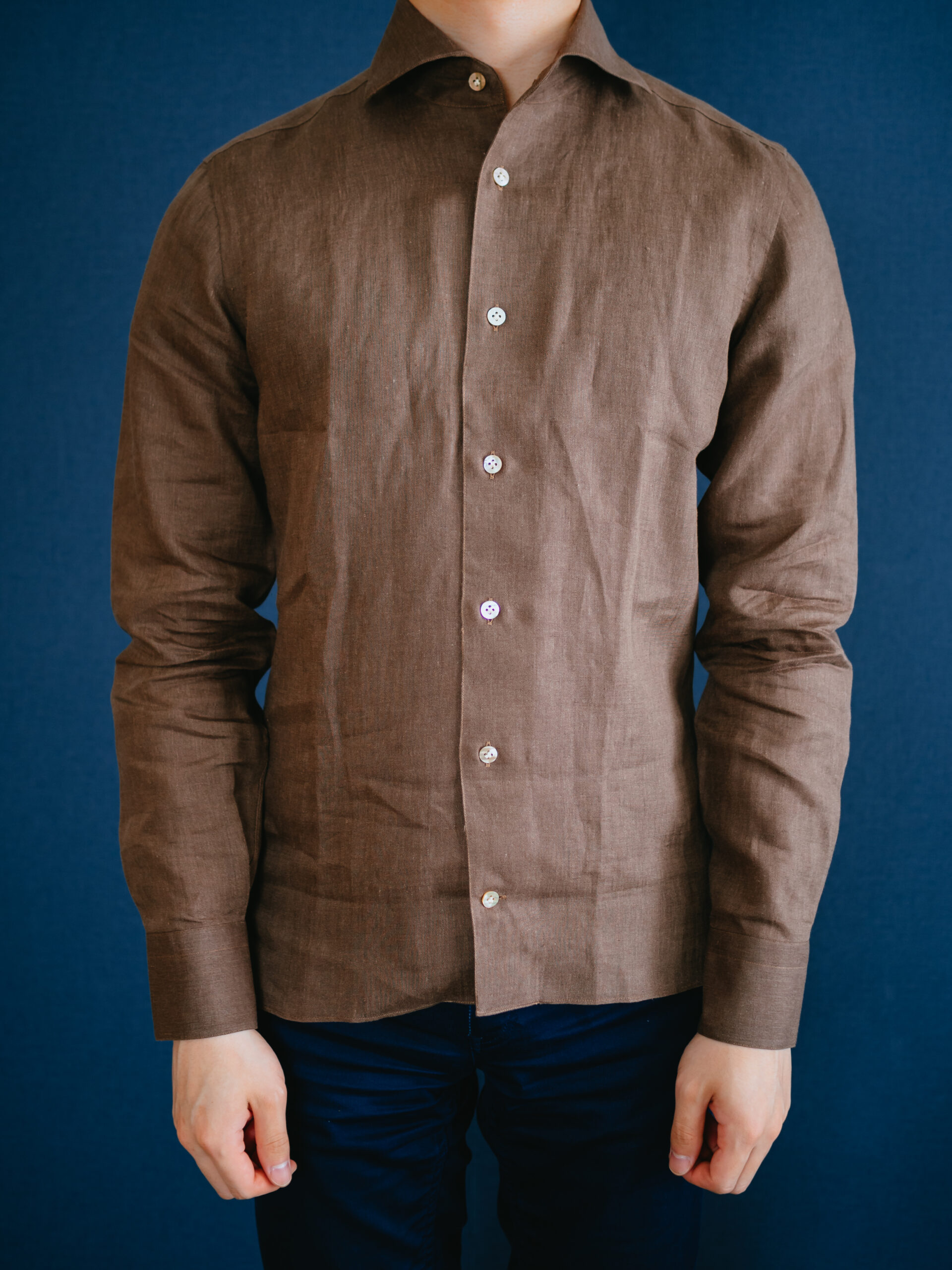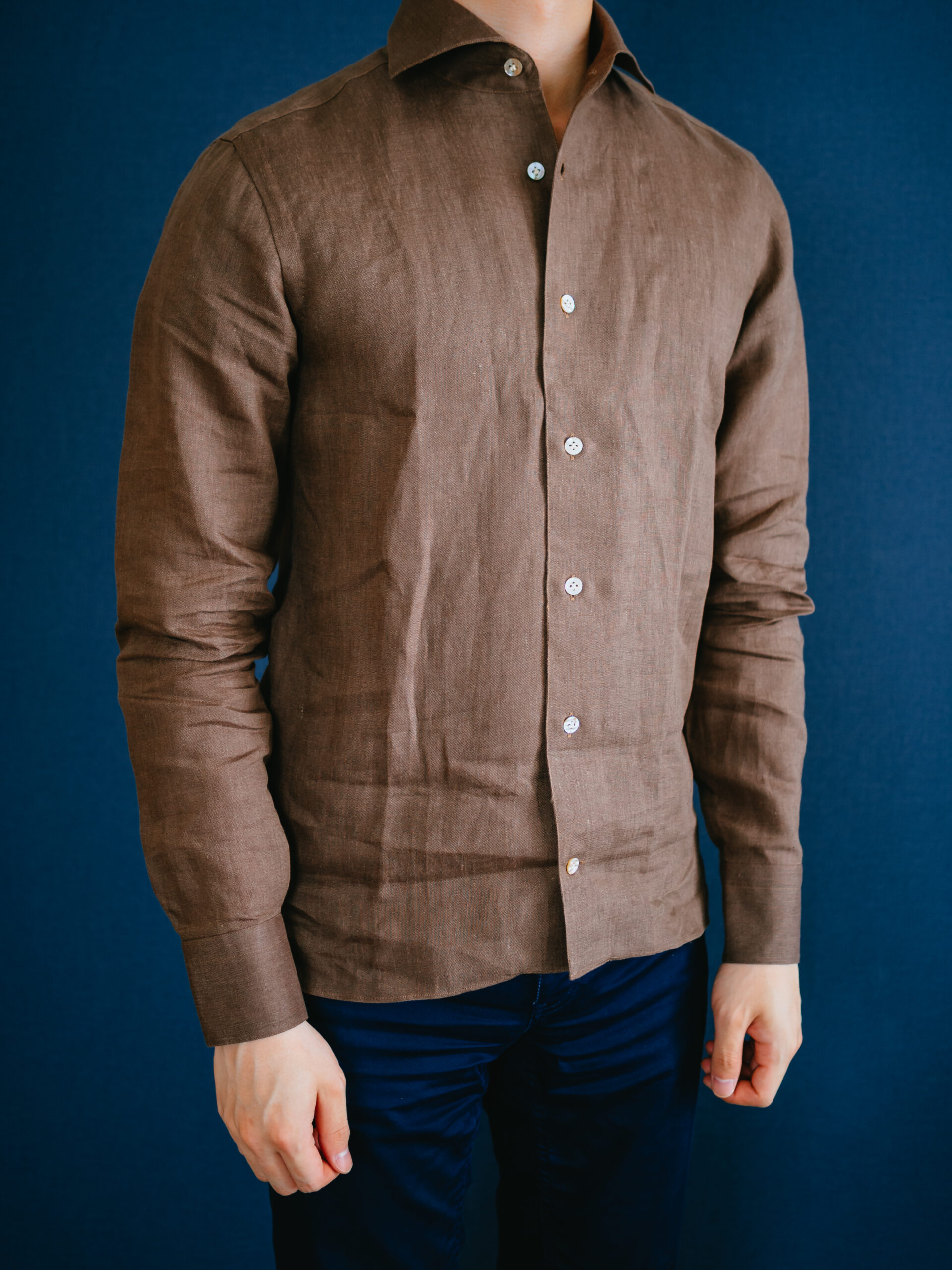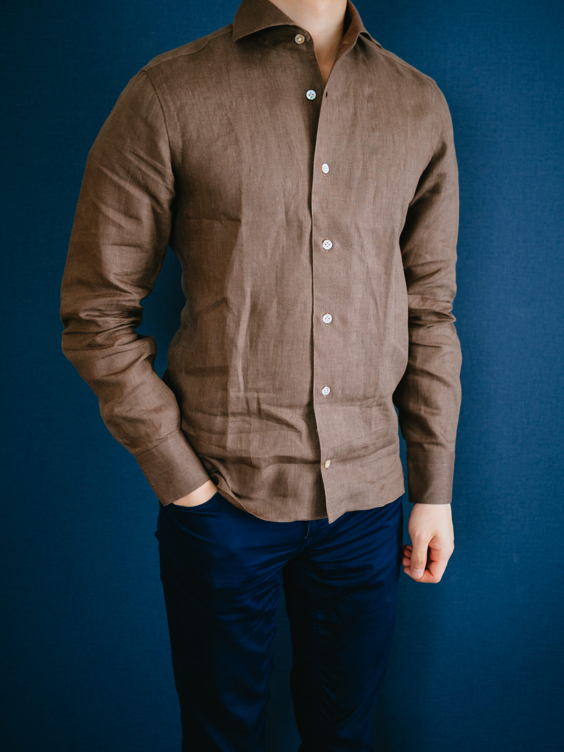 茶系のシャツを初めて購入しましたが、大人の色気があって気に入りました。3着もリネンシャツを購入してお腹一杯になったので、あとは何度も着て柔らかい風合いに育っていくのを楽しみたいと思います。