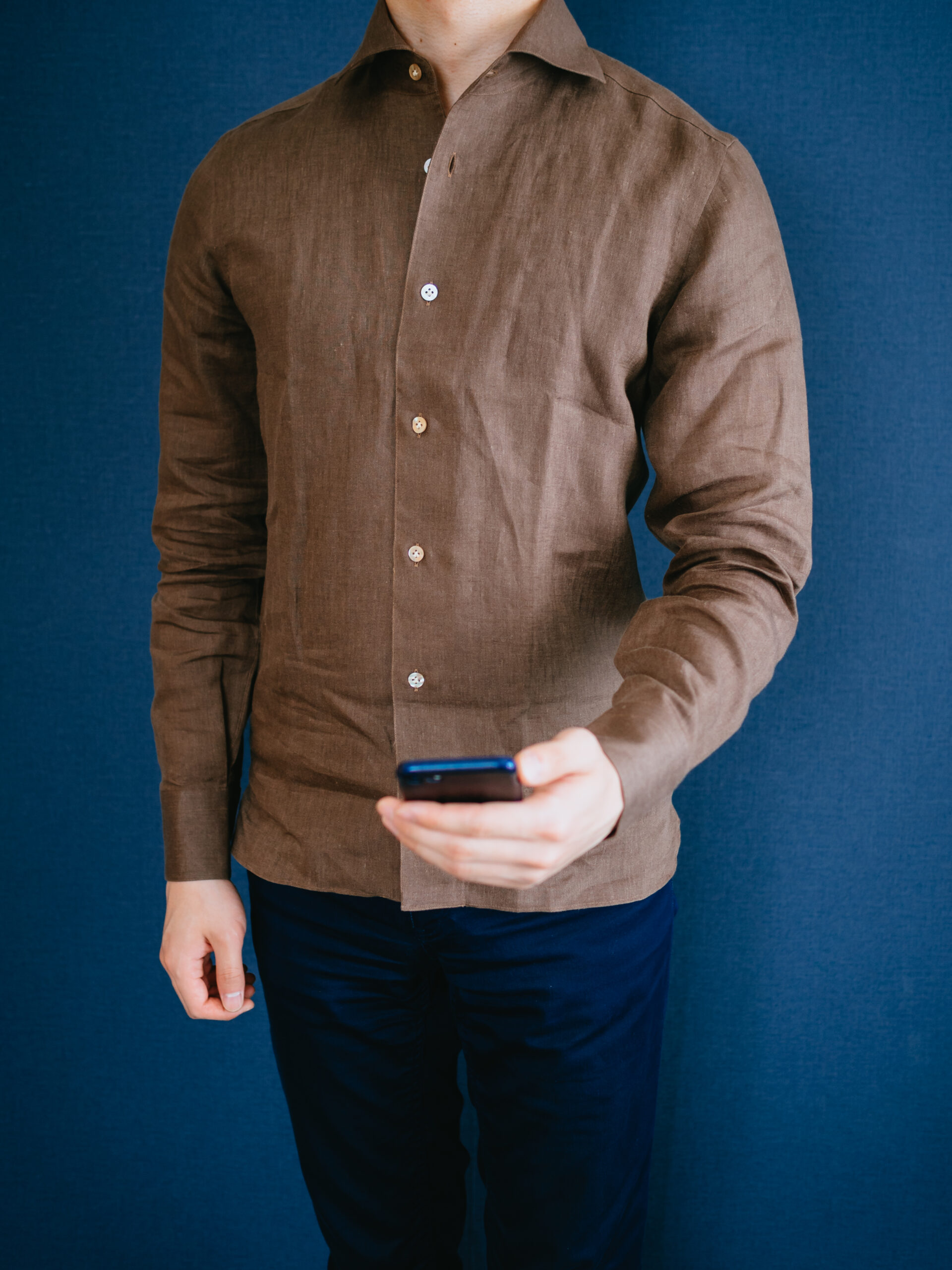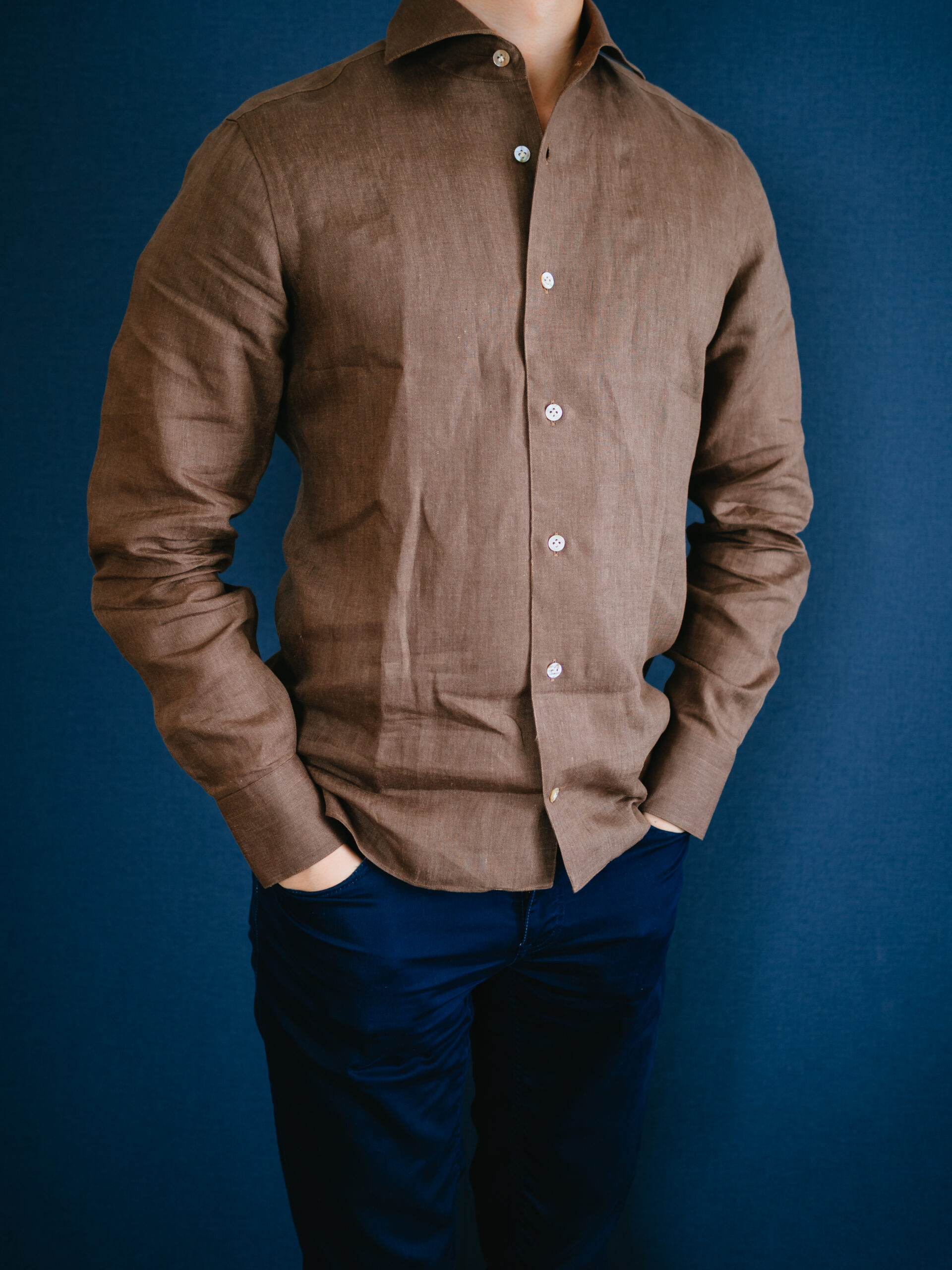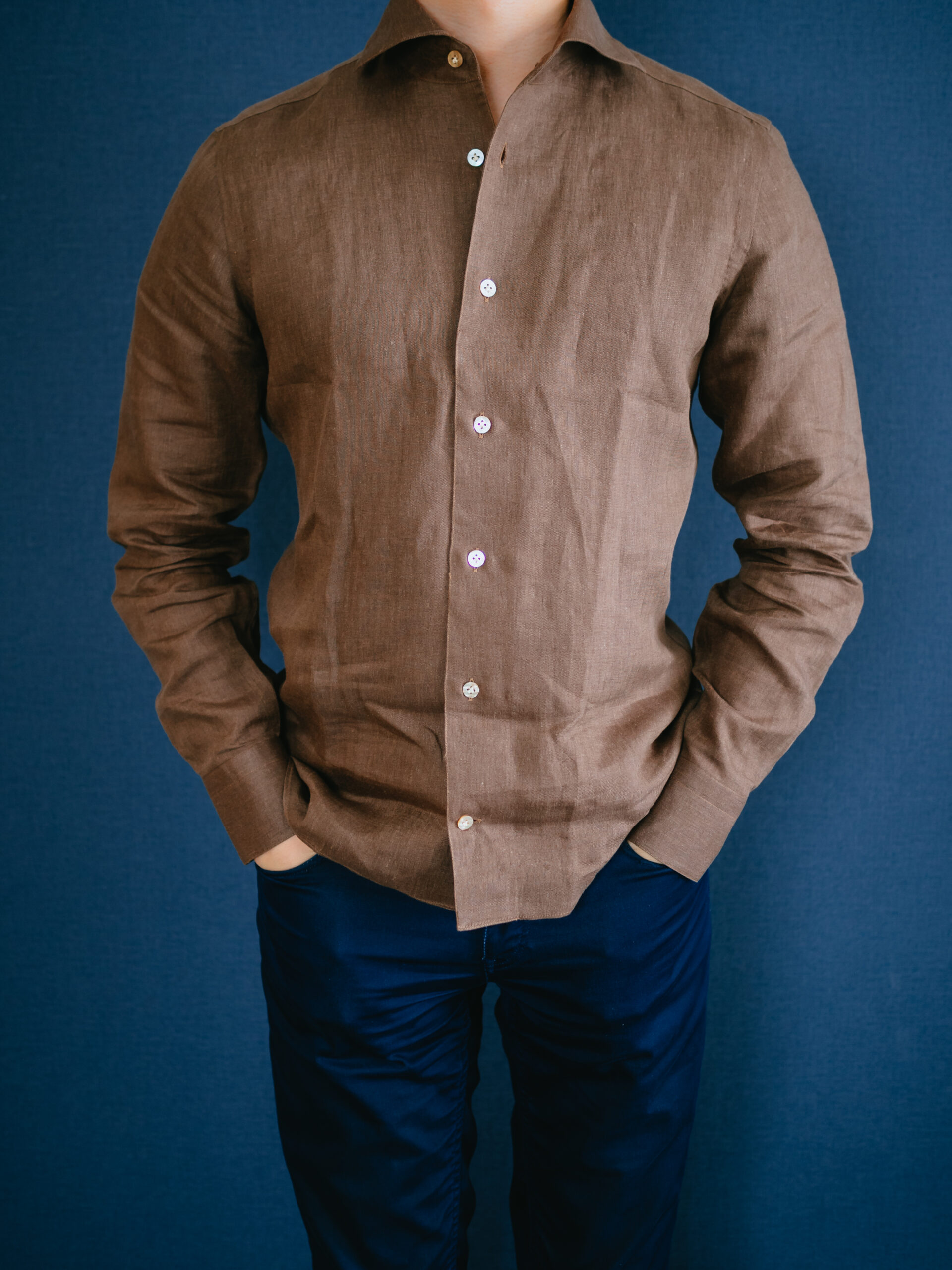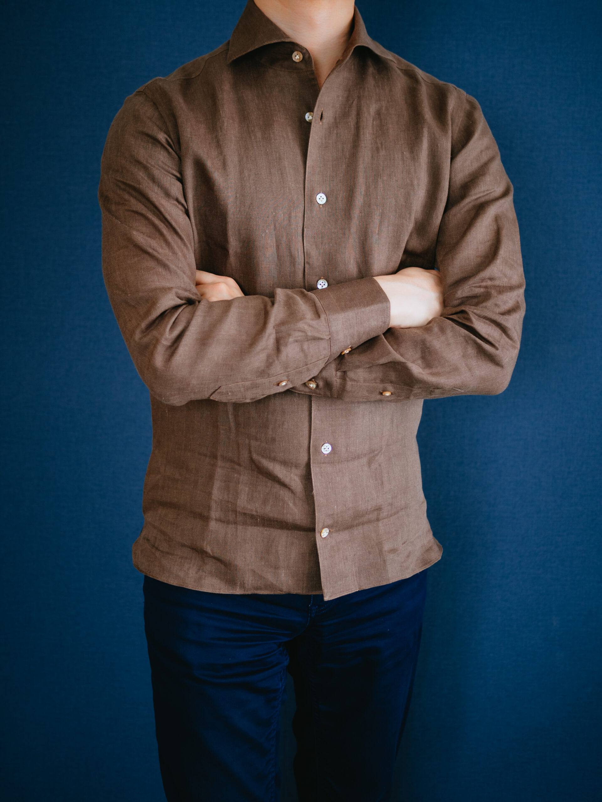 茶系のシャツを初めて購入しましたが、大人の色気があって気に入りました。3着もリネンシャツを購入してお腹一杯になったので、あとは何度も着て柔らかい風合いに育っていくのを楽しみたいと思います。
