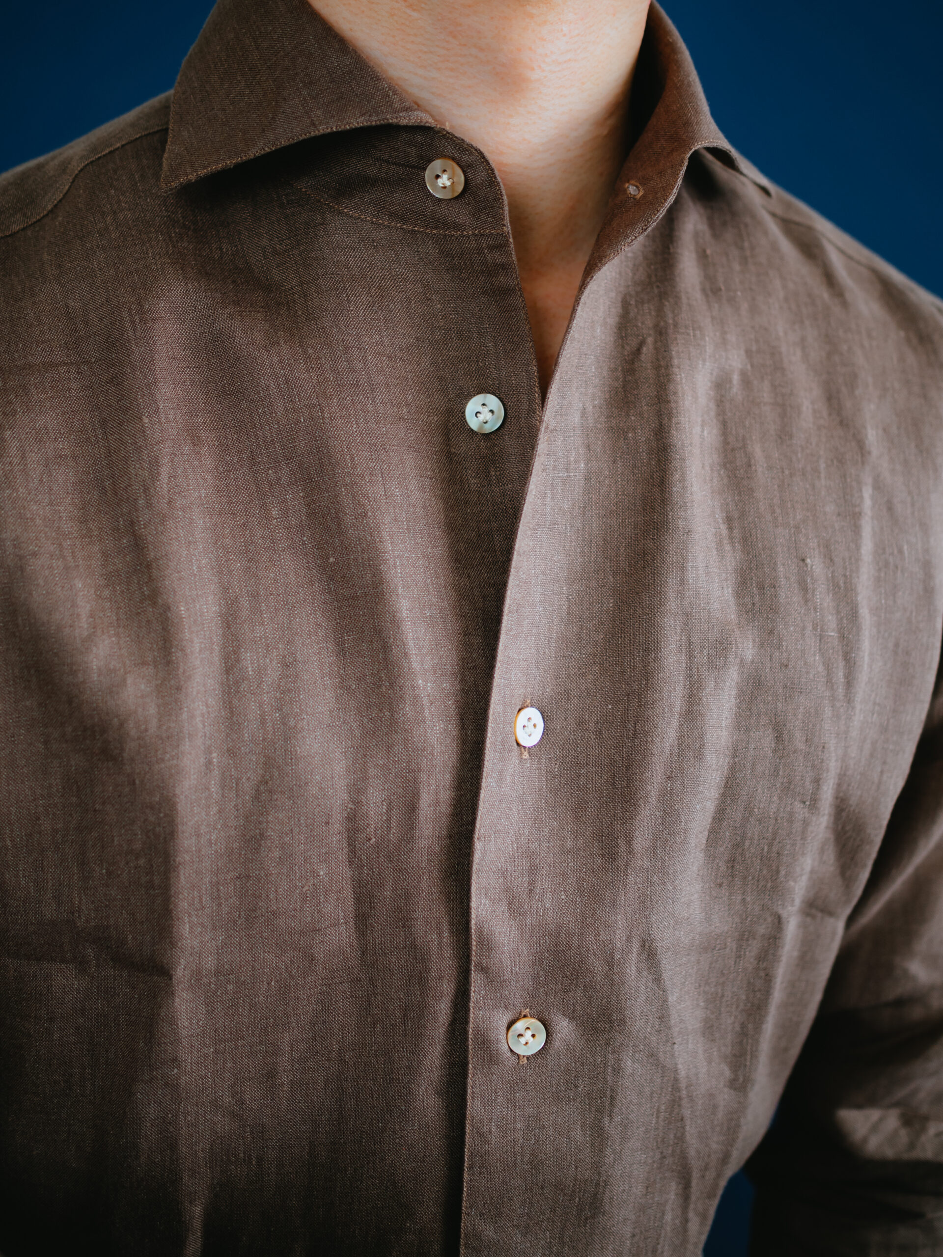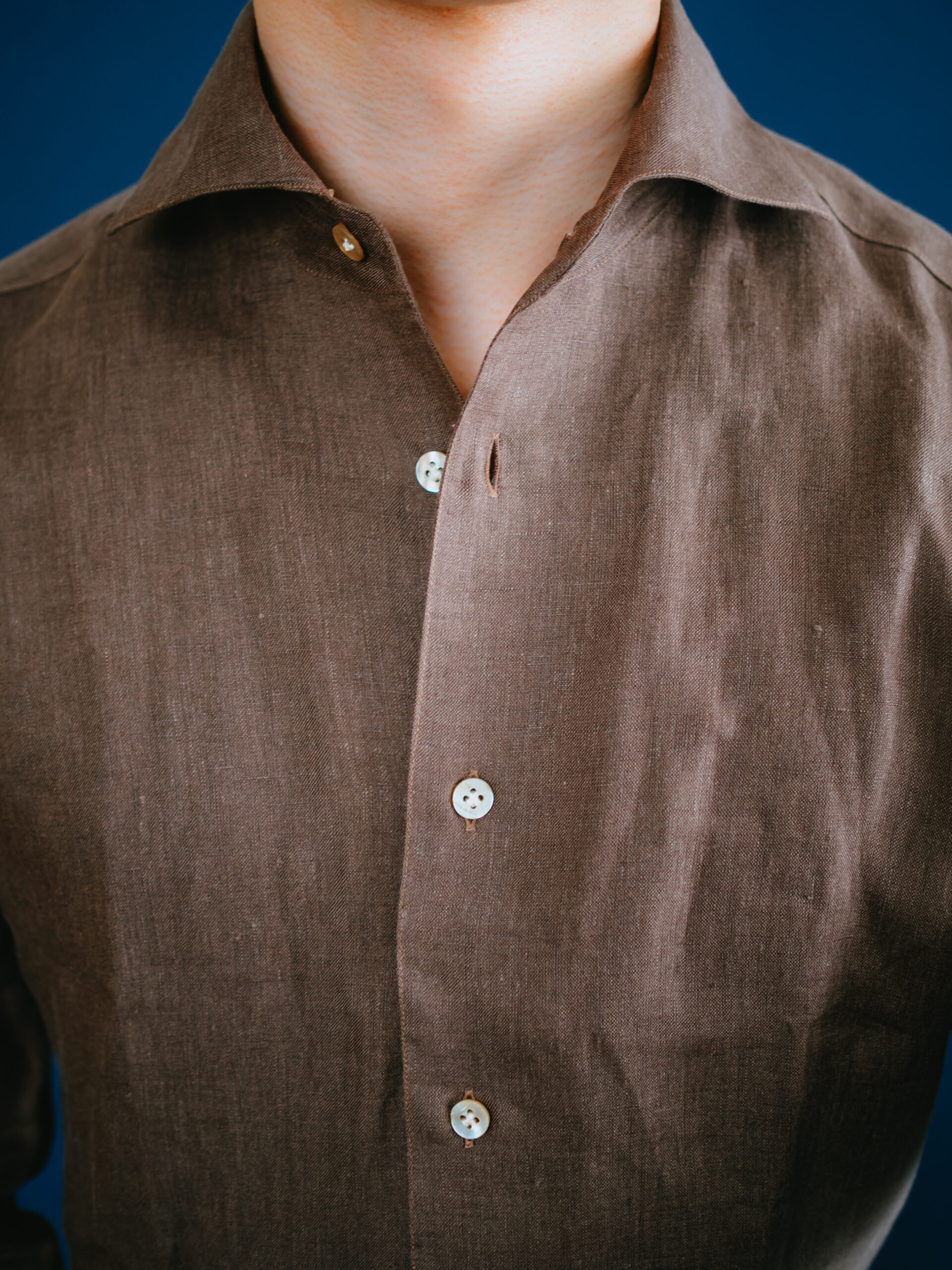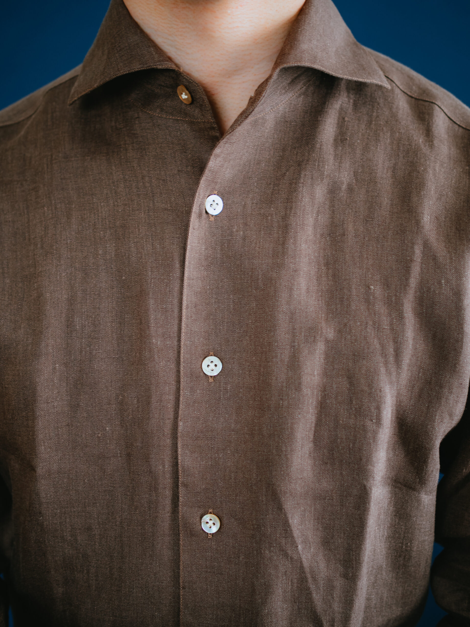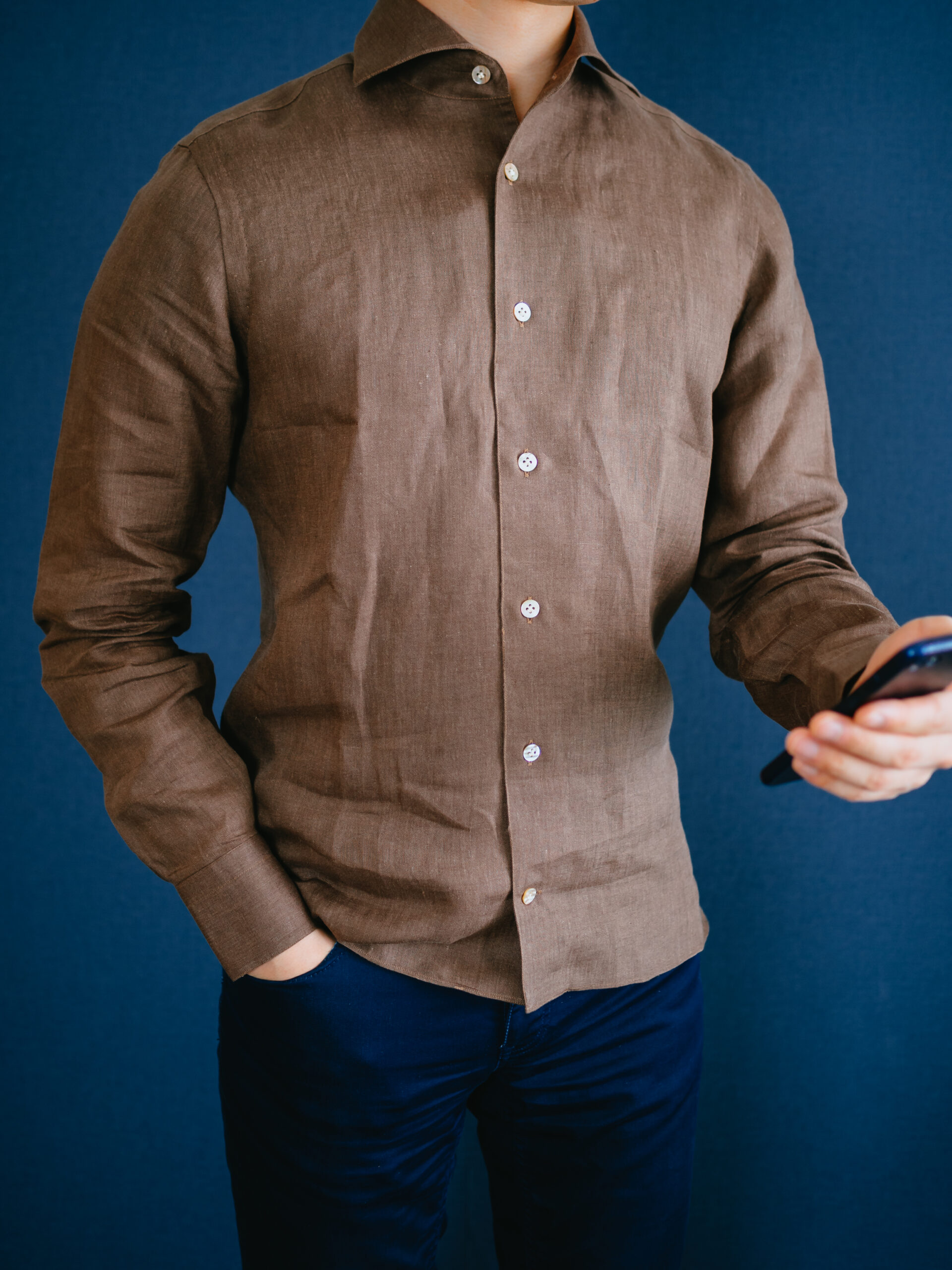 茶系のシャツを初めて購入しましたが、大人の色気があって気に入りました。3着もリネンシャツを購入してお腹一杯になったので、あとは何度も着て柔らかい風合いに育っていくのを楽しみたいと思います。