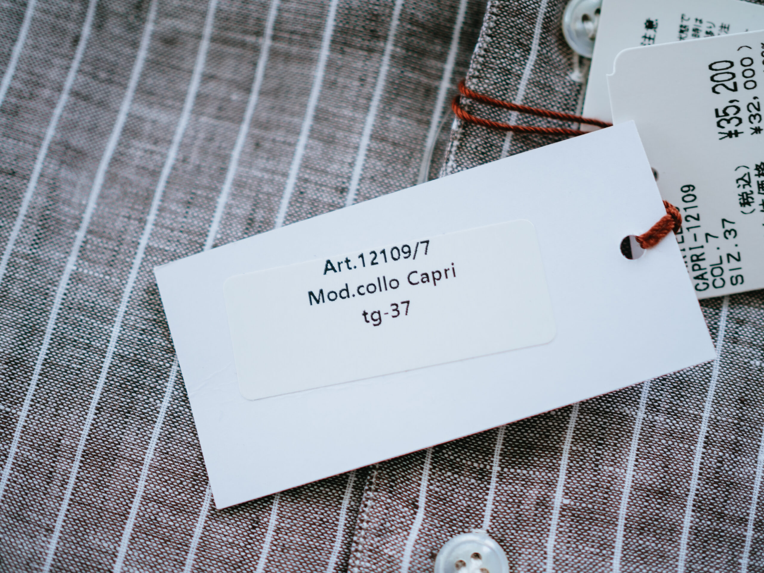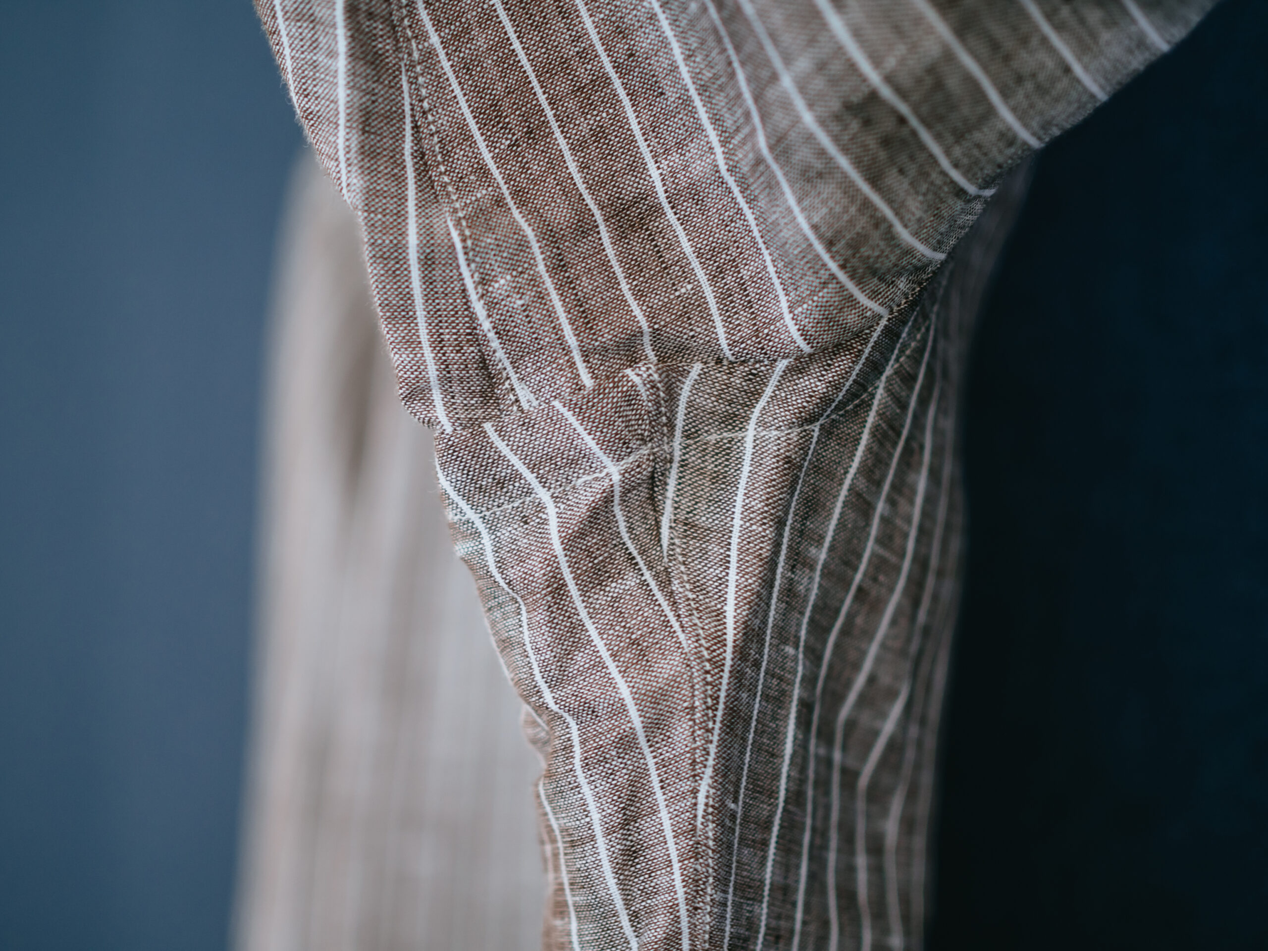 襟型はワンピースカラーの「capri」。前立てから襟にかけて1枚の生地(one piece)で仕立てられているため、ボタンを開けて着用すると襟のロール(襟から前立て部分の開き)が美しく、首元・胸元の色気を演出してくれます。