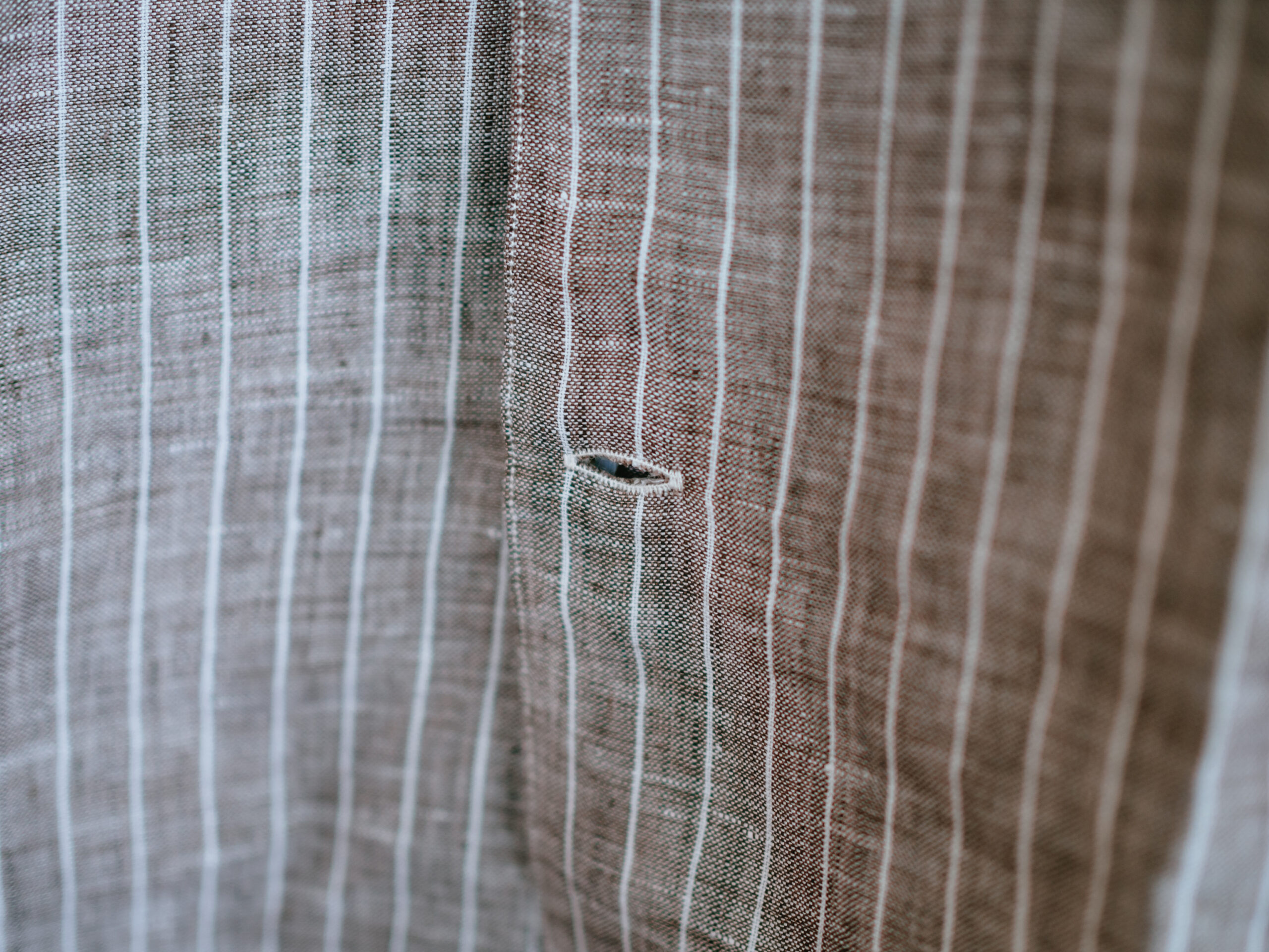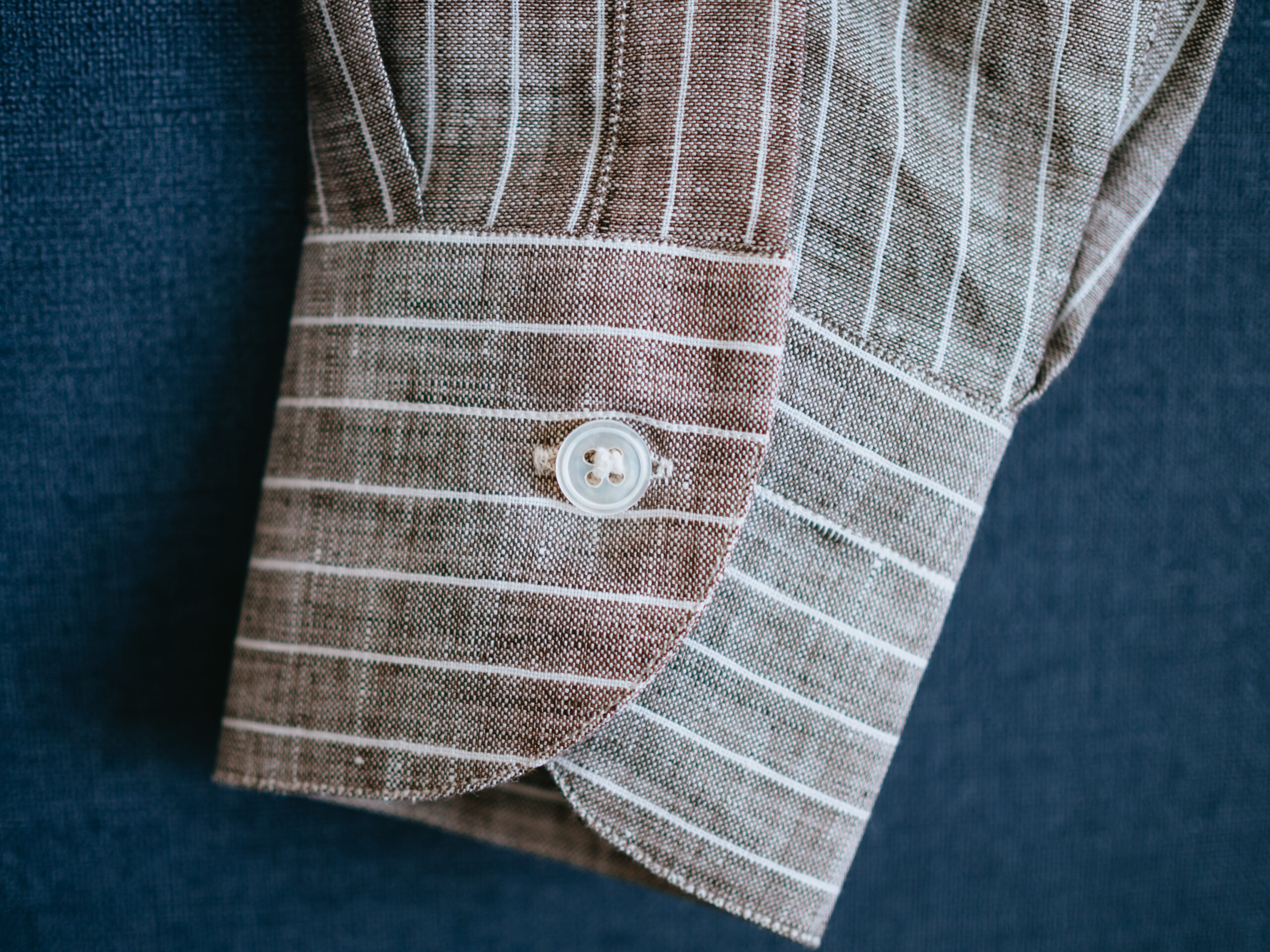 第2ボタンまで開けることを前提に第1ボタンからの距離が短めになっています。普段は第2ボタンを開けない派ですが、このシャツはリネンの素材感と襟のロール感のおかげで第2ボタンまで開けて着たほうが格好良いです。