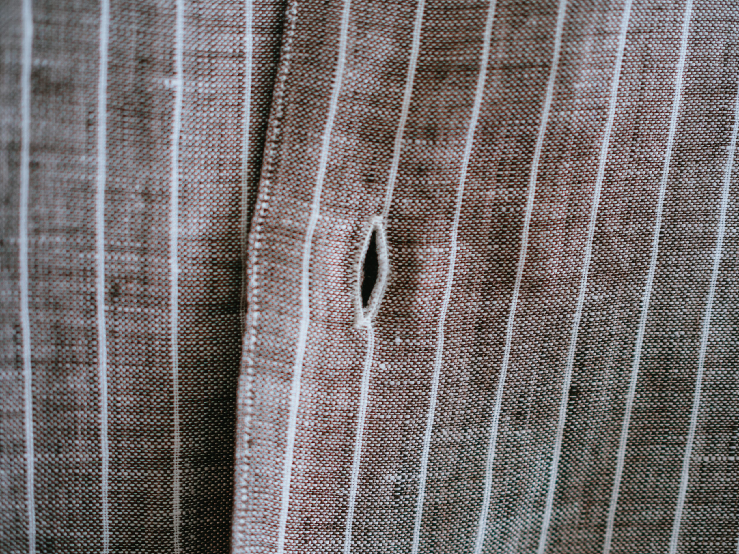 ボタンホールはミシン縫い。一番下のボタンホールは横向きにすることでシャツの左右の身ごろがズレるのを防ぎ、シャツをタックインしたときにボタンを外れにくくする意図もあります。