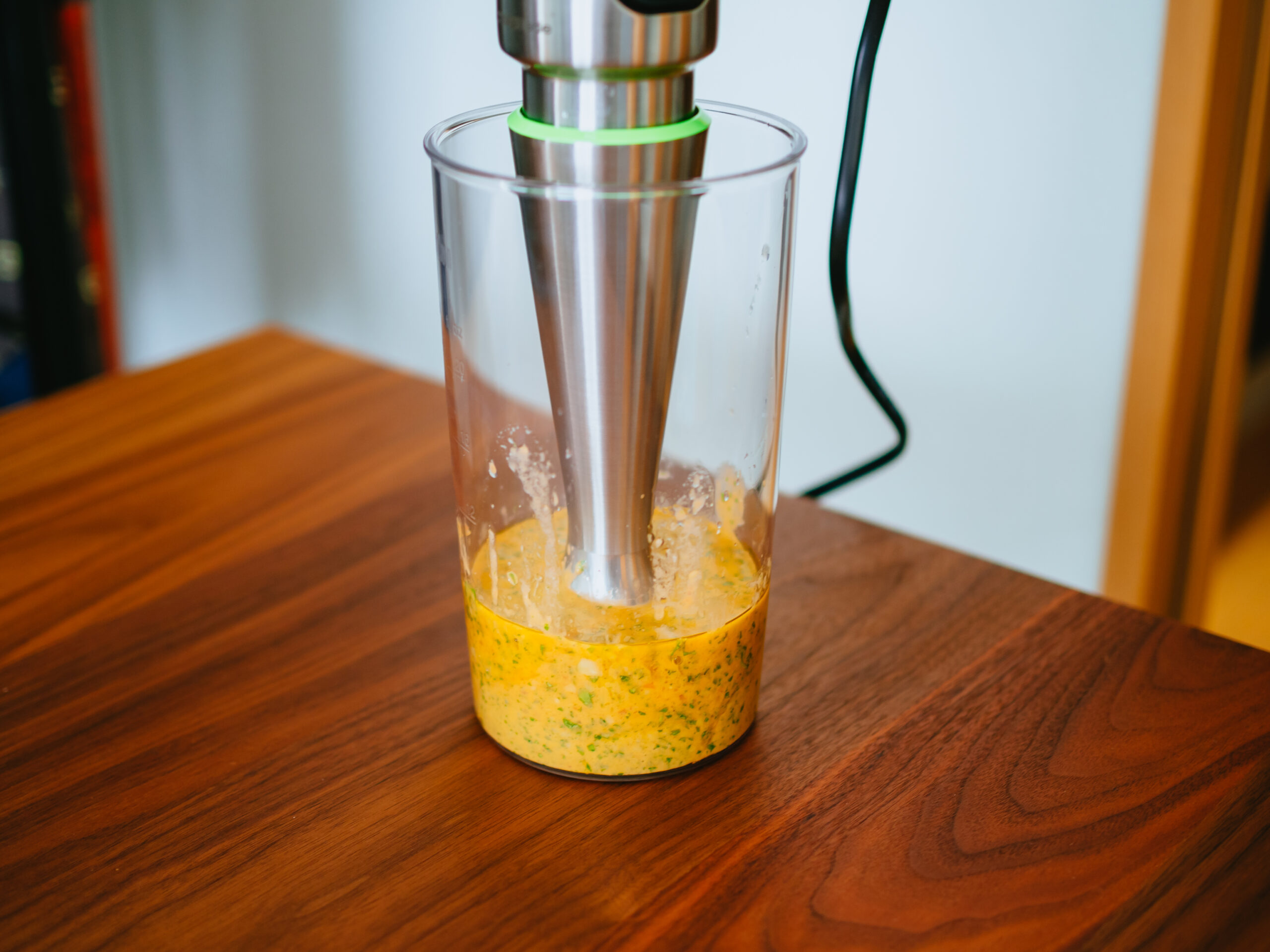 あとはコンセントを挿して上部のボタンを握るだけ。ボタンの握り具合によってスピードが変化し、スピードを自由に変えられます。400Wのパワフルモーターで回転力は申し分なし。軽く上下に動かすだけであっという間にパスタソースが出来上がりました。