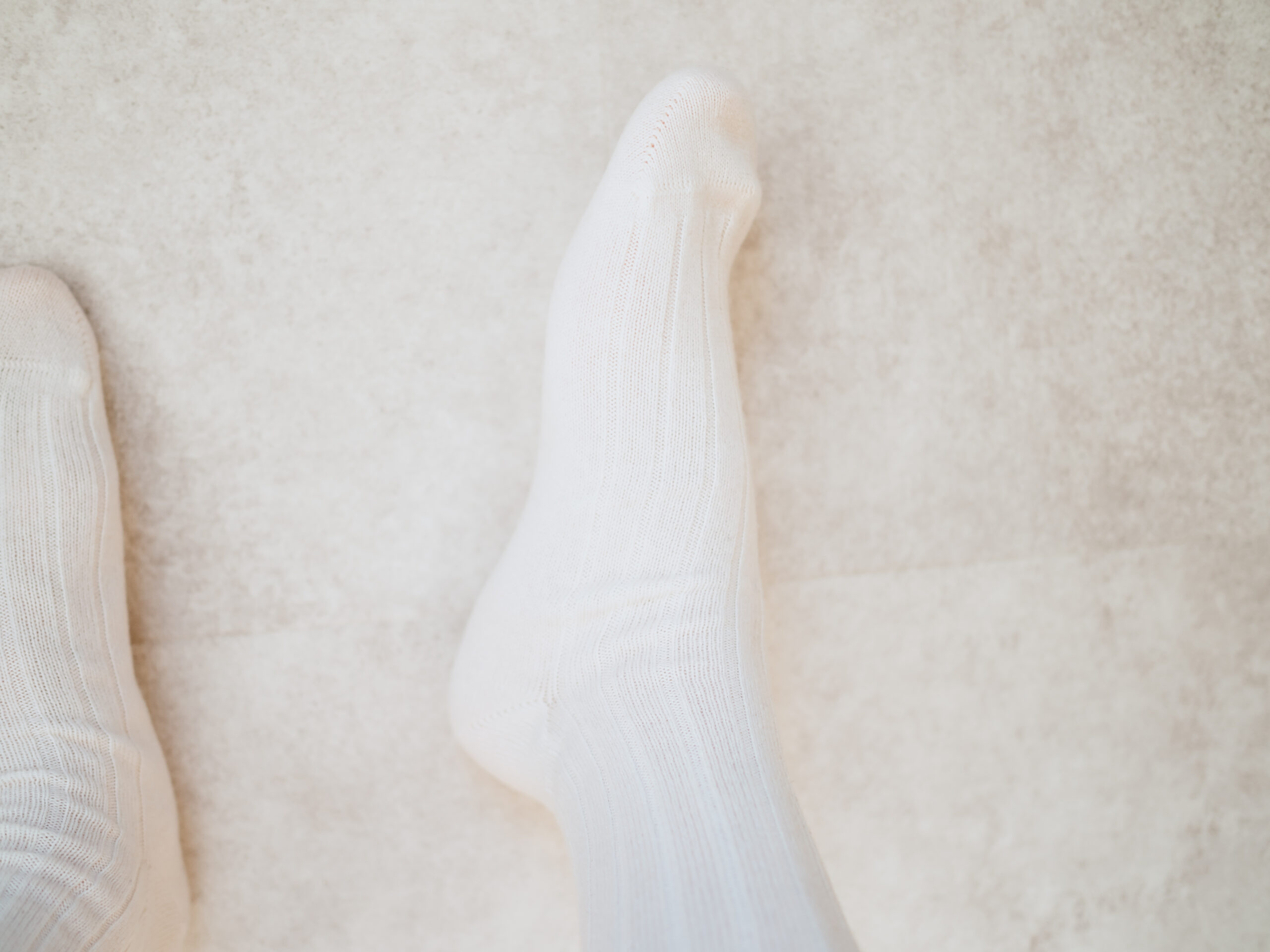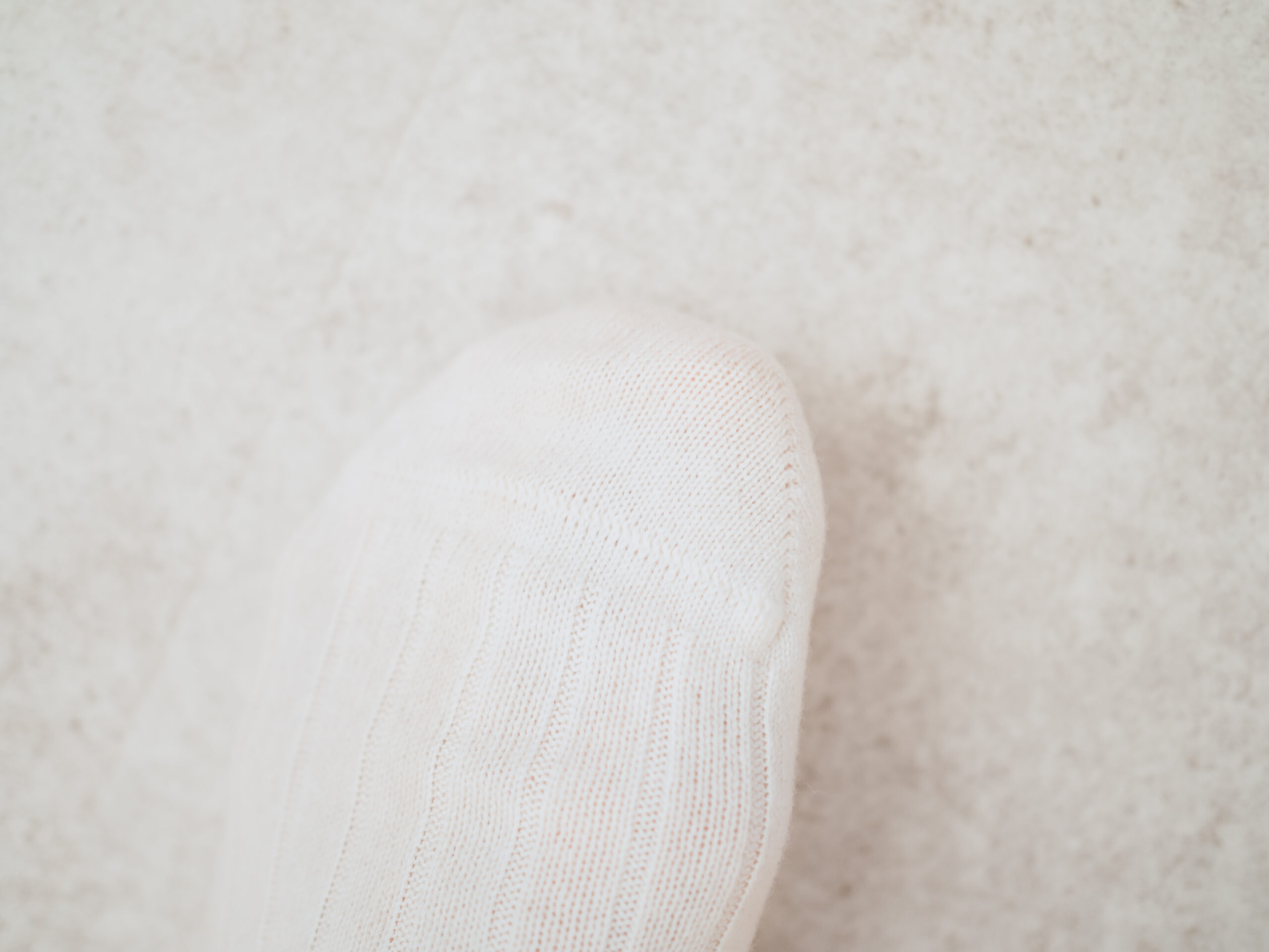 ウールはどうしても摩擦で毛羽立つので、コットンに比べると見た目の劣化は早いです。また、白色の靴下の運命ですが、足裏に付いたゴミや埃は目立ちます。