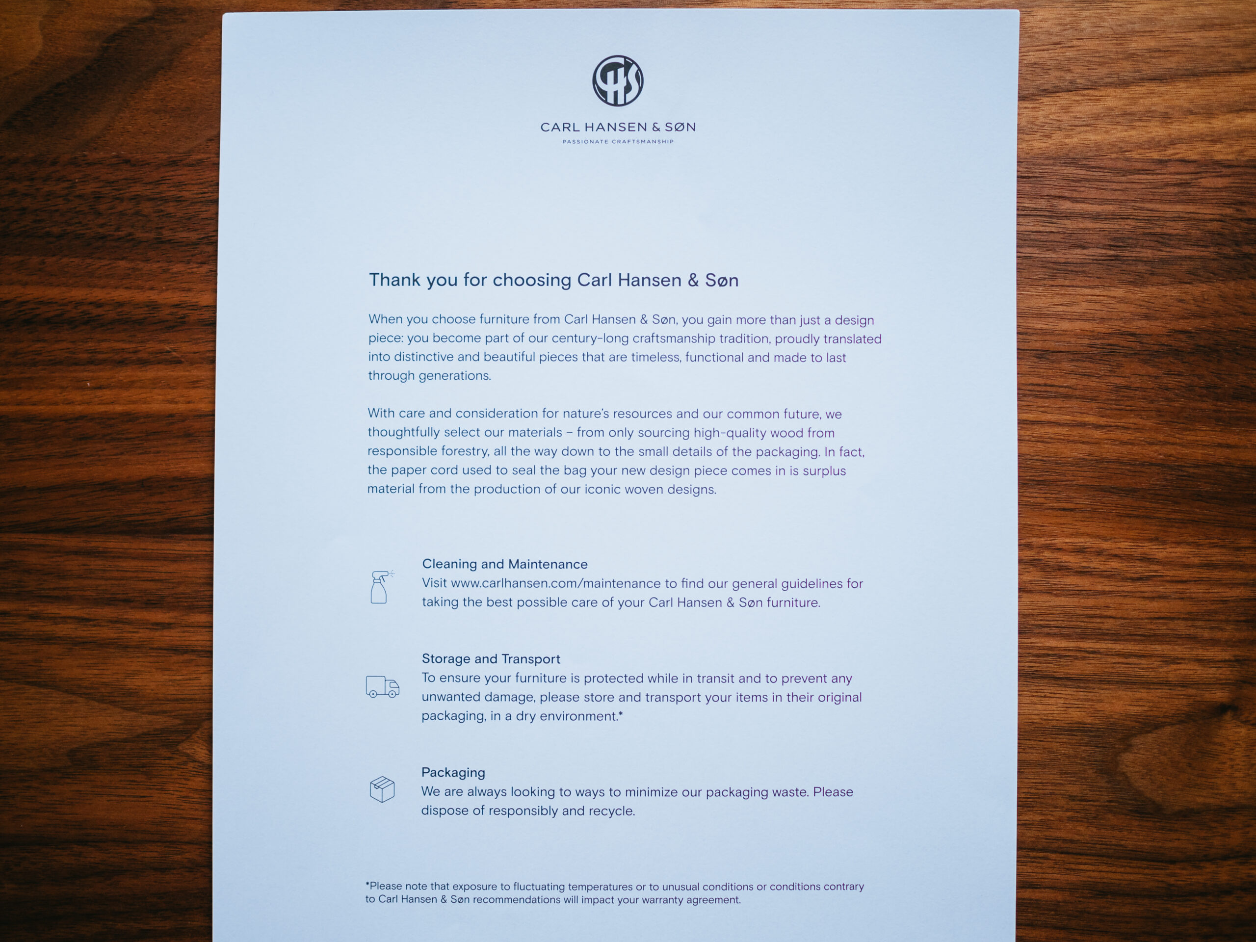 カールハンセン&サンの家具は、納品日から最長5年間の保証が付いています(ペーパーコード、塗装及び樹脂部品は1年)。ユーザーが定期的に行うメンテナンスの方法も公式HPでレクチャーしており、修理に関しても有償で受けてくれます。ペーパーコードは10〜20年で張り替えが推奨されています。