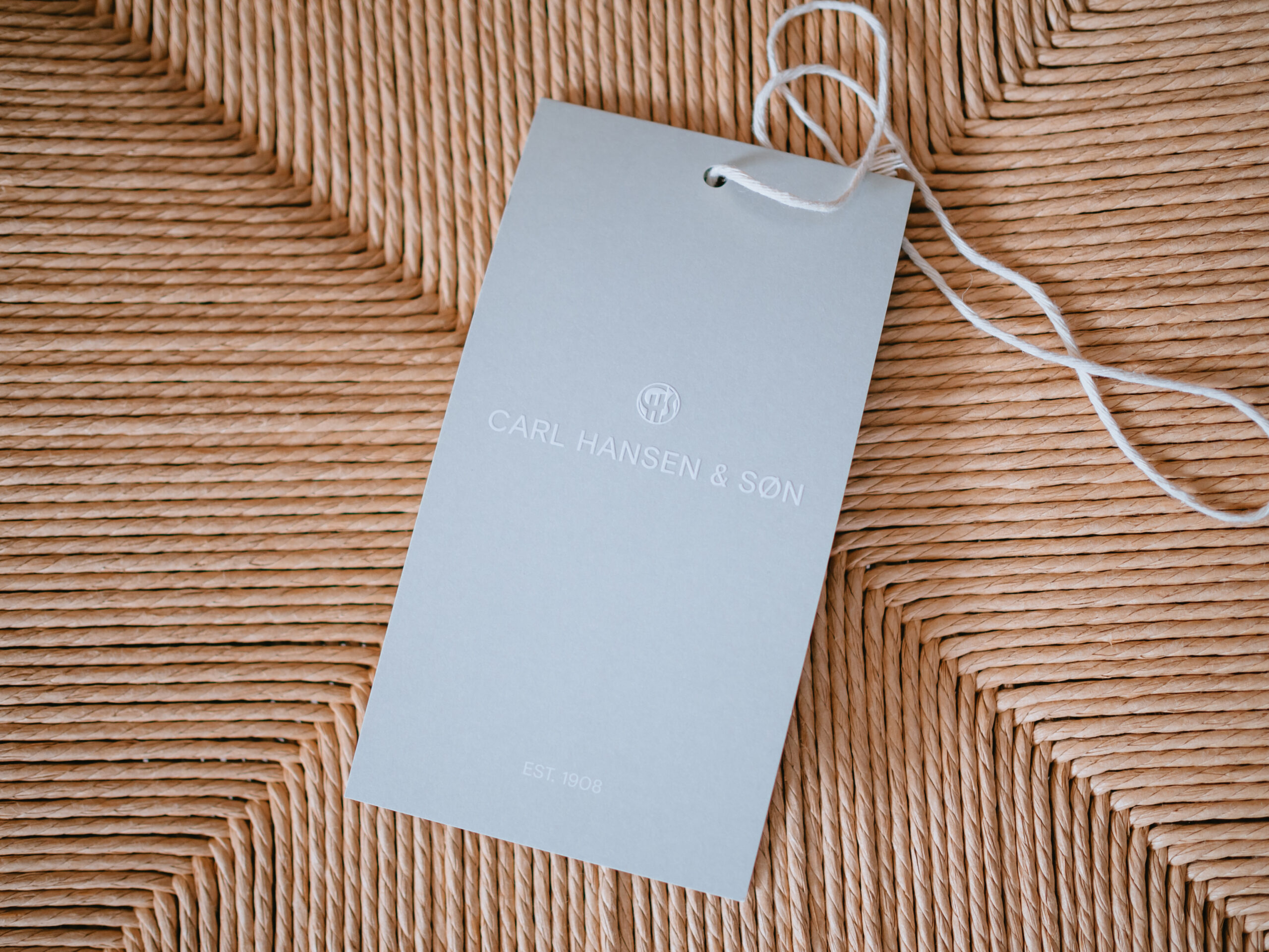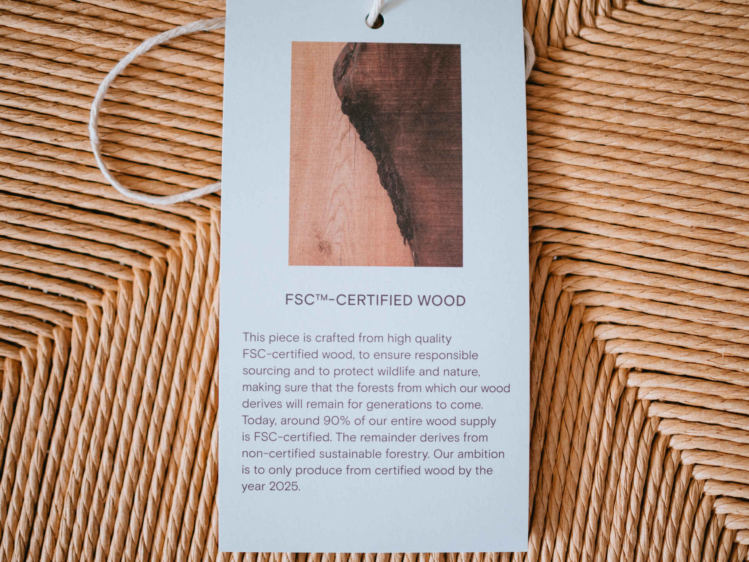 カールハンセン&サンのブランドタグ。裏側には、第三者機関のFSC(Forest Stewardship Council、森林協議会)が「適切に管理された森林」と認めた森で生産された木材「FSC認証材」であることを証明する説明書きがあります。カールハンセン&サンでは9割の木材がFSC認証を取得しており、2025年までにFSC認証材100%を目指しているとのこと。