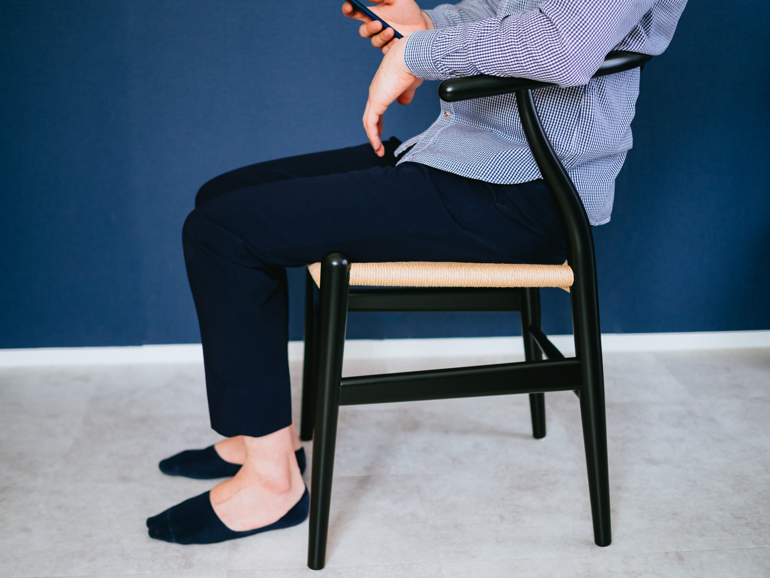 さらに、アームをつかんで立ち上がっても椅子がずれず、背もたれに寄りかかっても脚が浮かない安定さも抜群です。