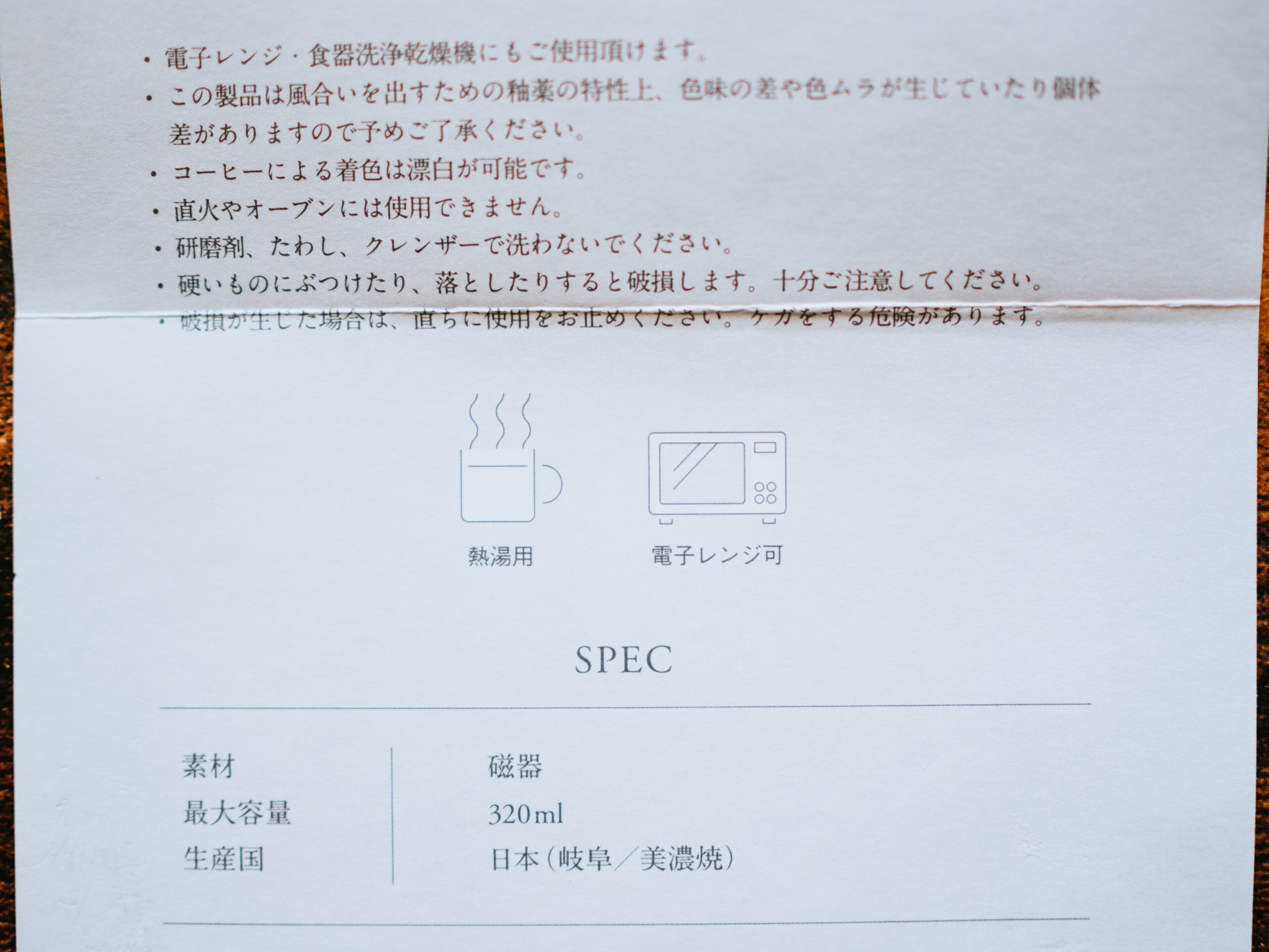 磁器製のため、電子レンジ、食器洗浄乾燥機でも使用できます。日常使いしやすいマグカップです。
