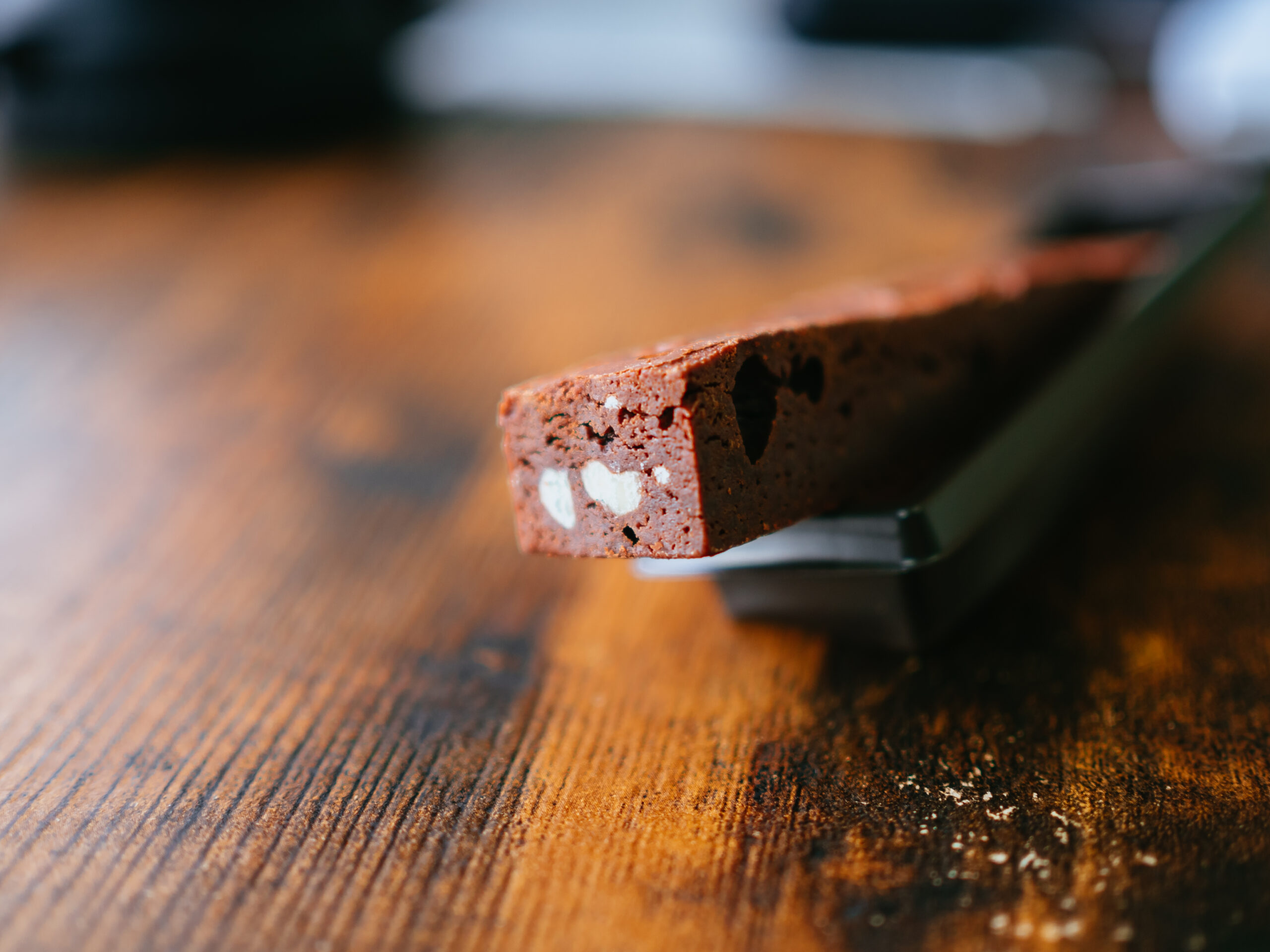 一口かじると、表面のサクッとした食感とともに香ばしさが広がります。内側は2種類のクーベルチュールチョコレートが練り込まれた生地で、しっとり滑らかな口当たり。濃厚な生チョコのようでコクがあり、それをクルミのナッツの風味が引き立てます。