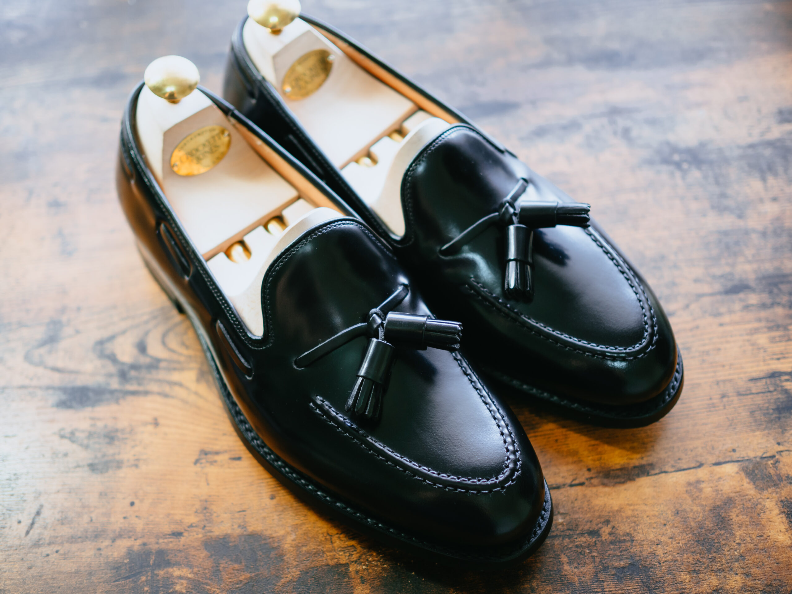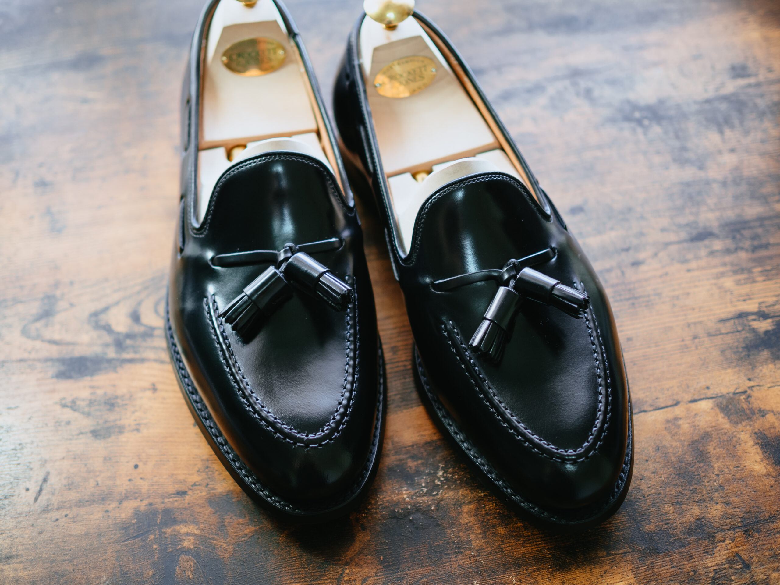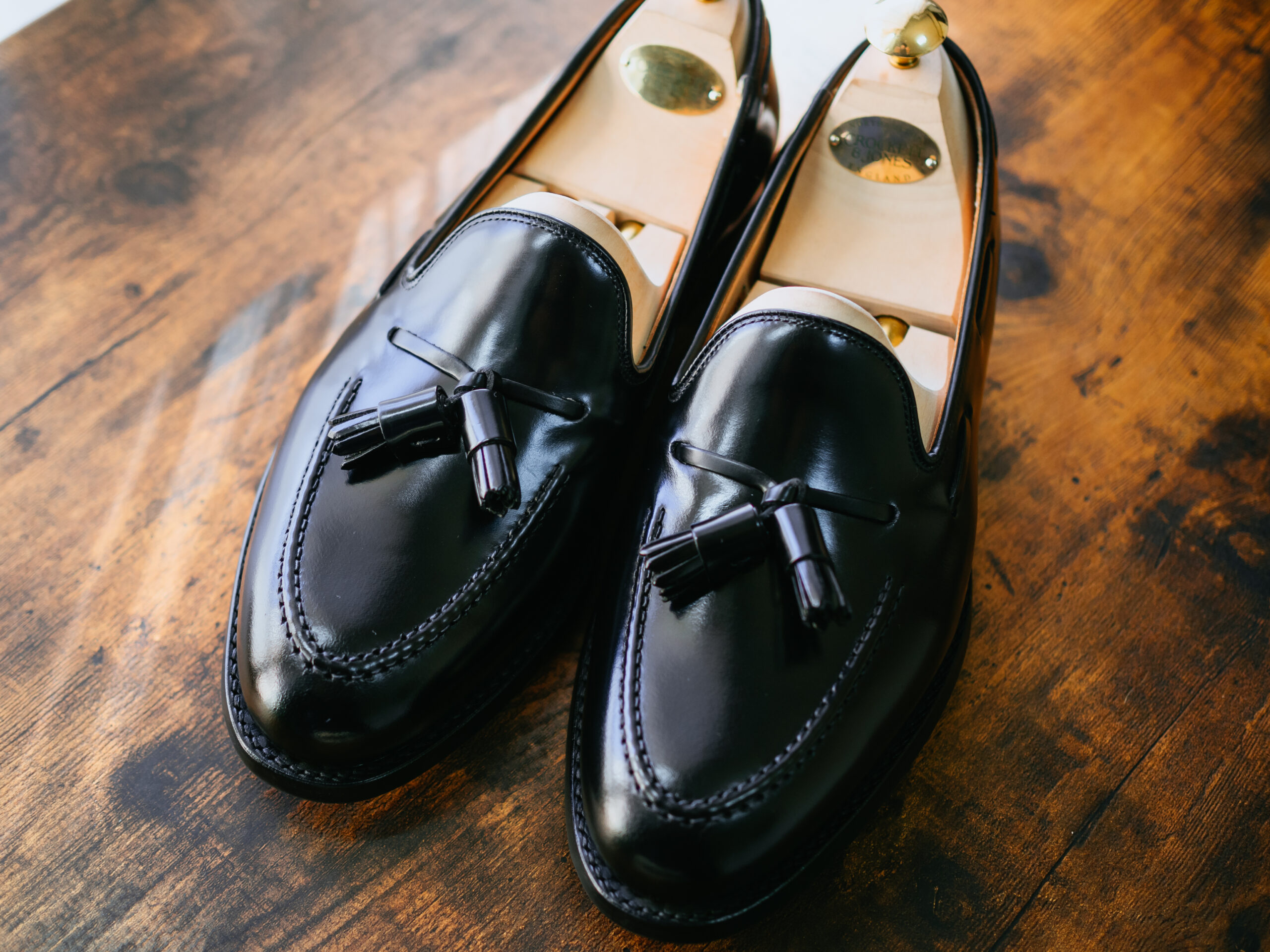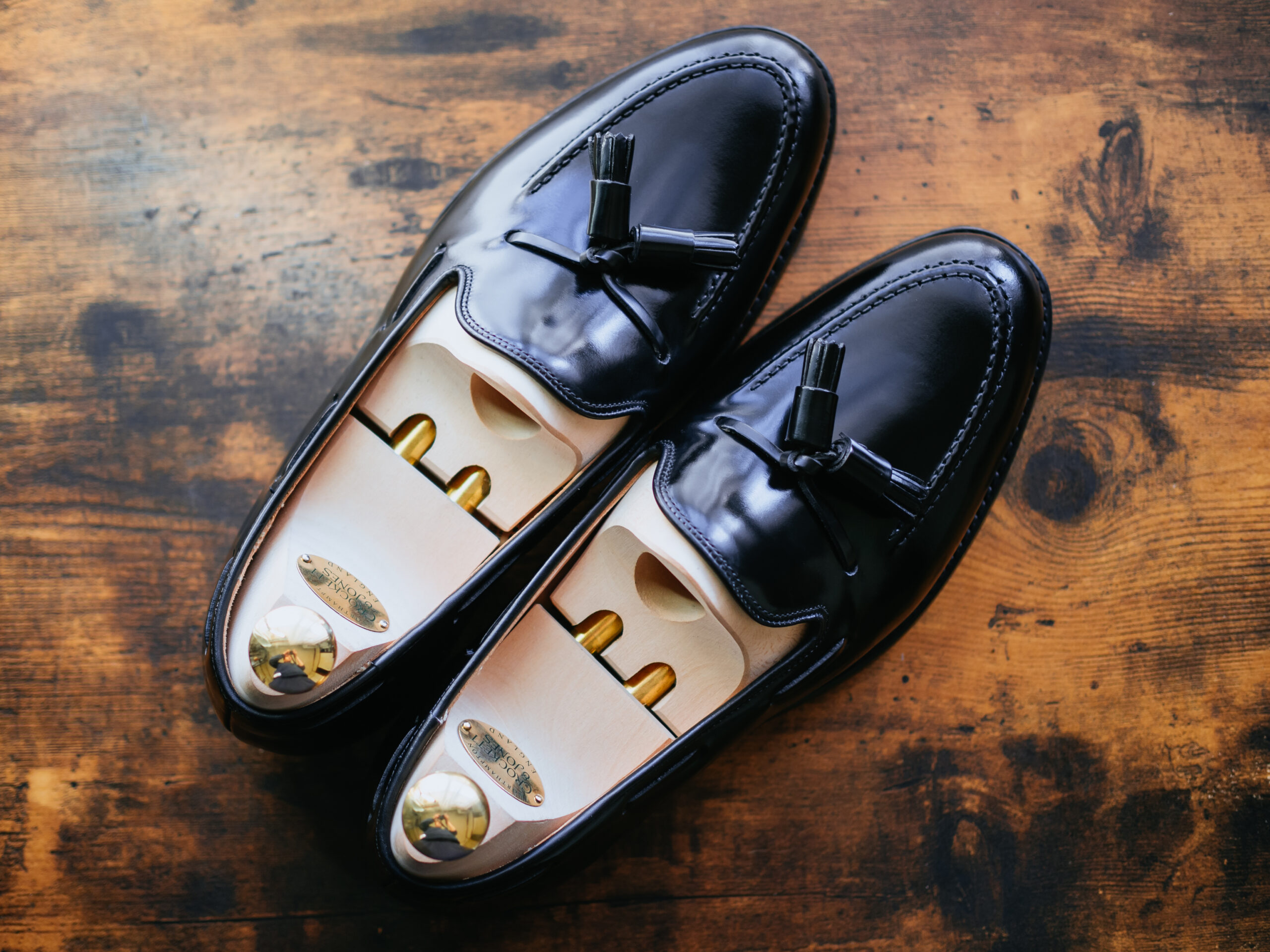 英国ブランドの高級革靴はこれが最初の1足のため、手持ちの革靴と比べても明らかに革質の良さが群を抜いていました。純正シューツリーも格好良く、眺めているだけで気分が上がります。