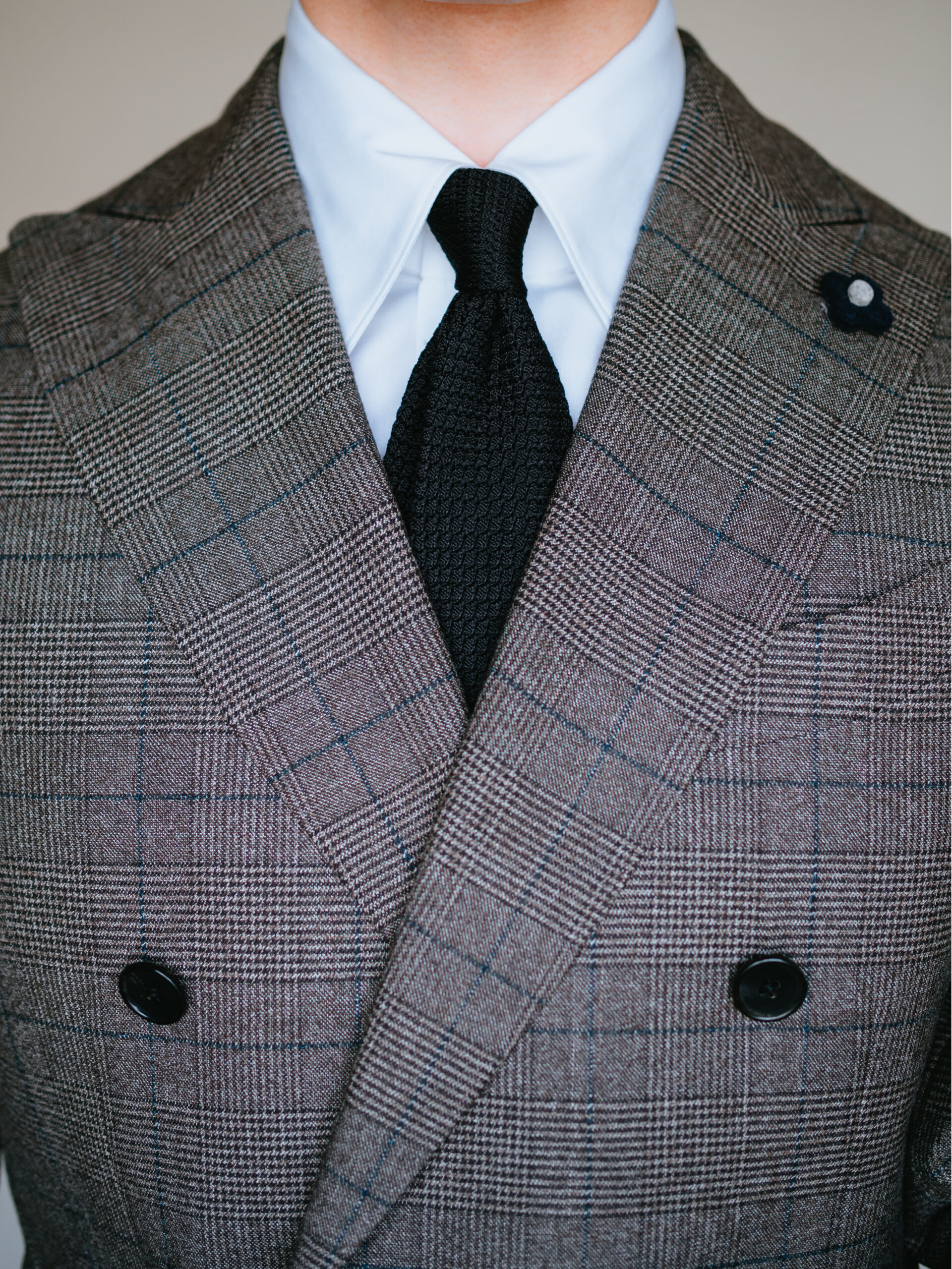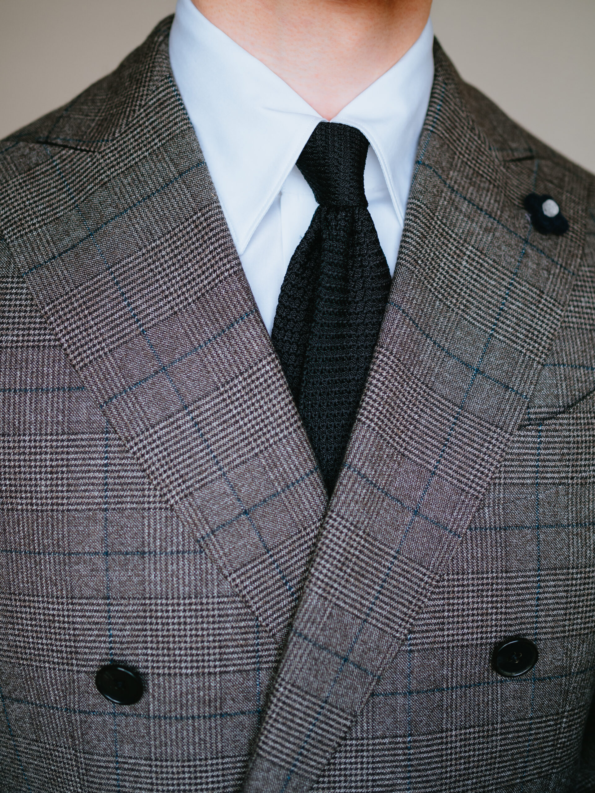 ニットタイはどうしてもノットが綺麗に絞まらないので避けていたのですが、このグレナディンタイはしっかり締められて程よいボリューム感のノットになるのでお気に入りです。