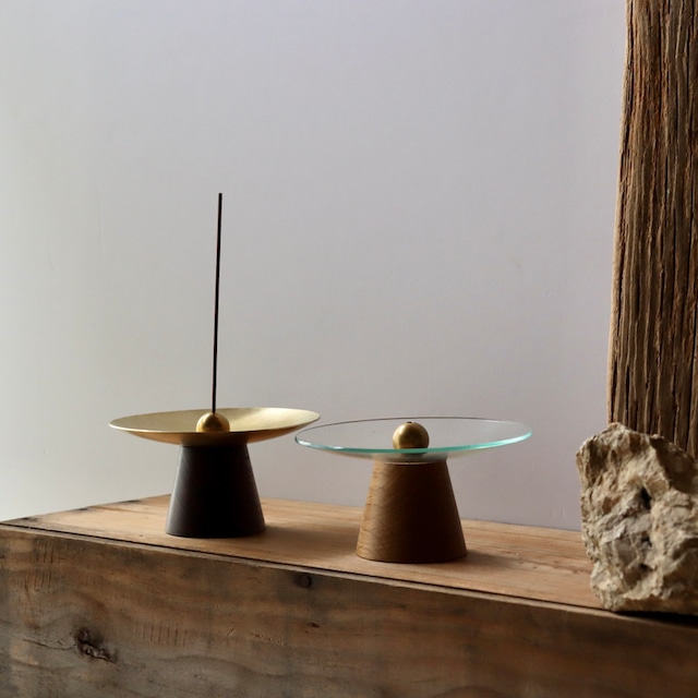 ガラスは数ミリの厚さがあり、中央がへこむように湾曲しています。木部の土台も底がくぼんでいます。お香立ての部分は真鍮です。