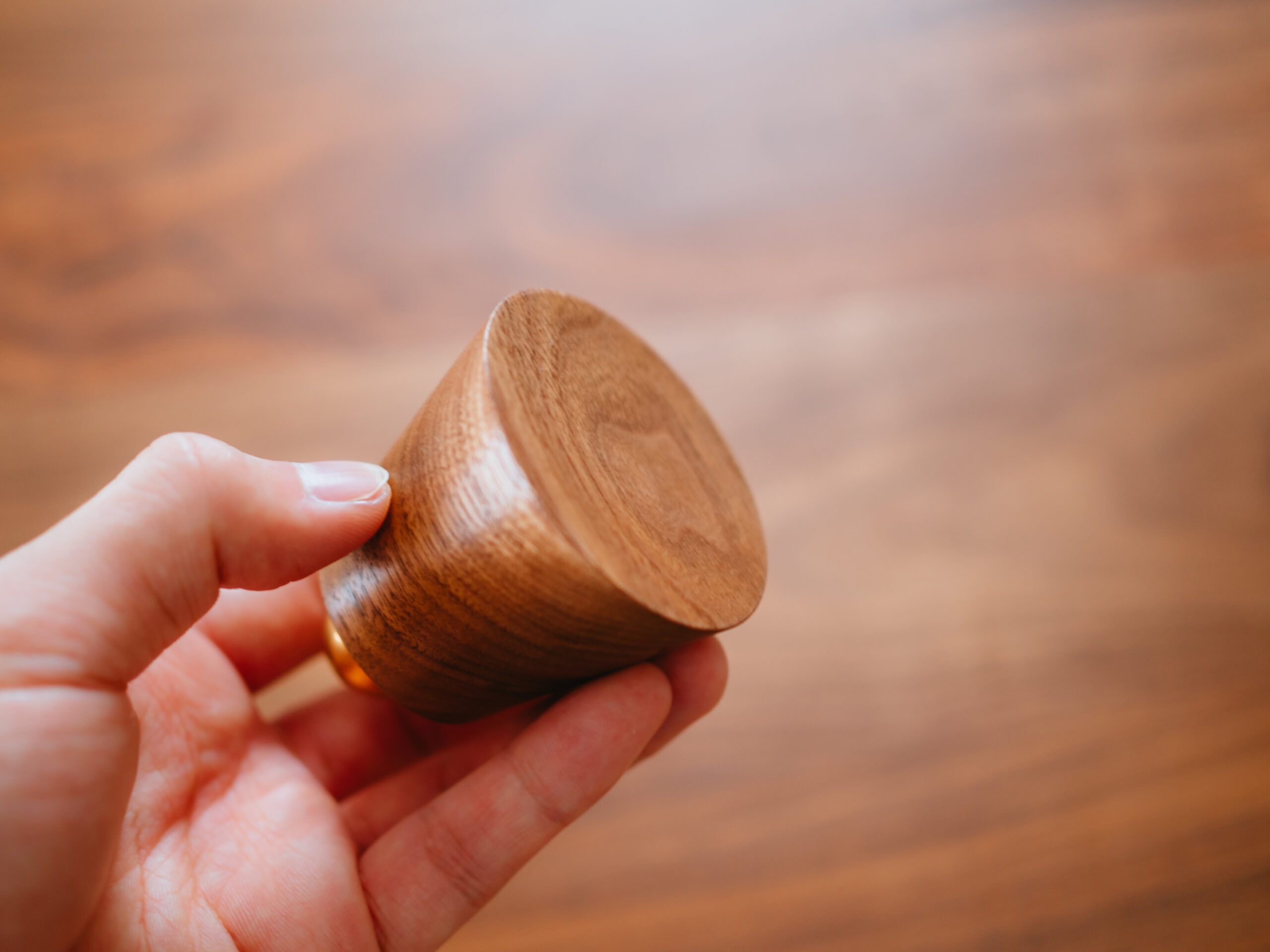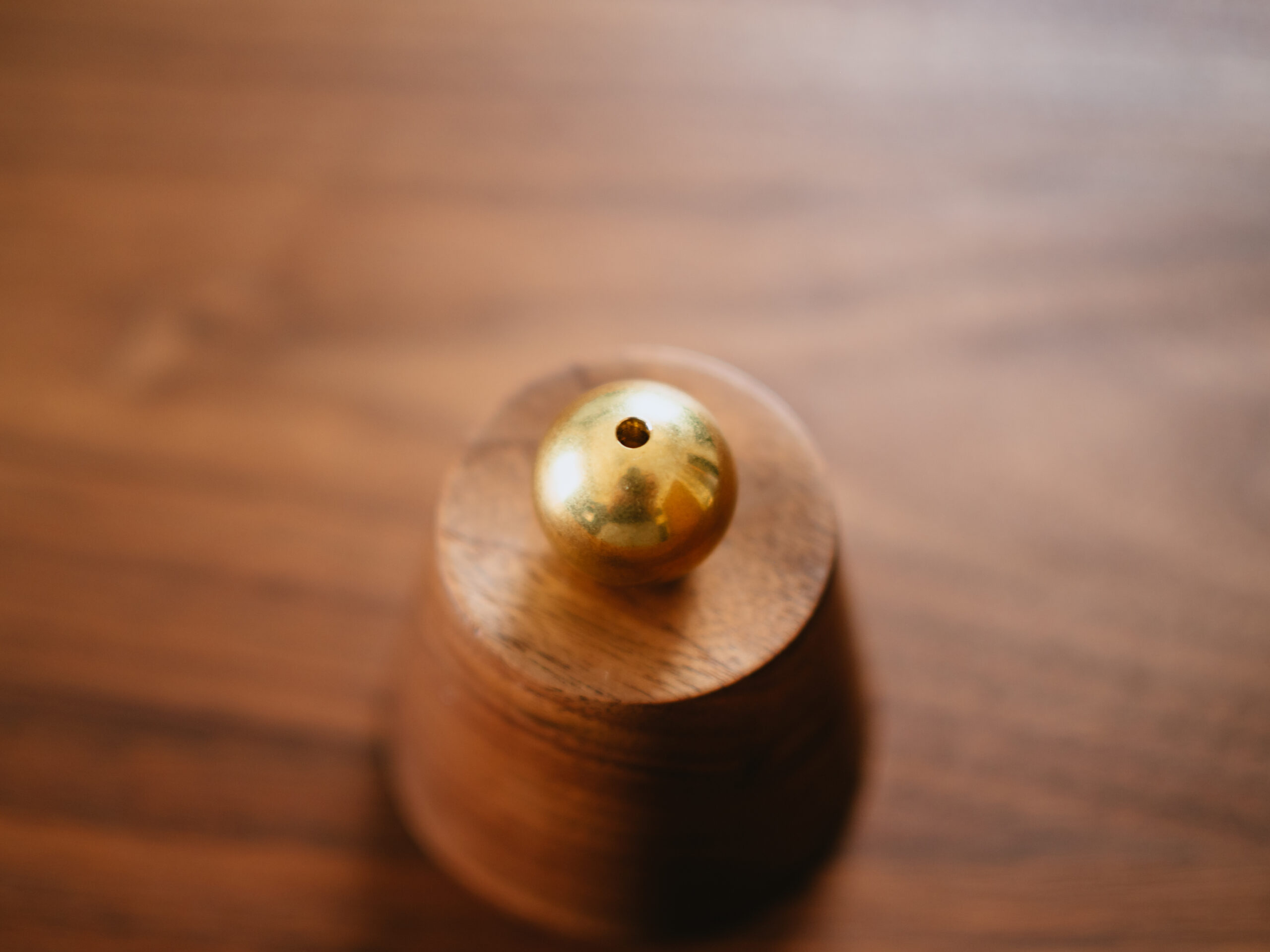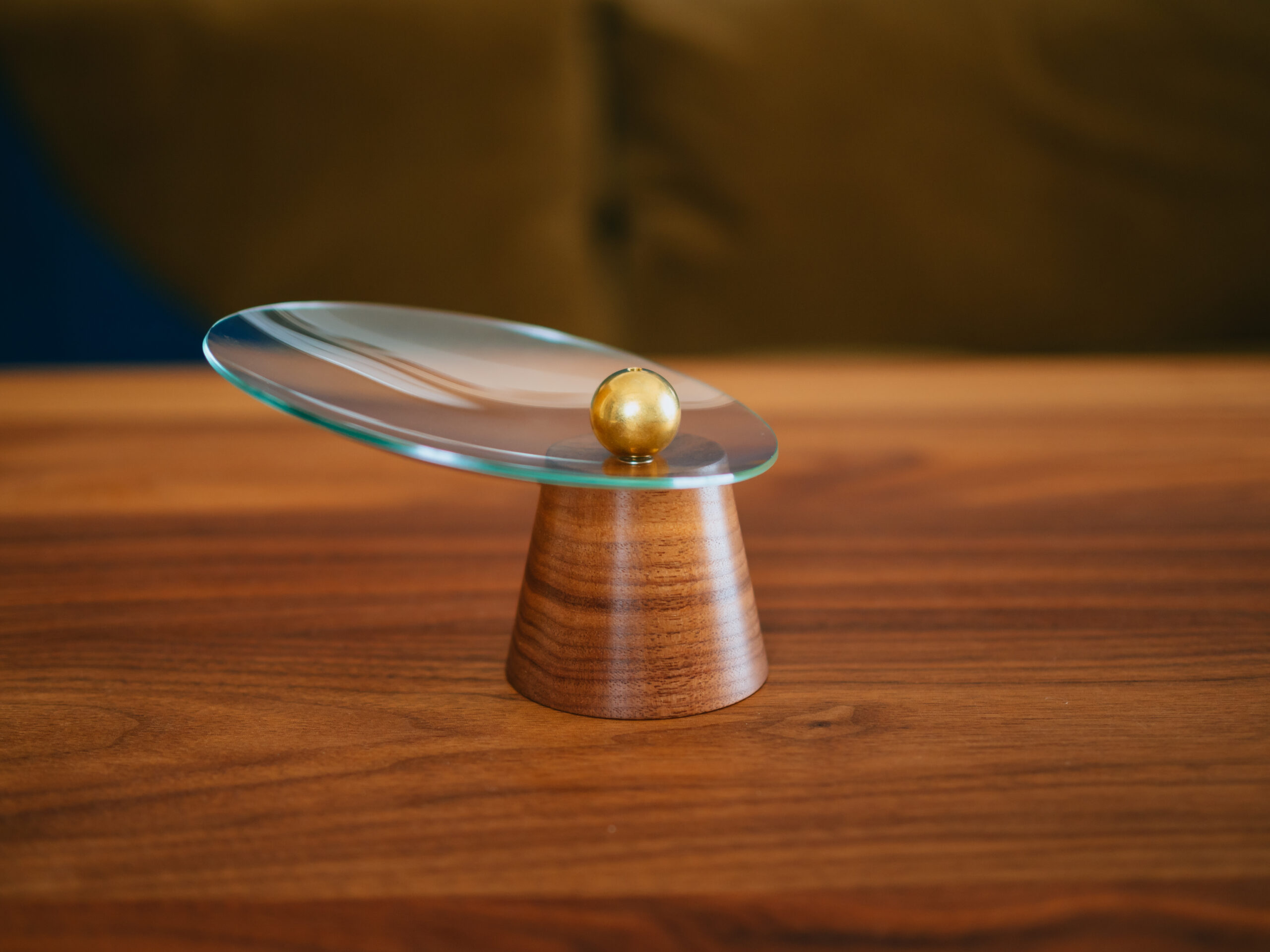 木部土台の上にガラスの受け皿を置いて、真鍮ボールを置くことで磁力で固定・組み立てます。磁力はそこそこ強いですが、真鍮ボールをくっつけたまま、ガラスを傷つけることなく自由に動かすことができます。