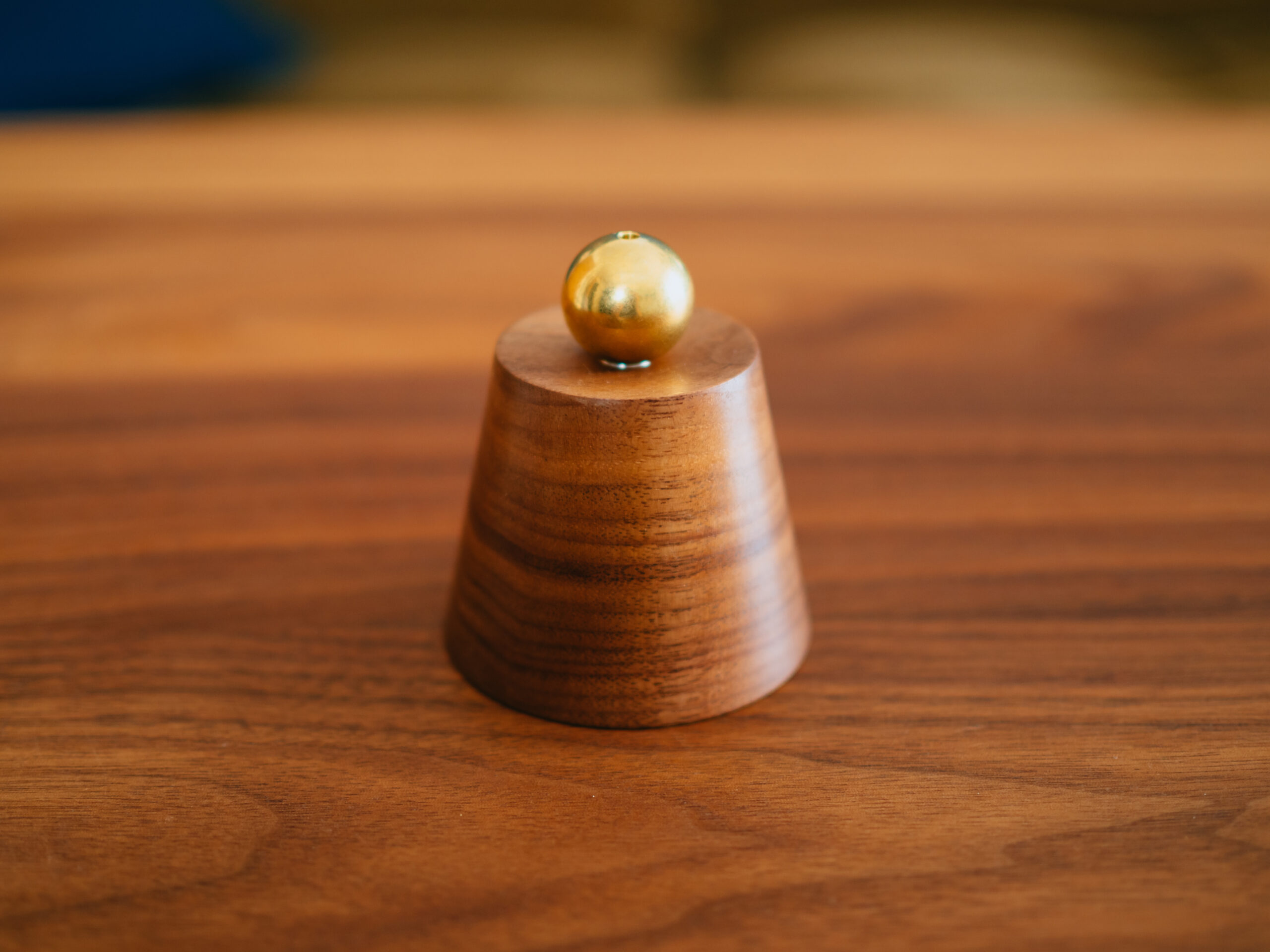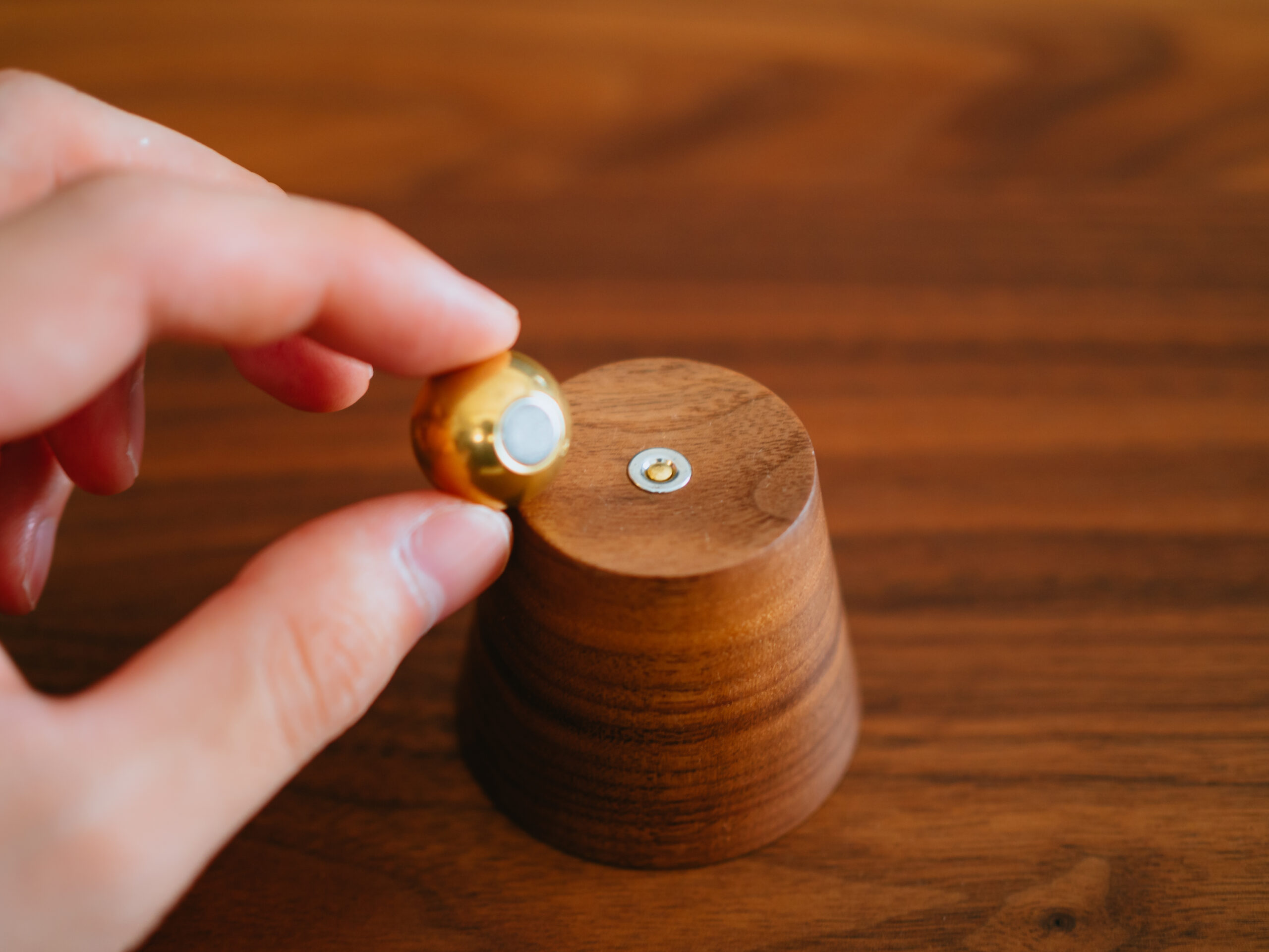 木部と真鍮ボールにネオジウム磁石が仕込まれており、磁力でくっつきます。