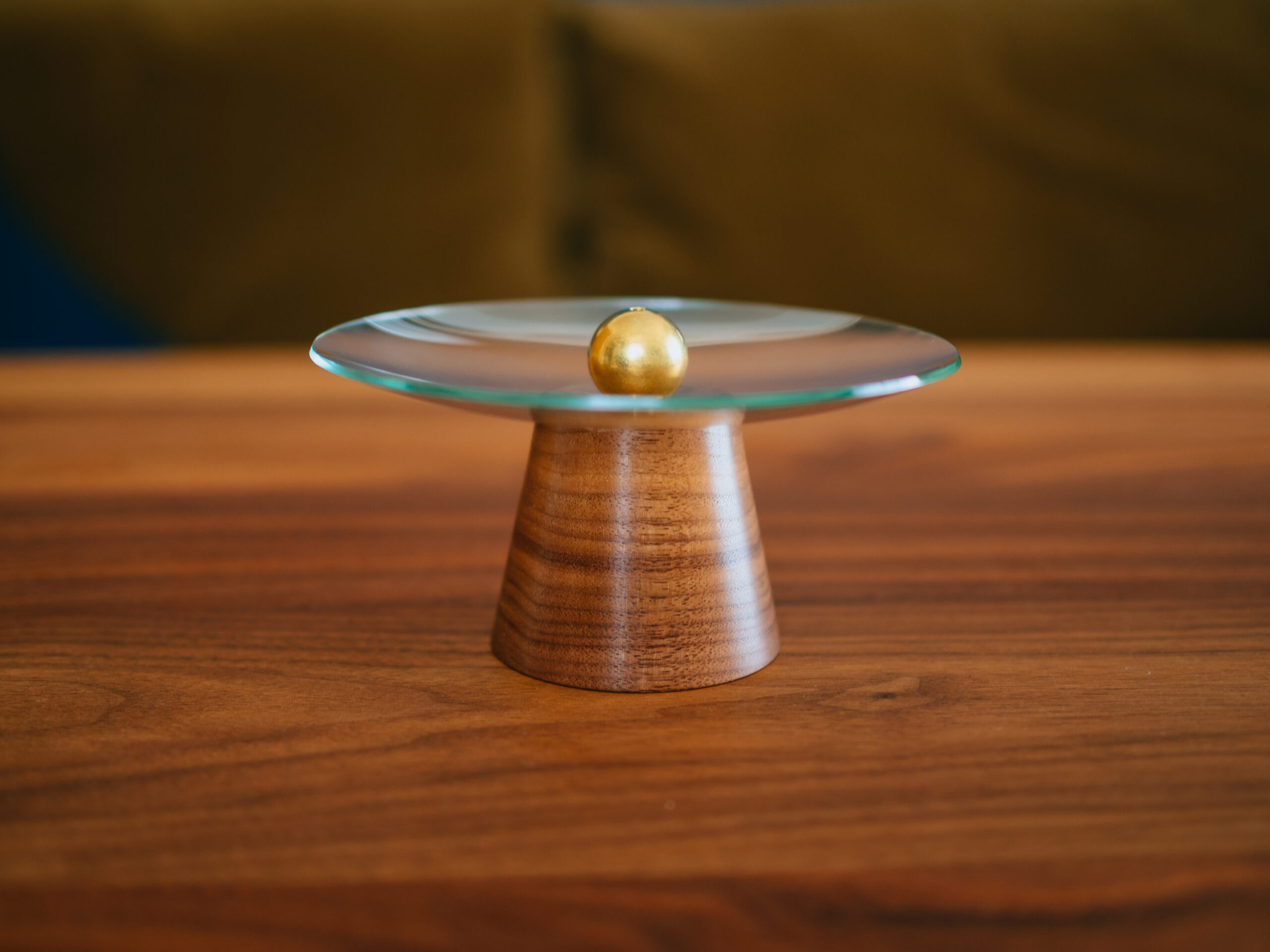 デザインに一目惚れしたのも事実ですが、よく考えられたつくりになっています。受け皿が真鍮とガラス、木部がチークとウォールナットでそれぞれの組み合わせで4種あります。