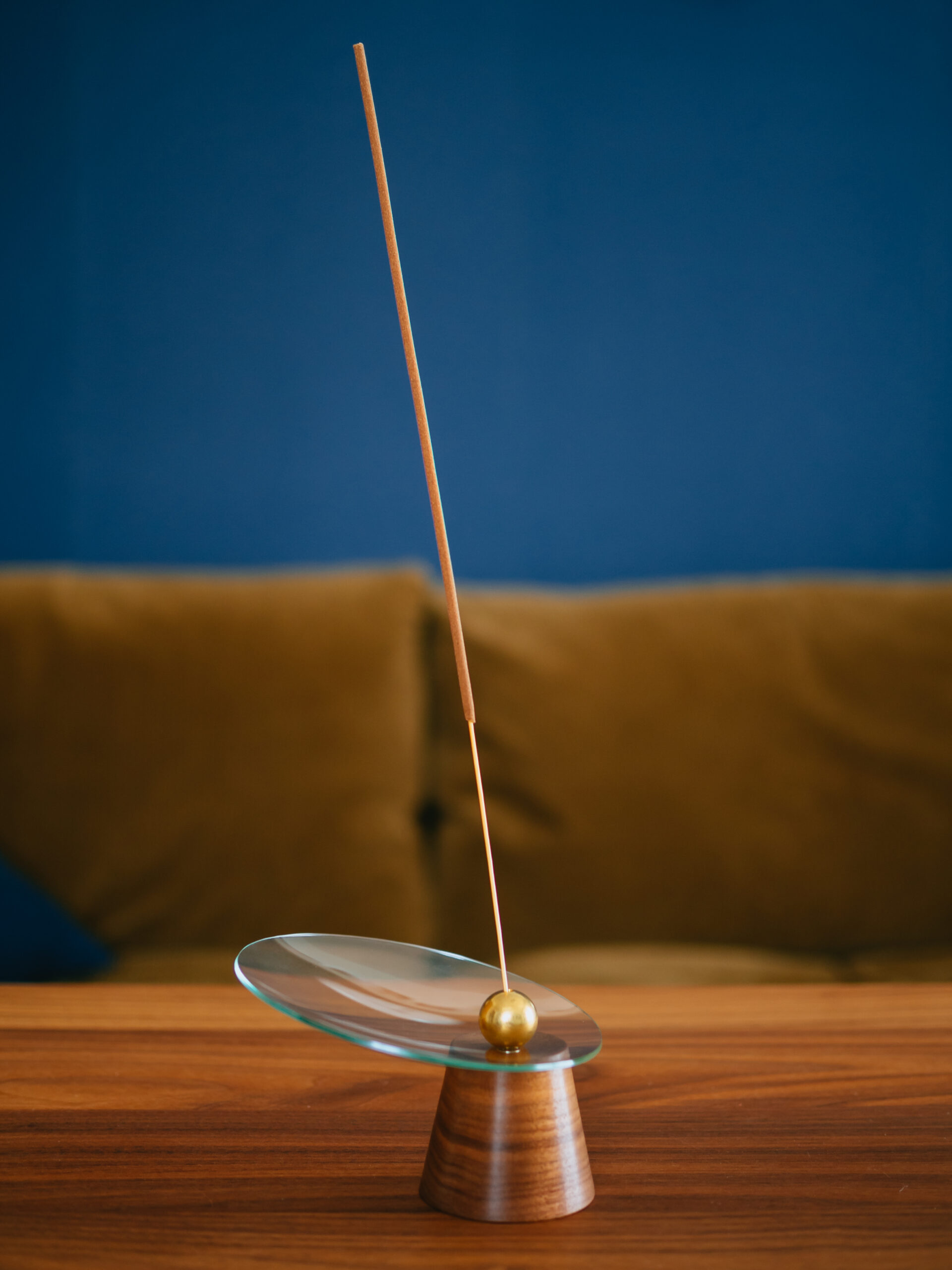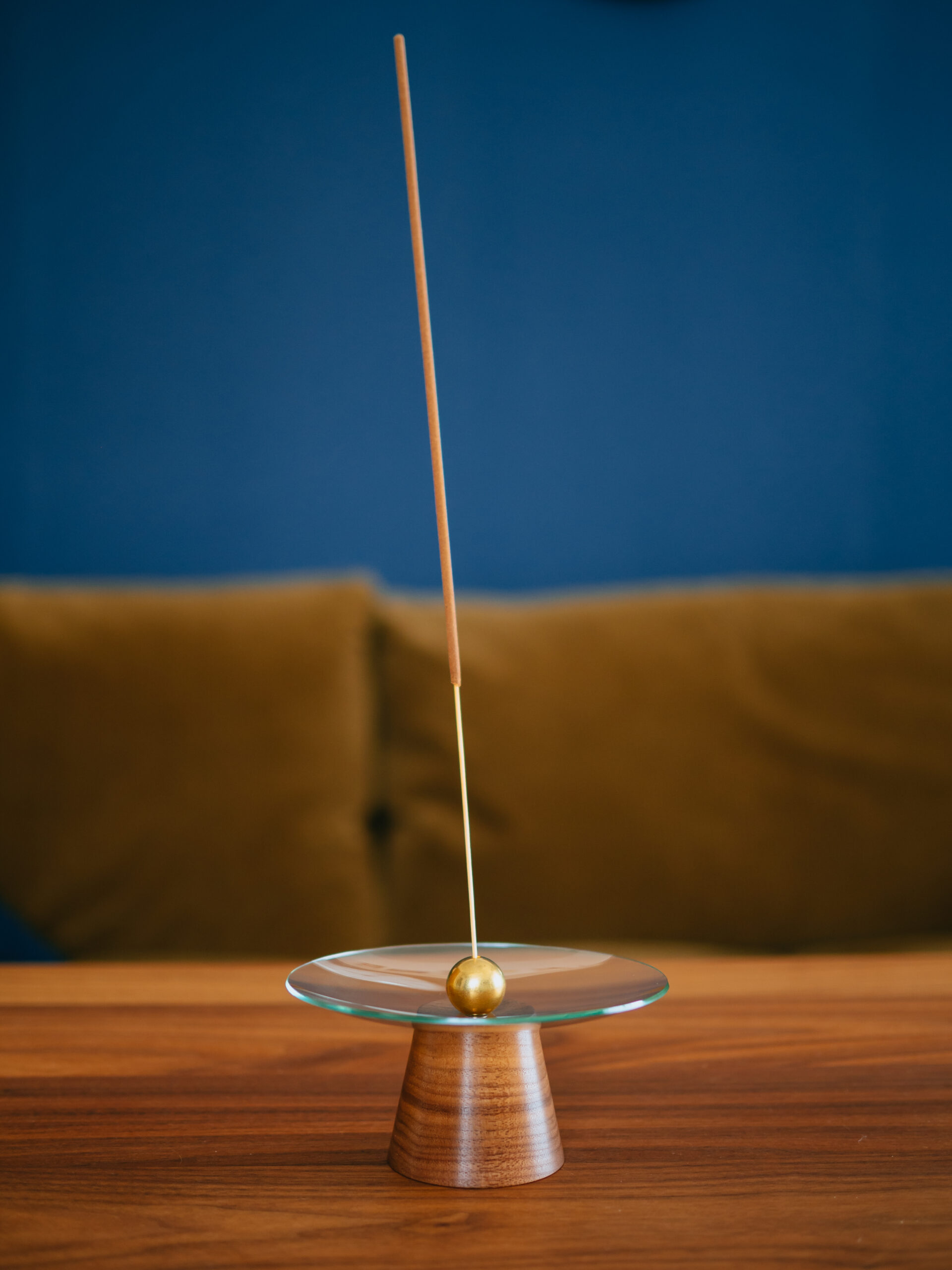 受け皿を動かすことで長いお香でも灰がこぼれないようにしっかり受け止めることができます。ガラスの受け皿は少し厚みがあるので簡単にヒビが入ったりはしなさそうですが、何度も真鍮ボールを磁力でくっつけると衝撃が入るので、基本的には外さず受け皿をスライドさせて調整するのが良さそうです。