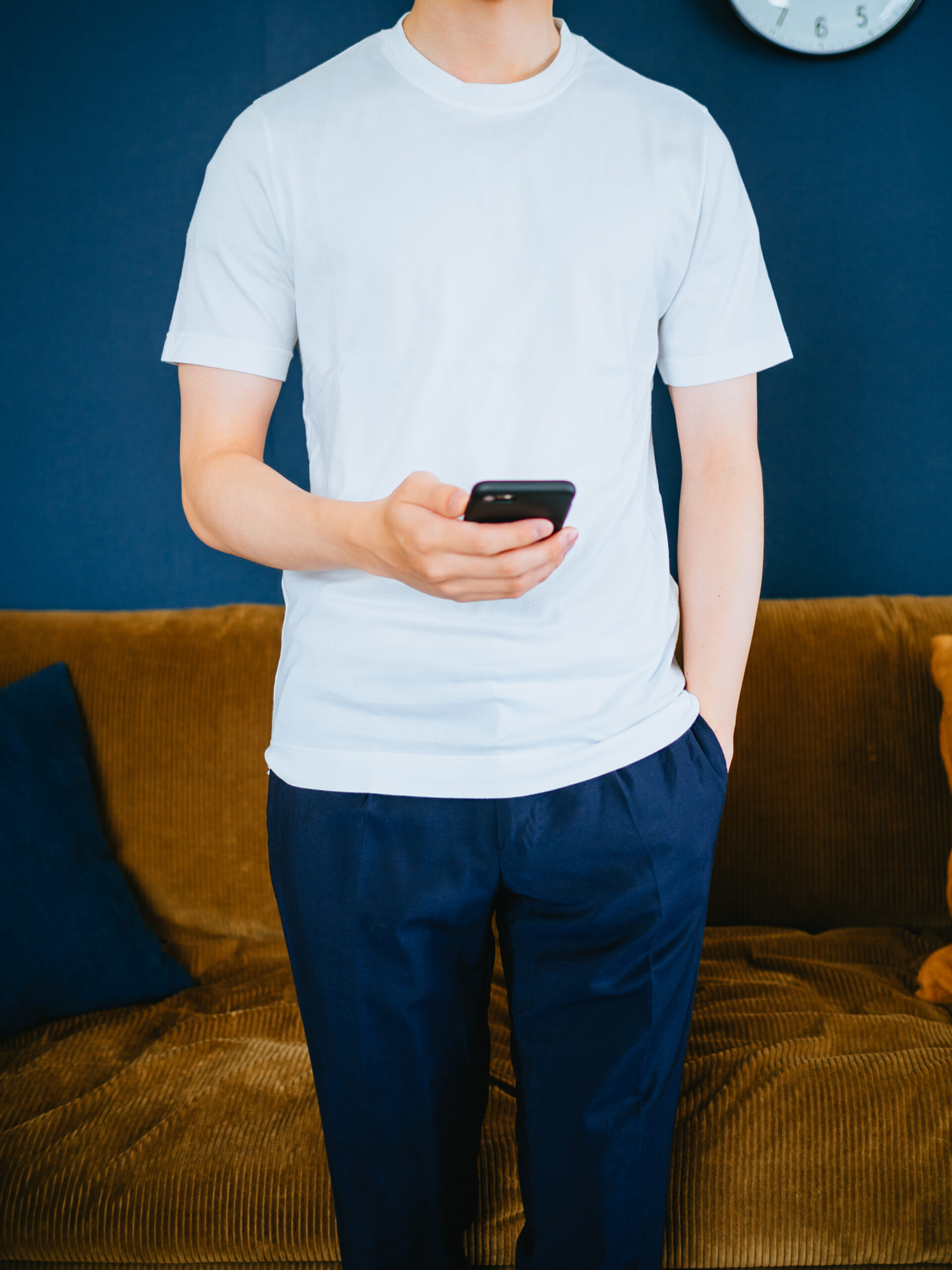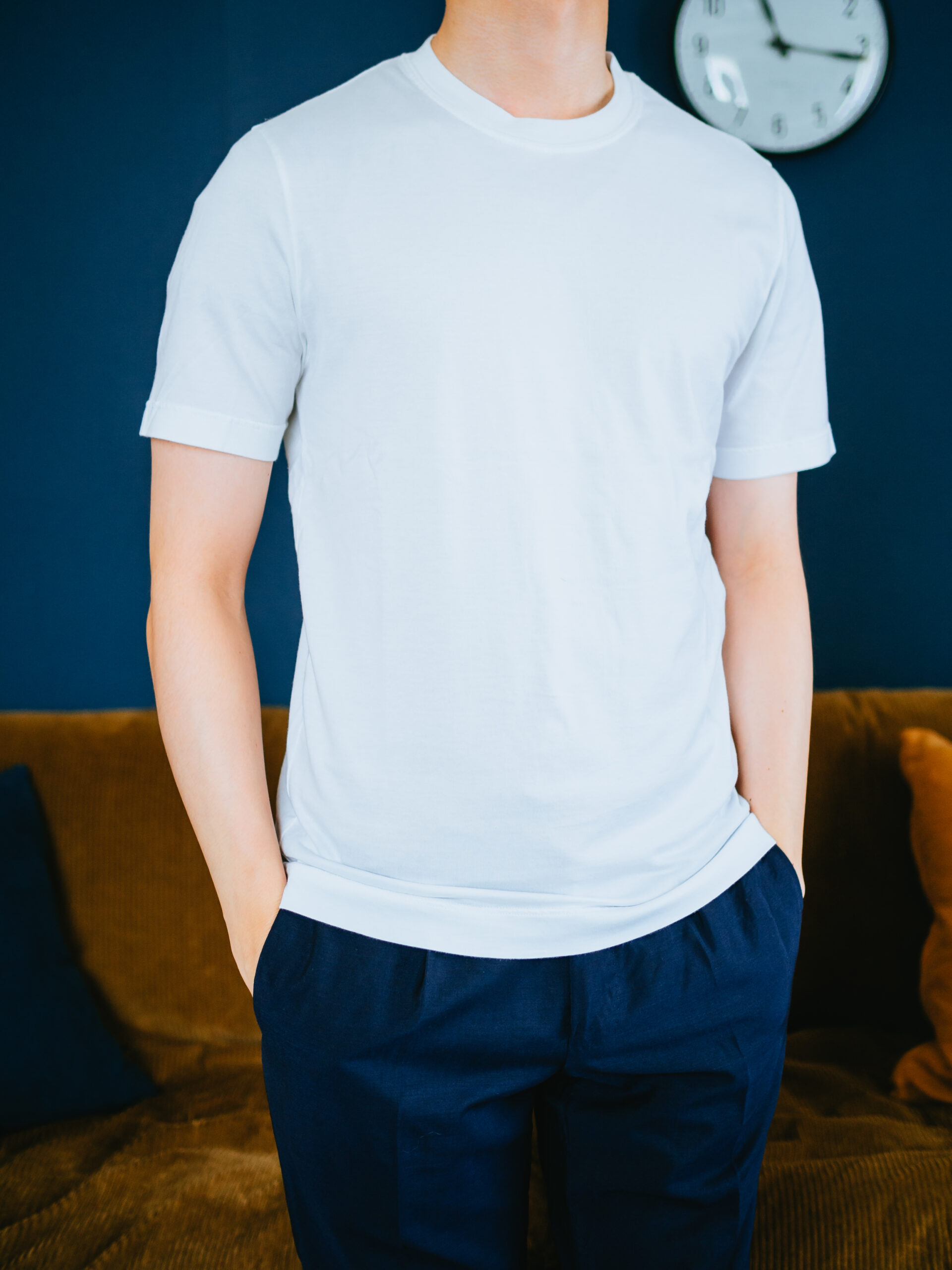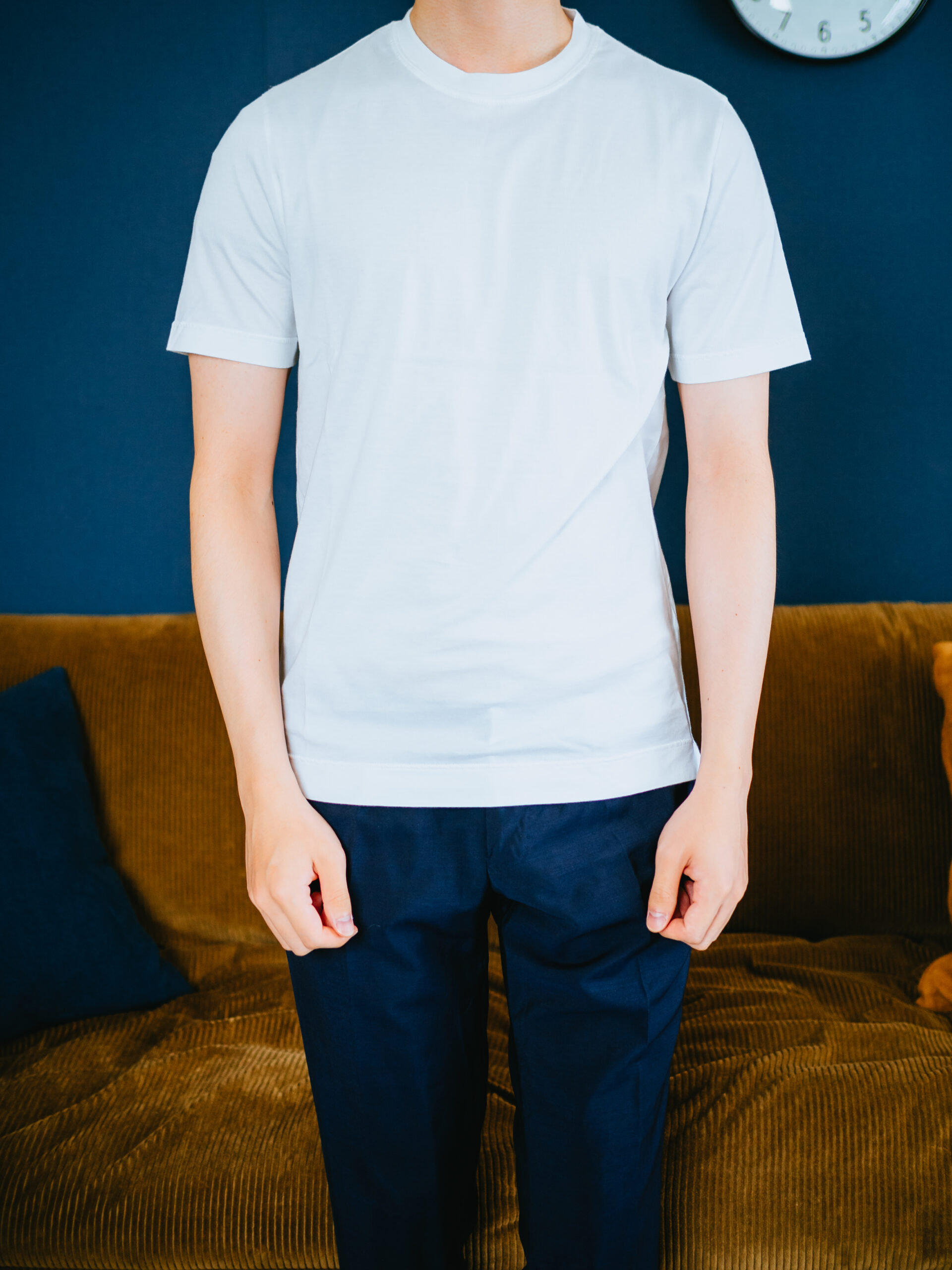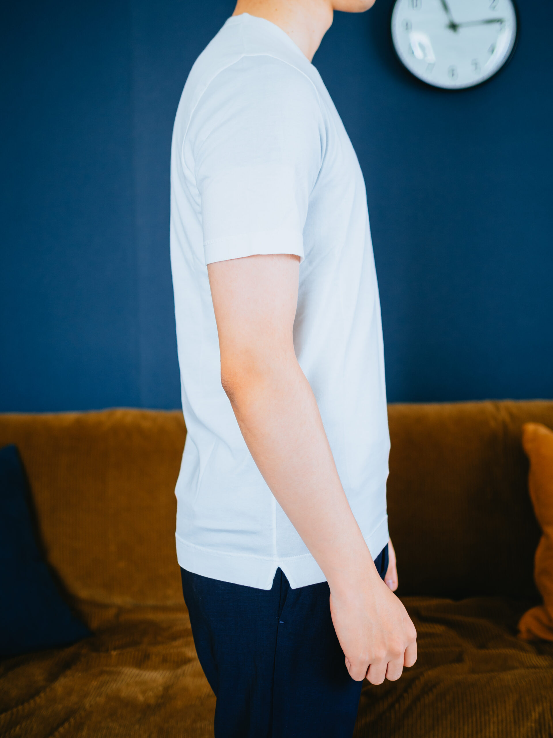 程よい細身のシルエット。何よりも、ついつい撫でたくなる「しっとりスベスベ」の肌触りが最高で、着ていて気持ち良いです。これをインナーシャツとして1日中着ていたいくらい、他のTシャツとは一線を画します。