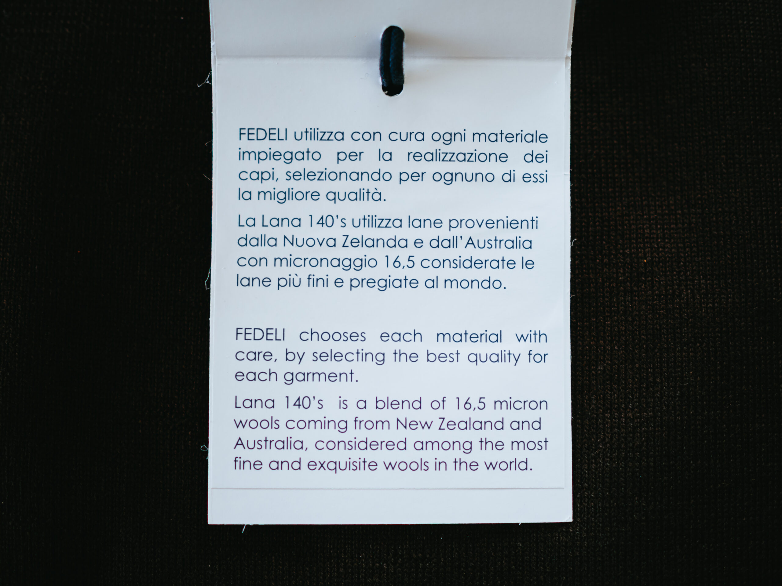 首のブランドタグ。通常タグと異なり、「Lana 140’s」の表記があります。