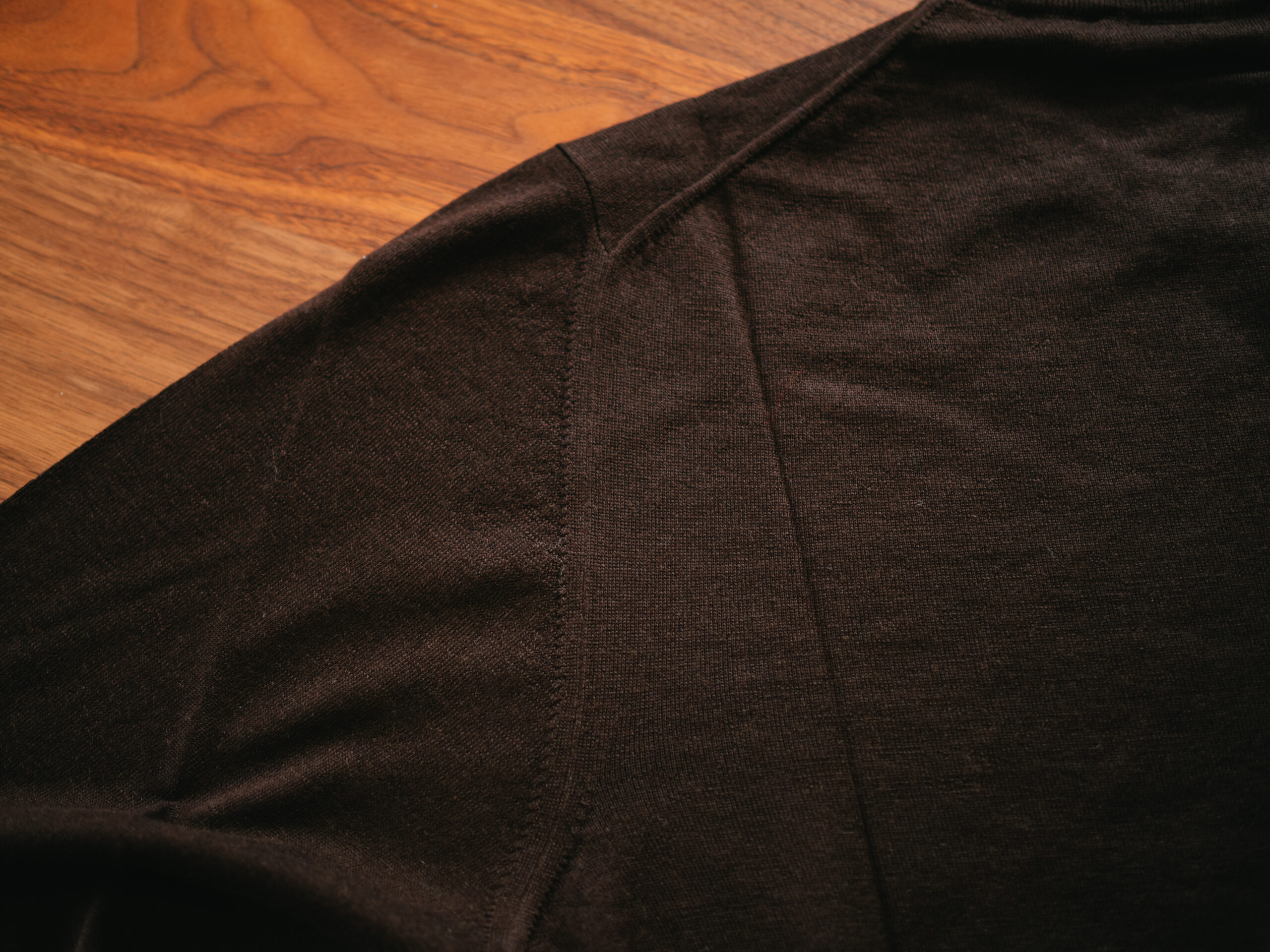 一目で高級ニットと分かる艶やかさがあり、起毛感がほぼ無いので、ジャケットやスーツのインナーとしても使えます。何度も触りたくなるトロッとした肌触りがとても気に入っています。