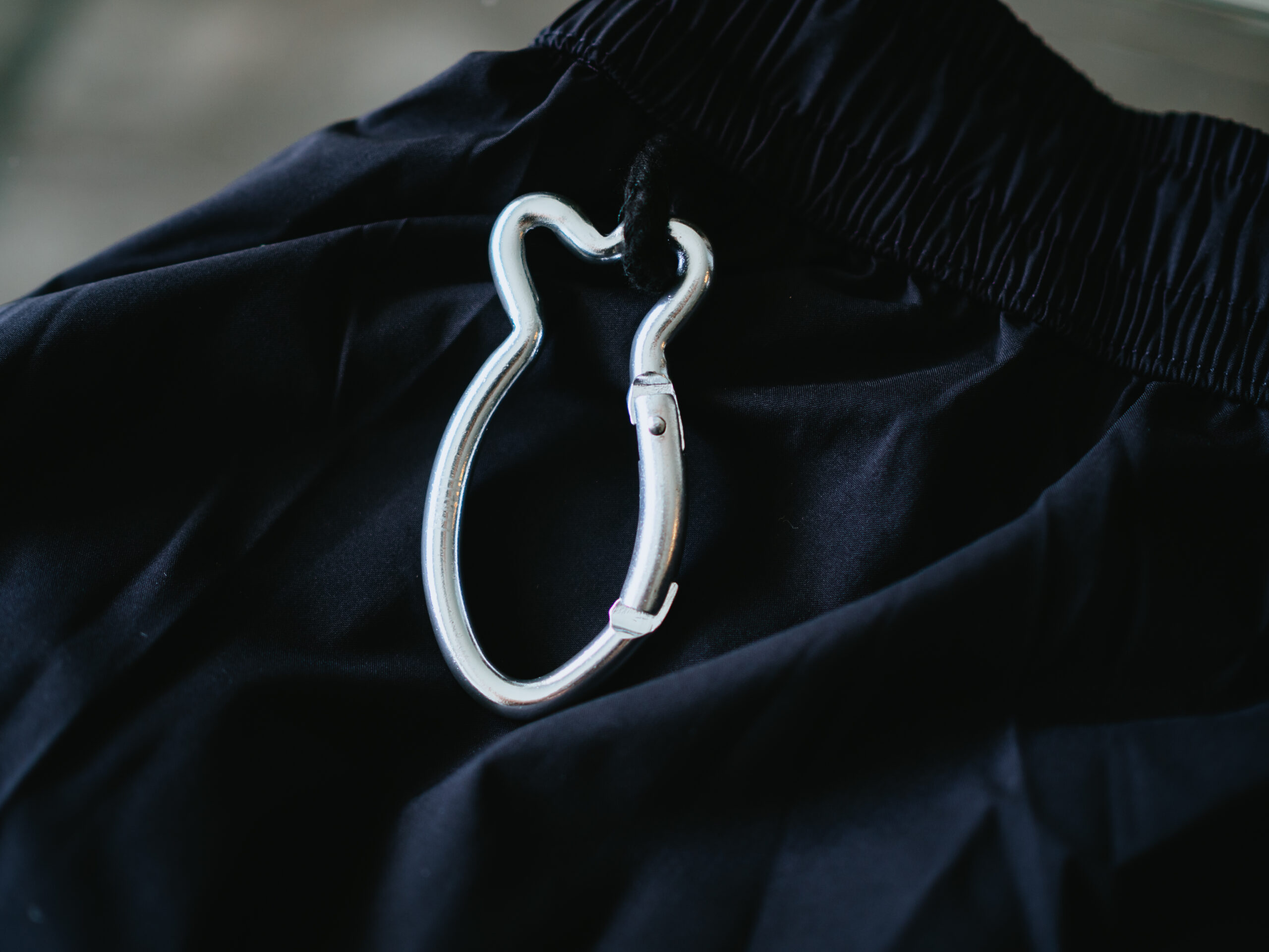 個人的には正直付けるものはないですし、洗濯時に毎回外すのは面倒ですが、ワンポイントアクセサリーとしてカラビナだけ付けて使っています。