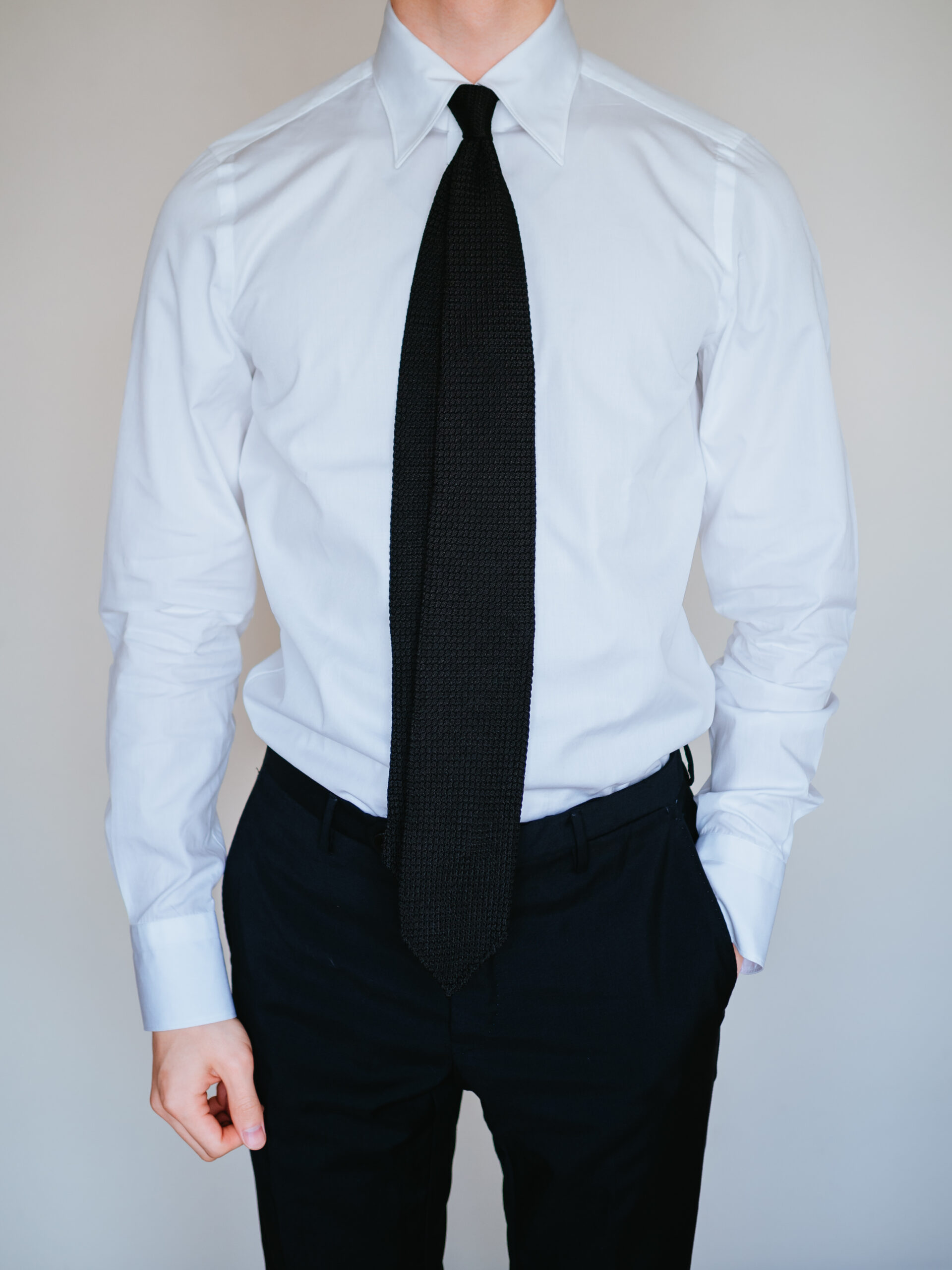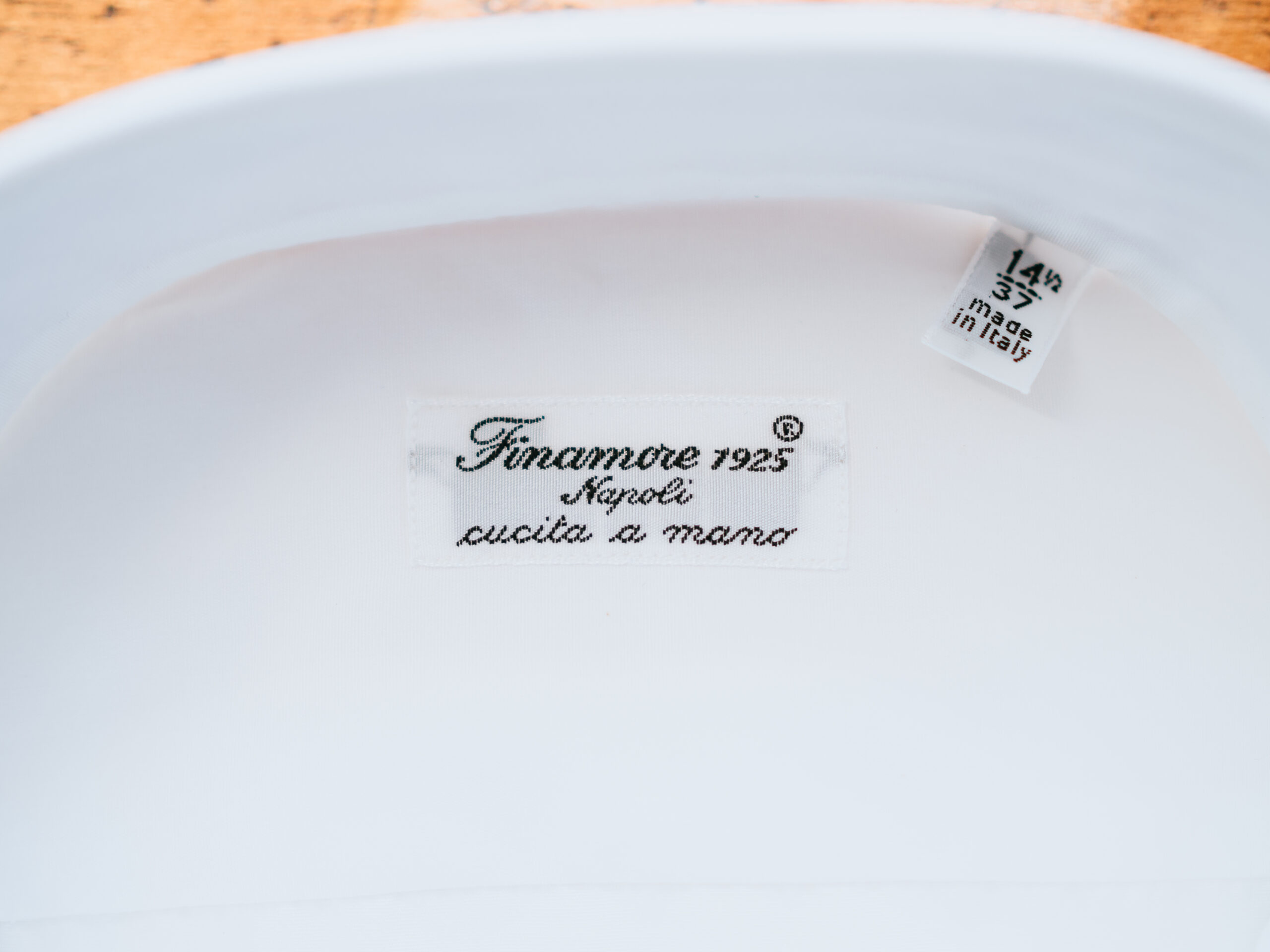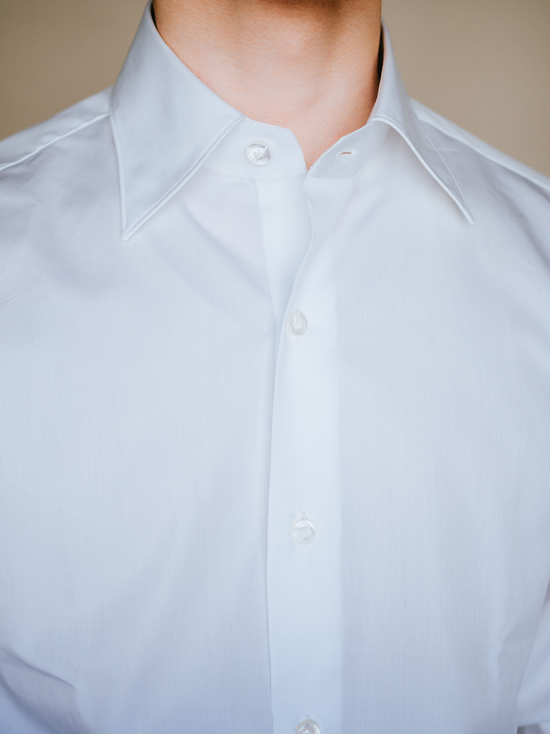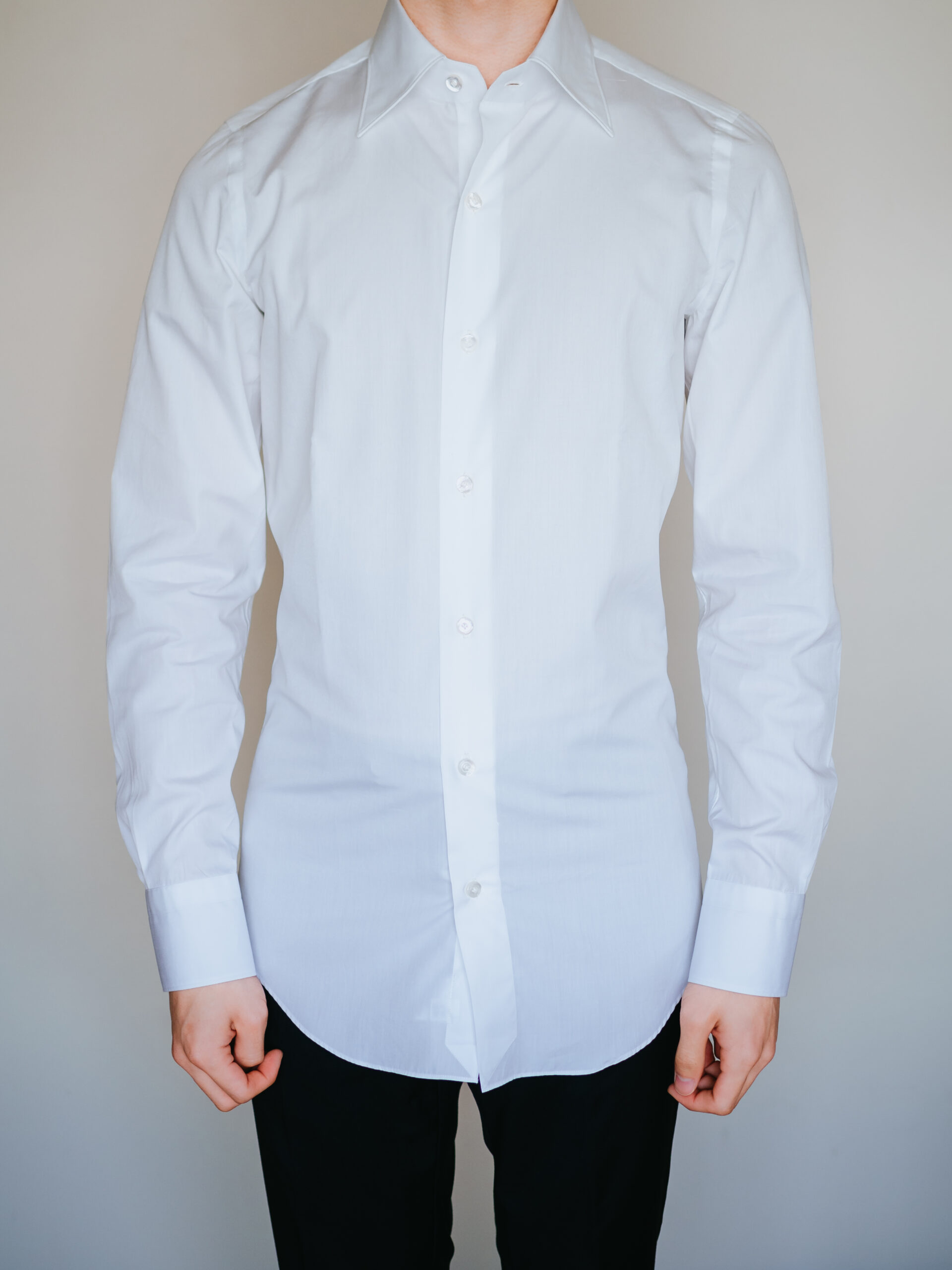 ALUMO社の最高級の生地とFinamoreの伝統的な仕立ての組み合わせで生まれたシャツは、ここぞという時に着たい勝負ドレスシャツ。ホワイト、セミワイドカラー、ブロード生地の定番かつシンプルなディテールは幅広いコーディネートで使えるため、1枚持っていると重宝しそうです。間違いなく手持ちシャツの中で1群に入るドレスシャツでした。