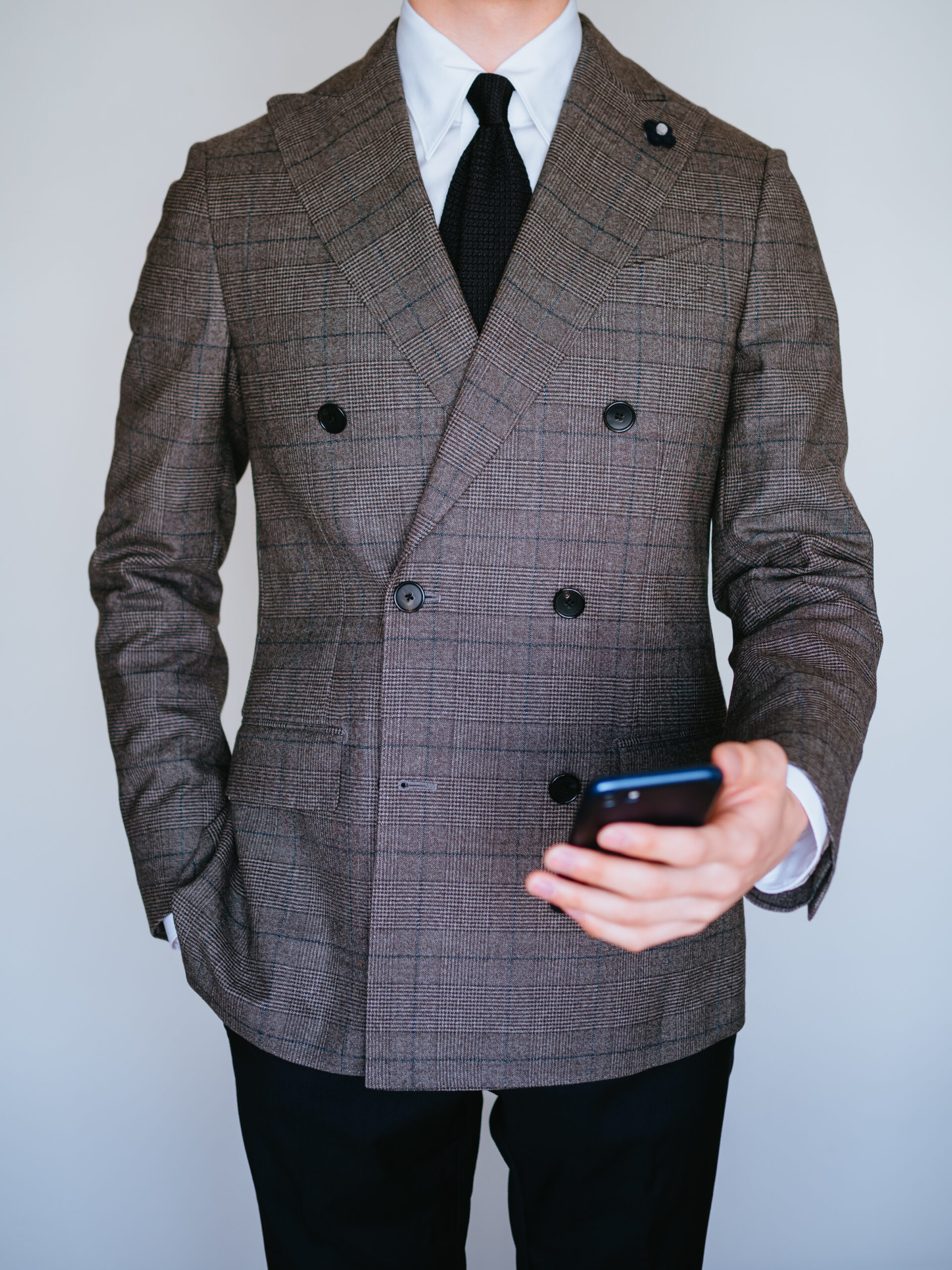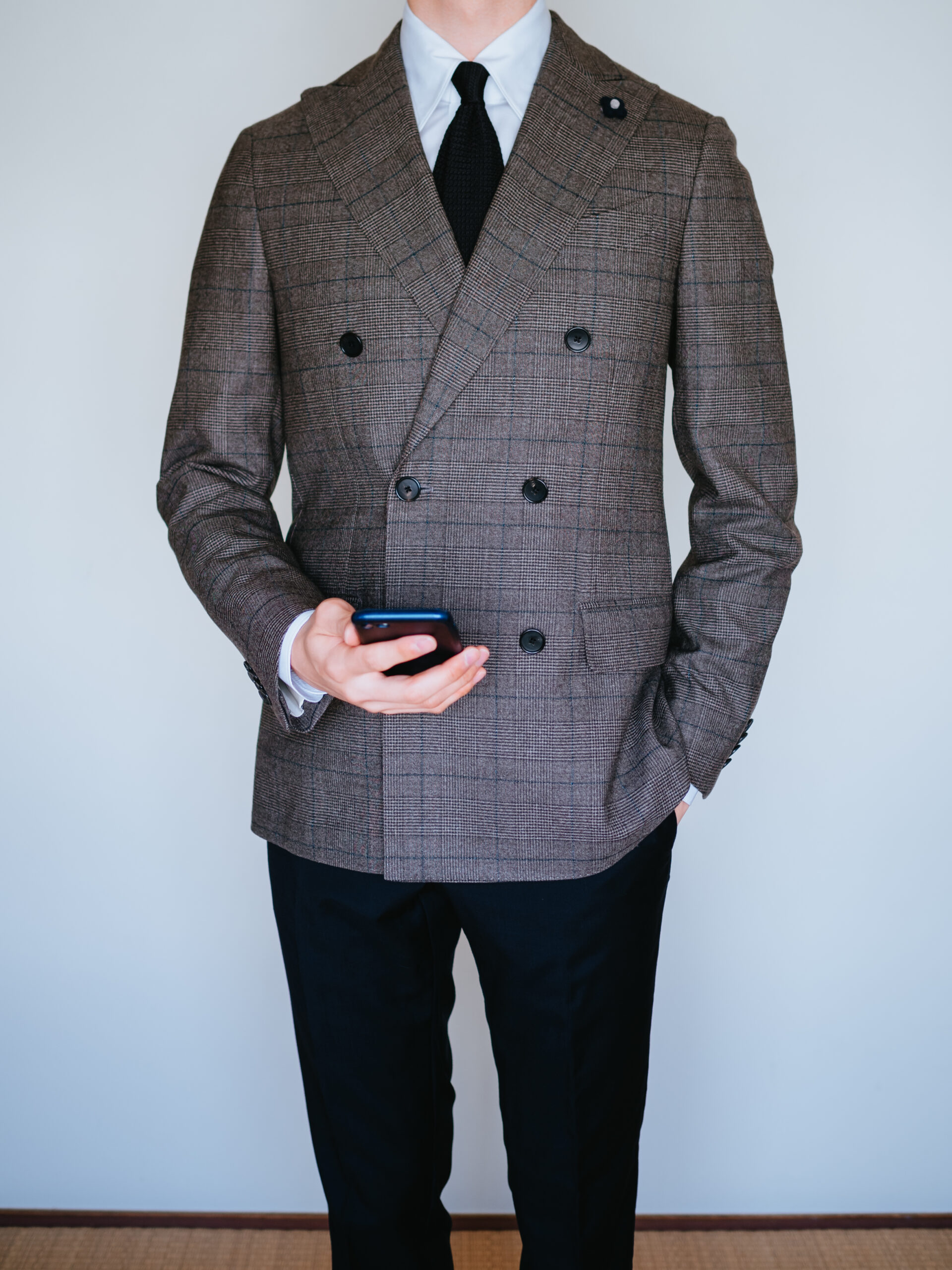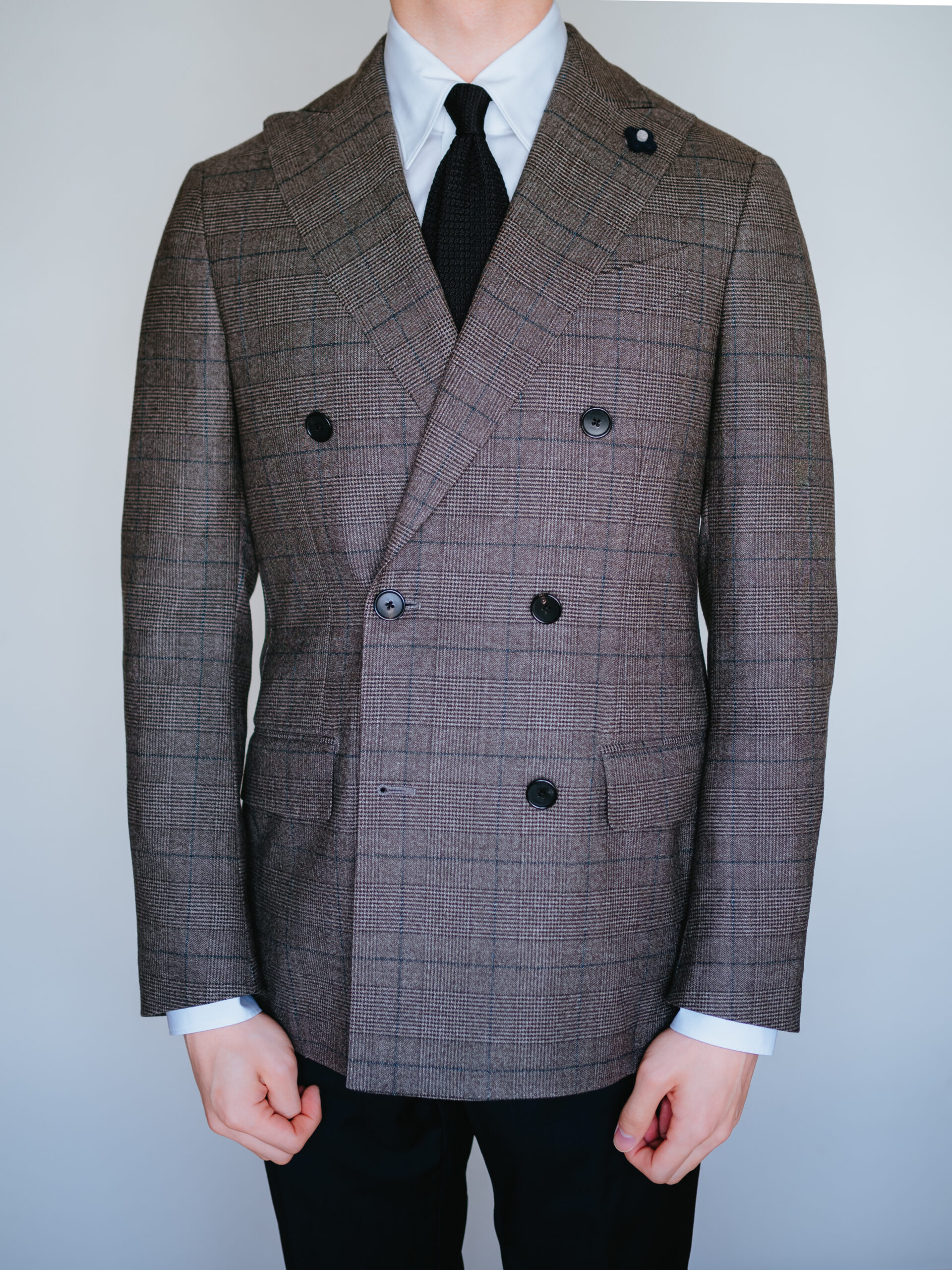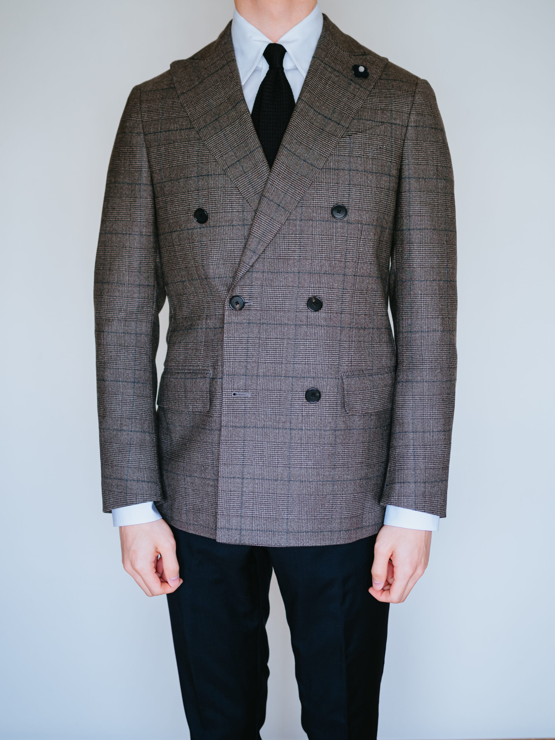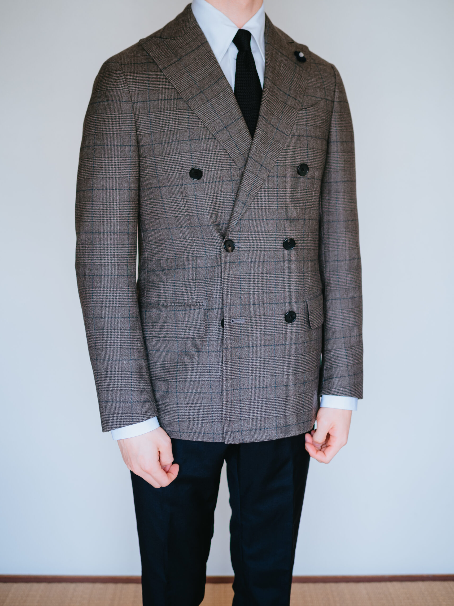 ラルディーニのジャケットを合わせると、襟先がぴったりおさまってくれました。