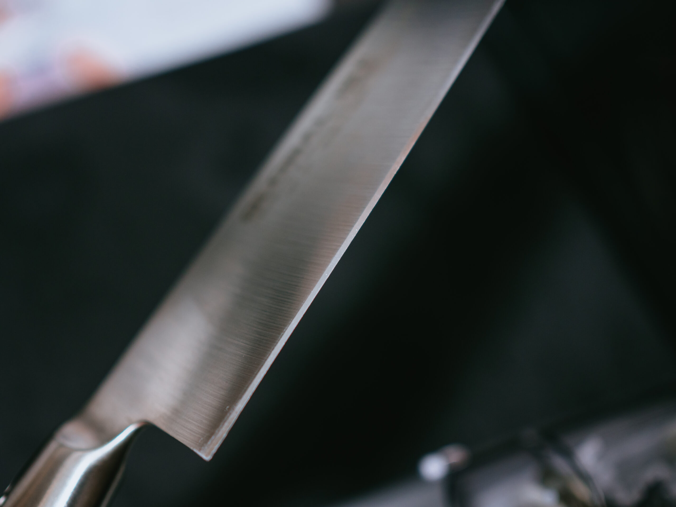 1回の研ぎで削れる刃は写真の通り砂よりも細かいので、月1〜2回の研ぎであれば刃が削れて刀身が細くなる心配は不要です。