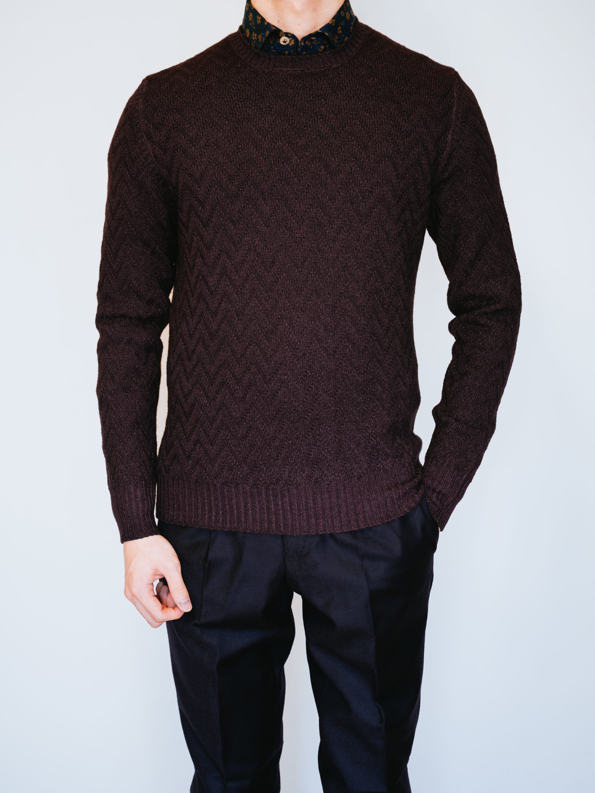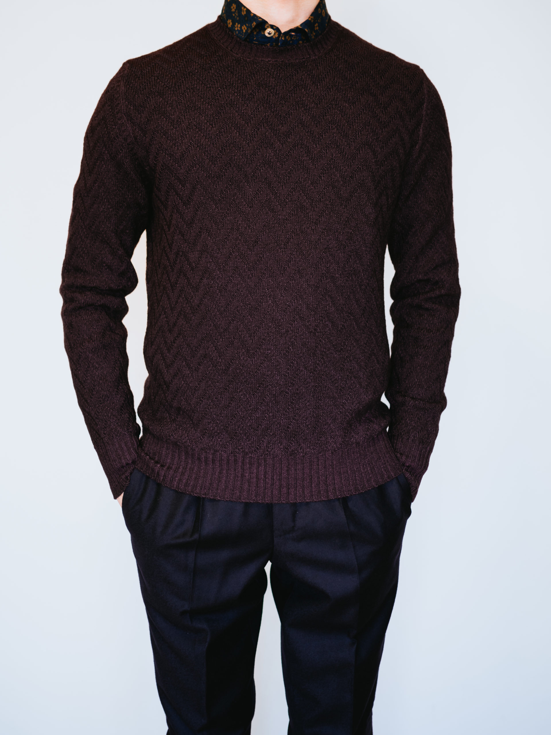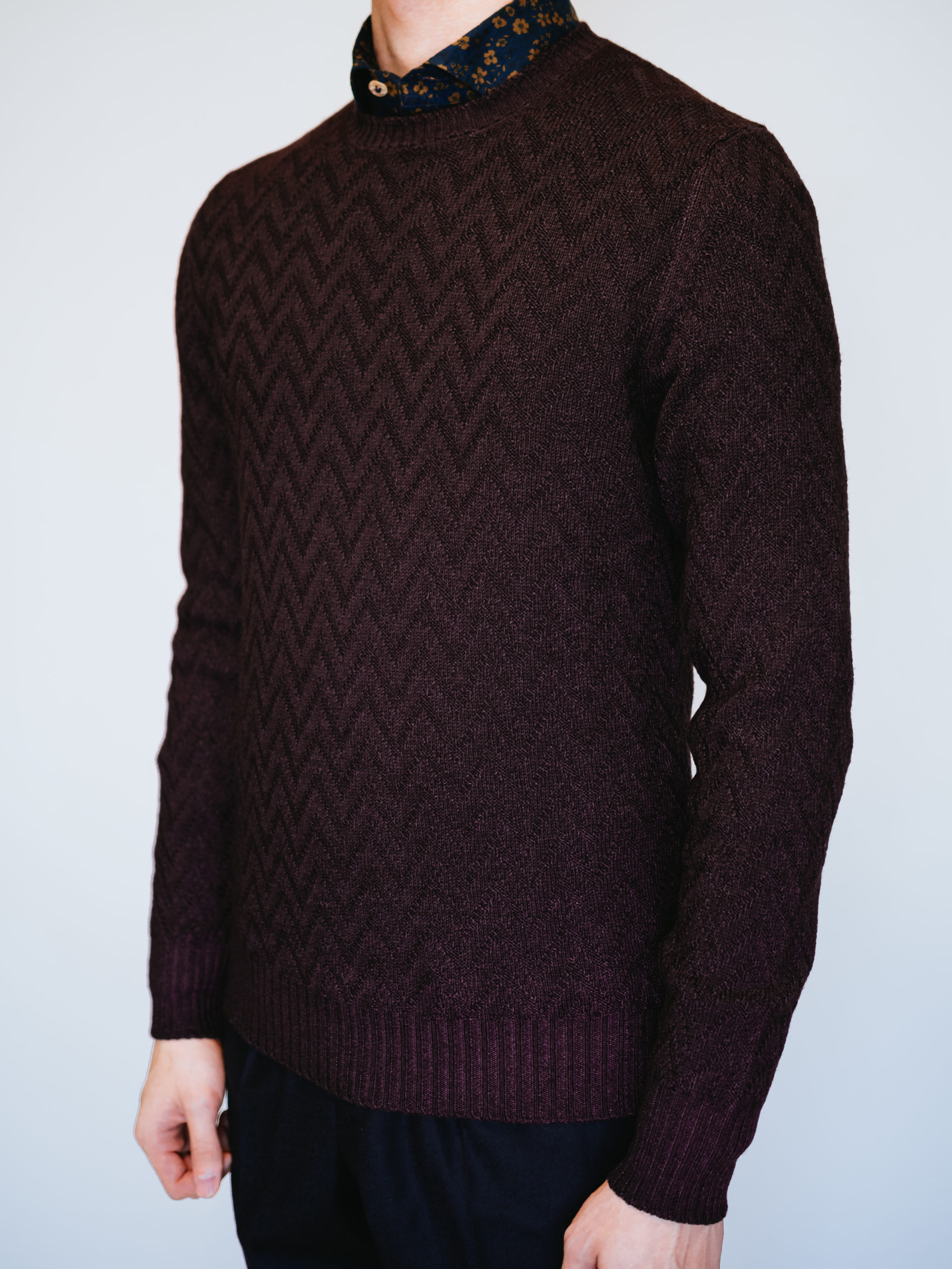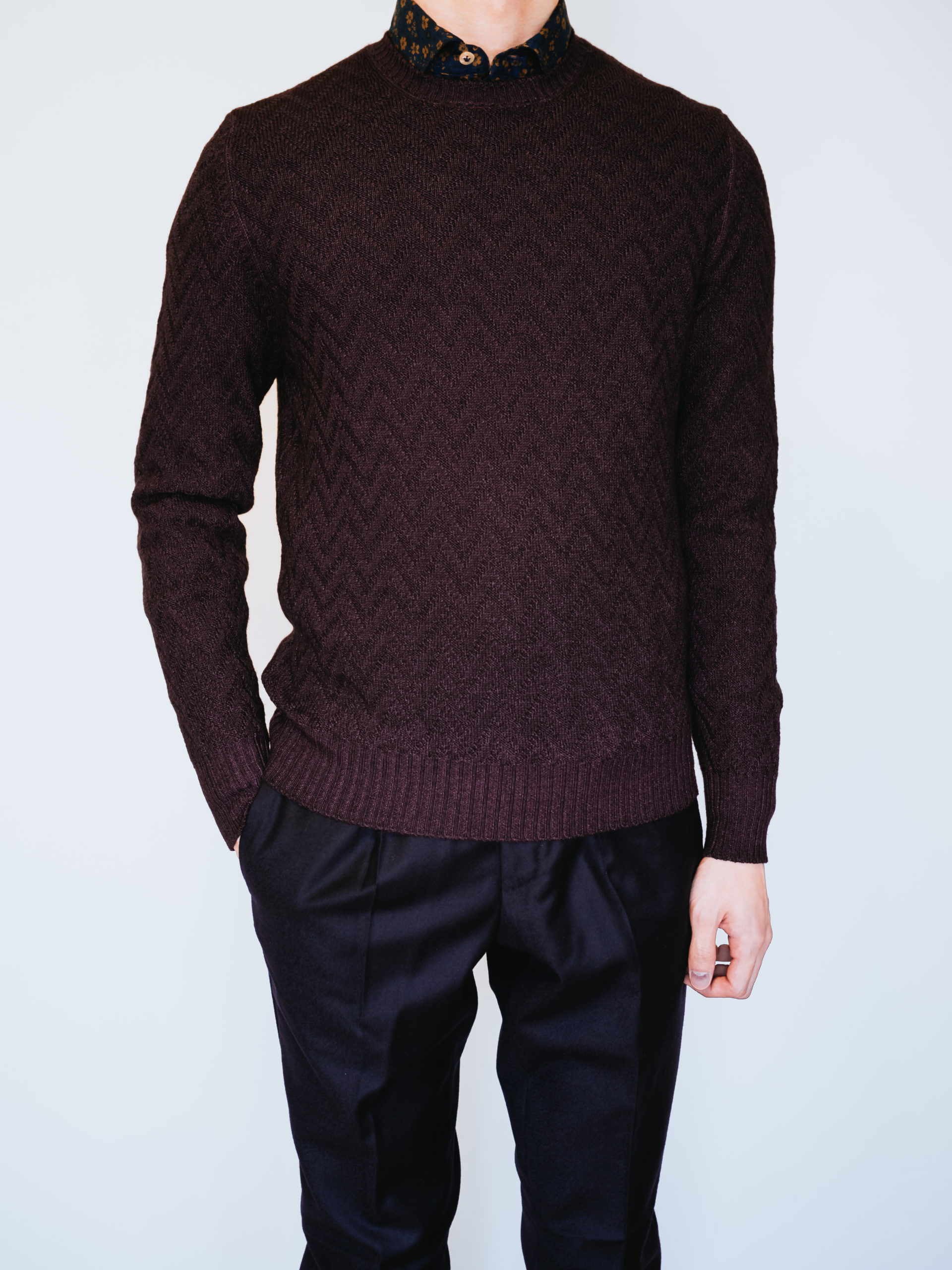 艶がありながらも落ち着いたワイン色の上品さとヴィンテージ染めとヘリンボーン柄のカジュアル感も相まって、他ブランドのニットとはまた一味違った雰囲気です。