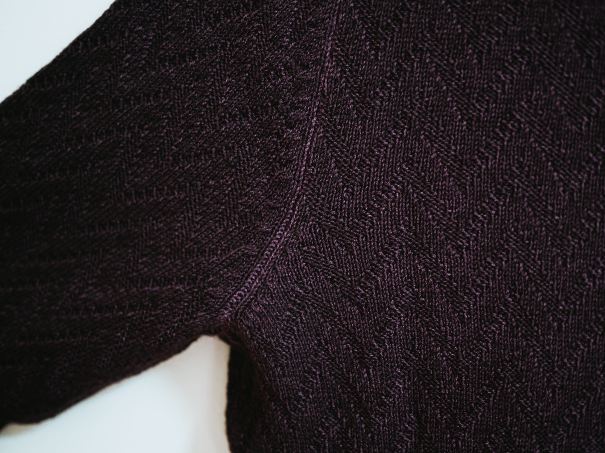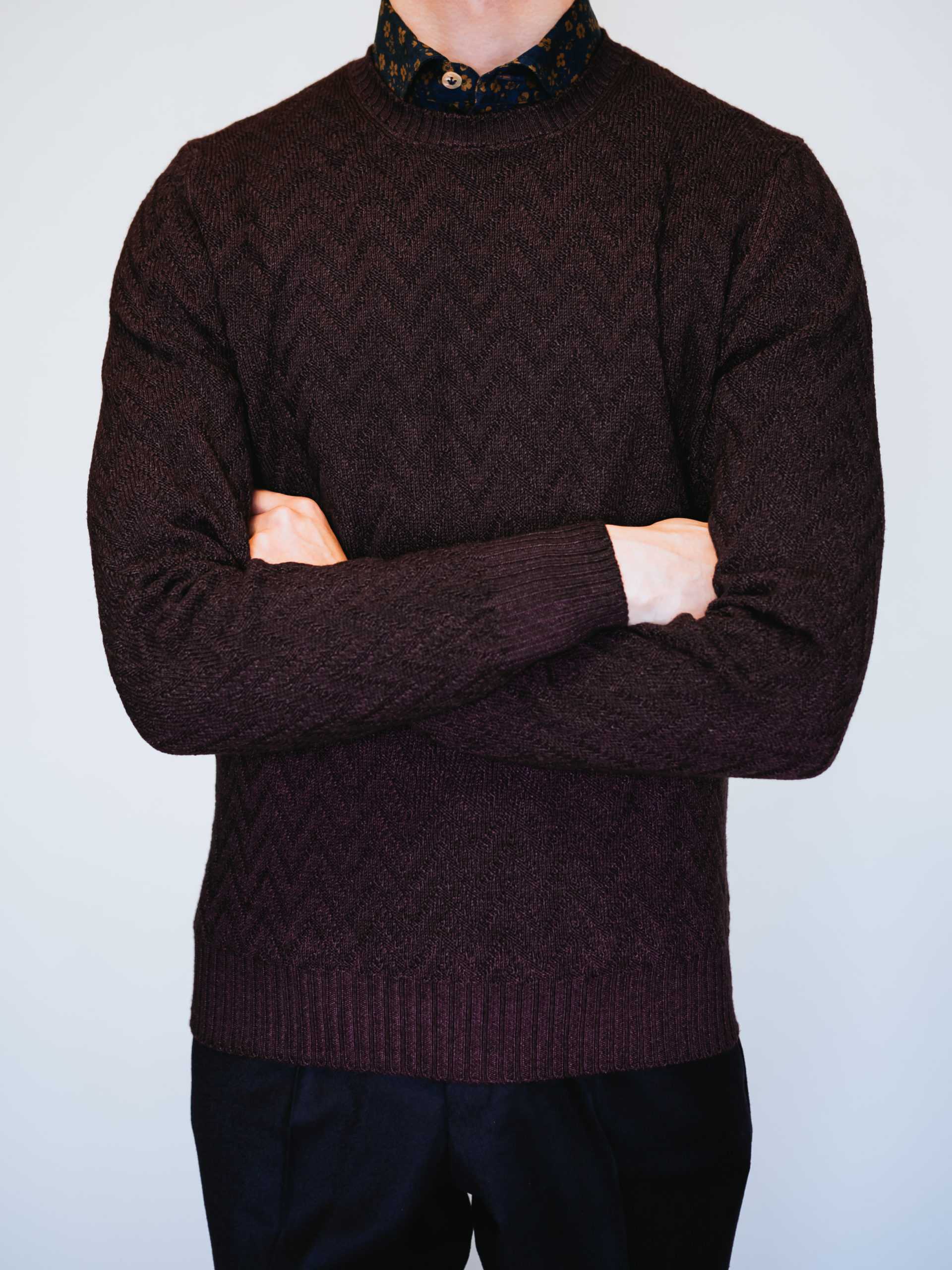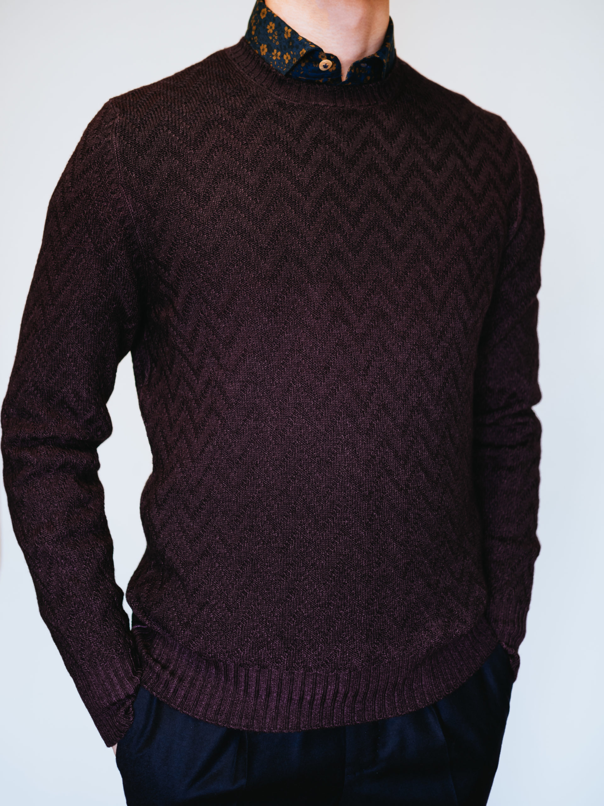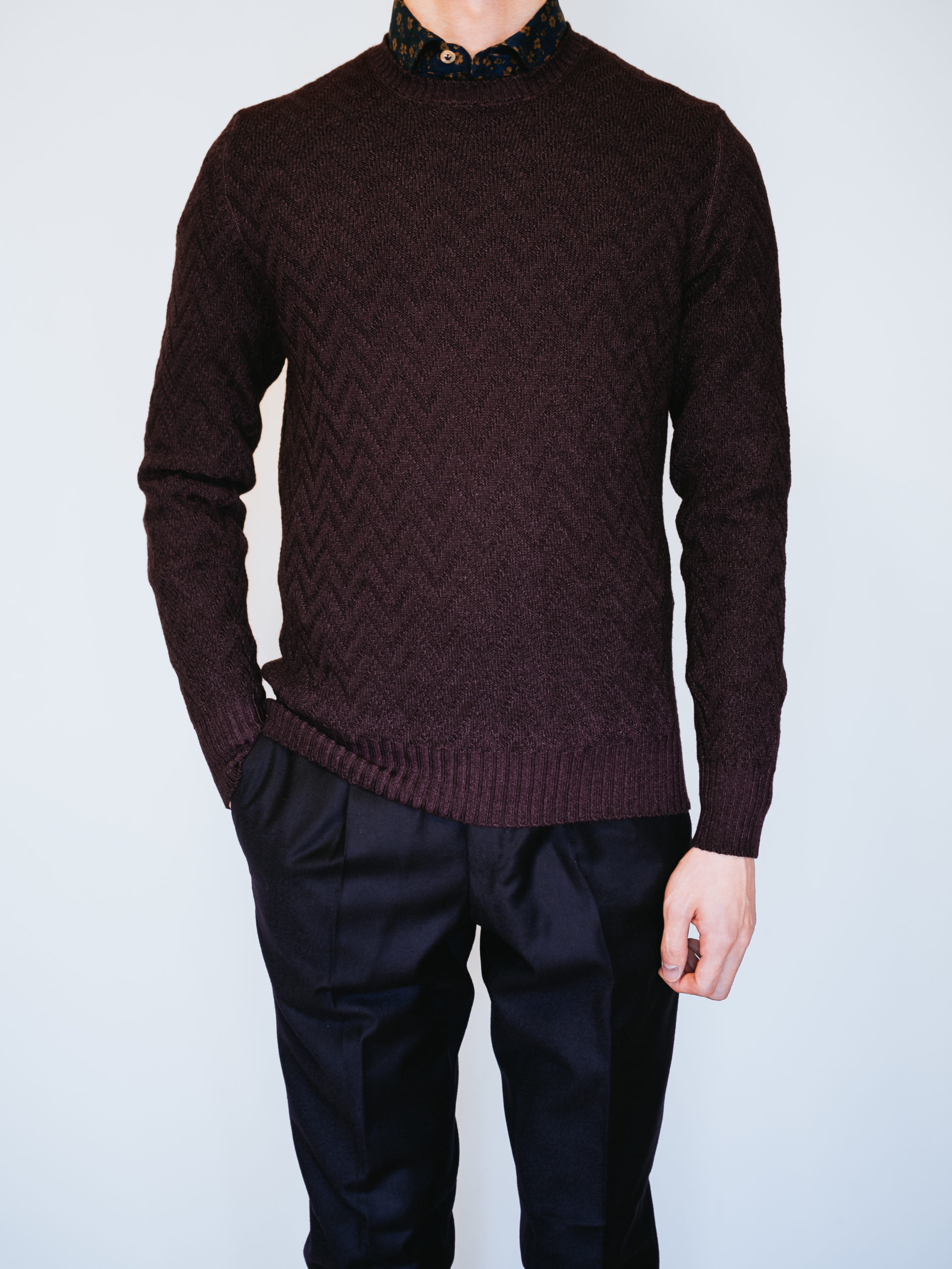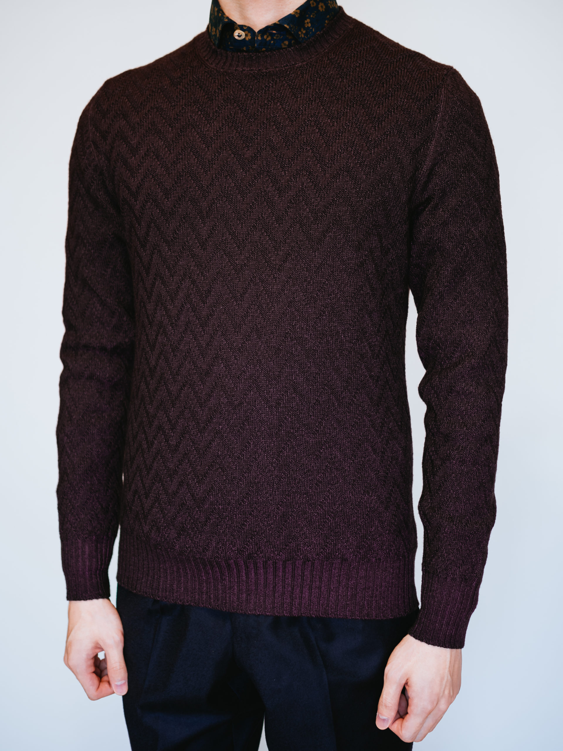 艶がありながらも落ち着いたワイン色の上品さとヴィンテージ染めとヘリンボーン柄のカジュアル感も相まって、他ブランドのニットとはまた一味違った雰囲気です。