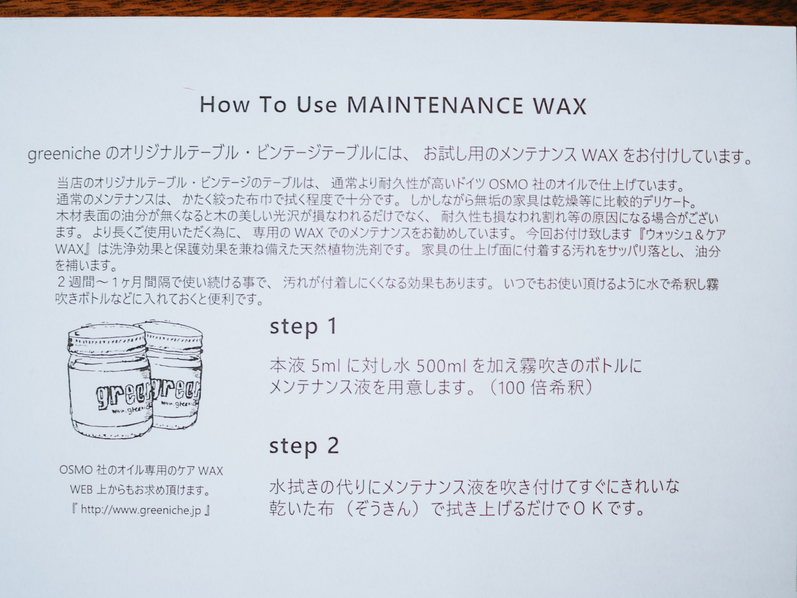 グリニッチでテーブルを購入するとお試し用のメンテナンスワックスが付いてきます。