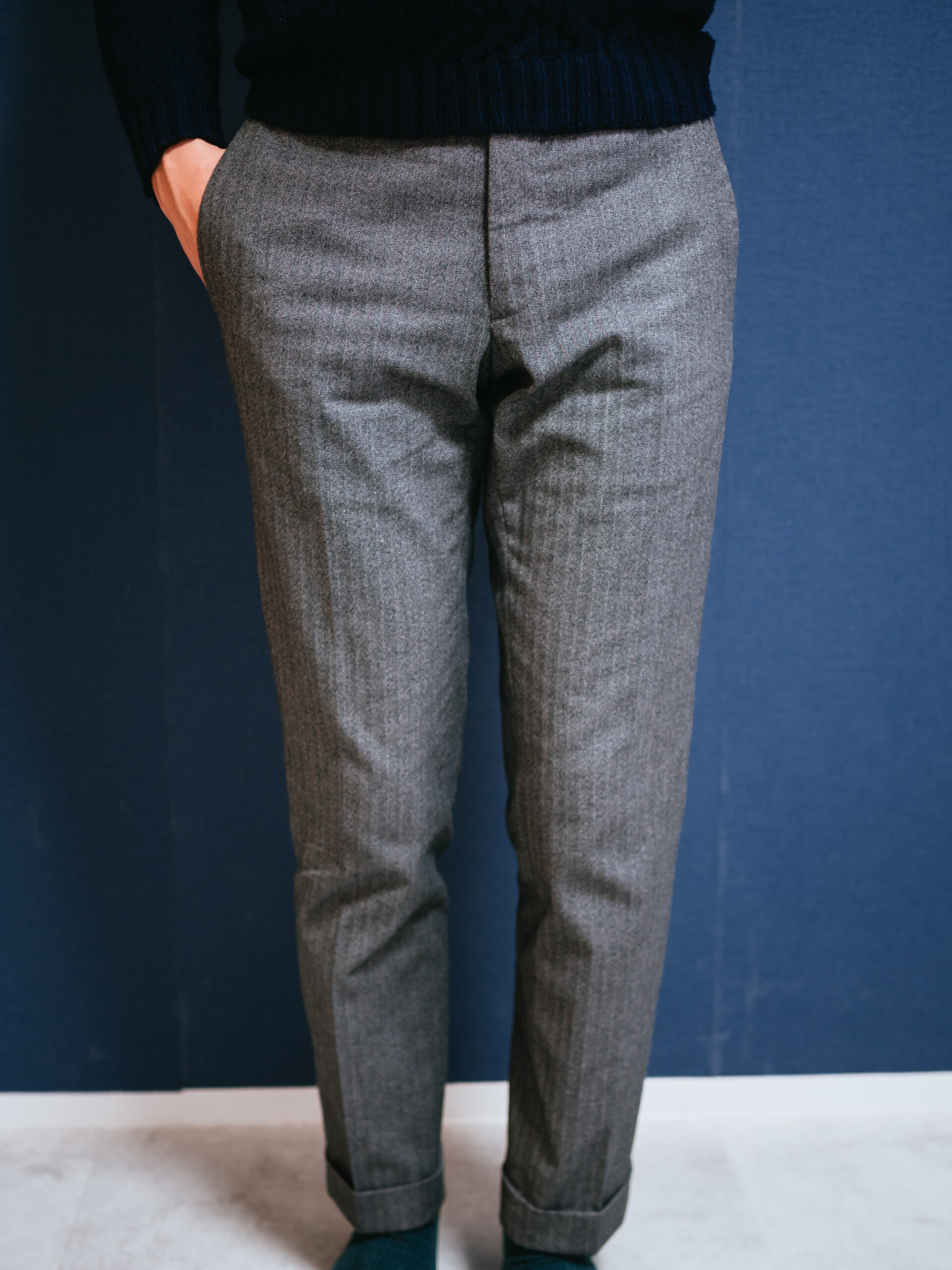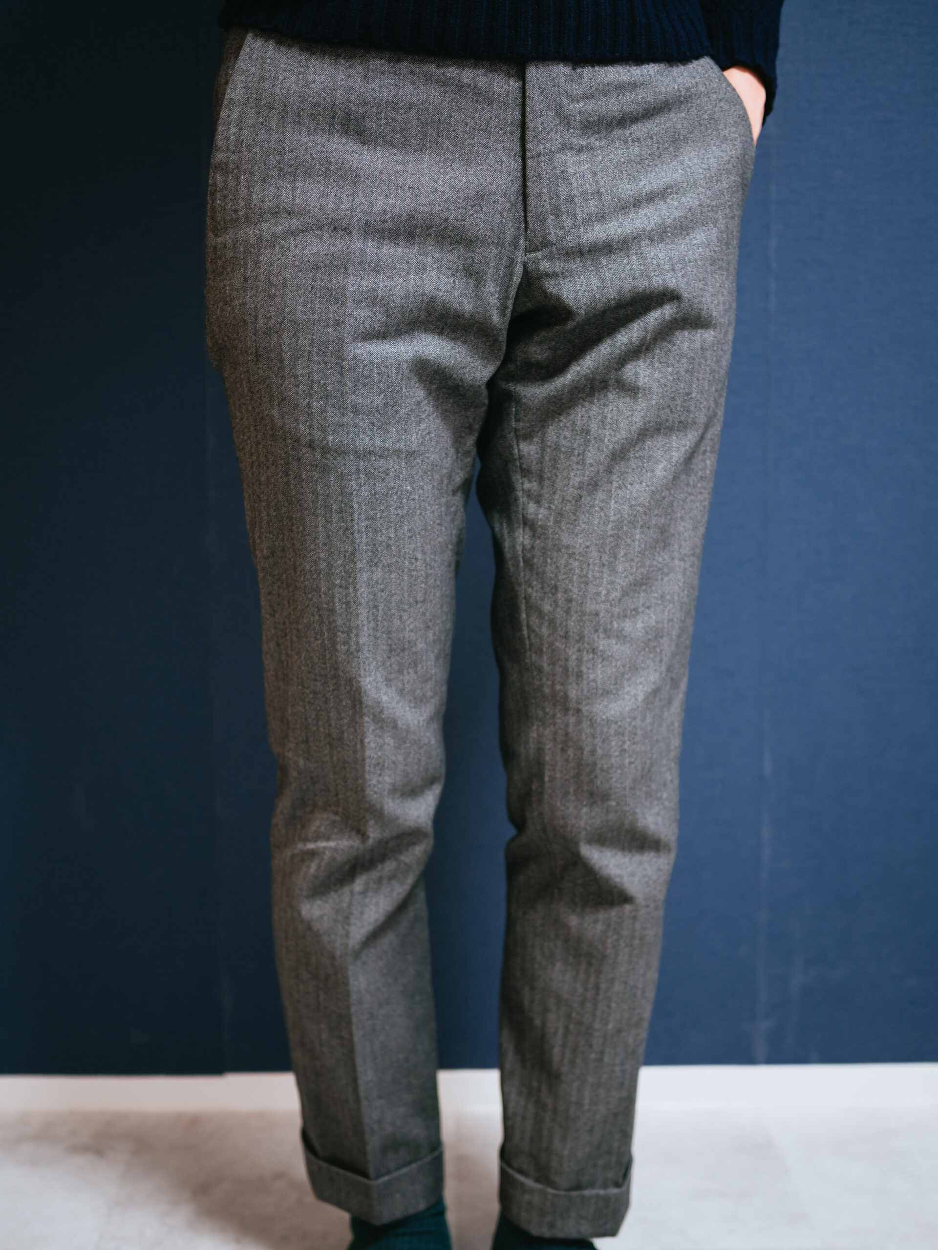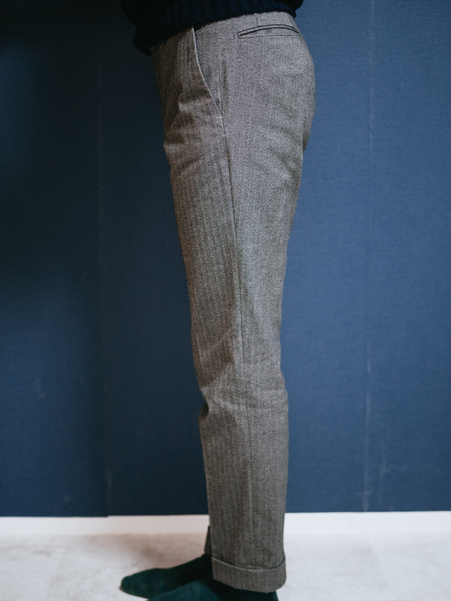 秋冬はウールの起毛パンツが好みだったのですが、このクラウドコットンも負けず劣らず質感の良い素材です。色や柄でパンツの種類がマンネリ化している方にオススメしたいモデルです。