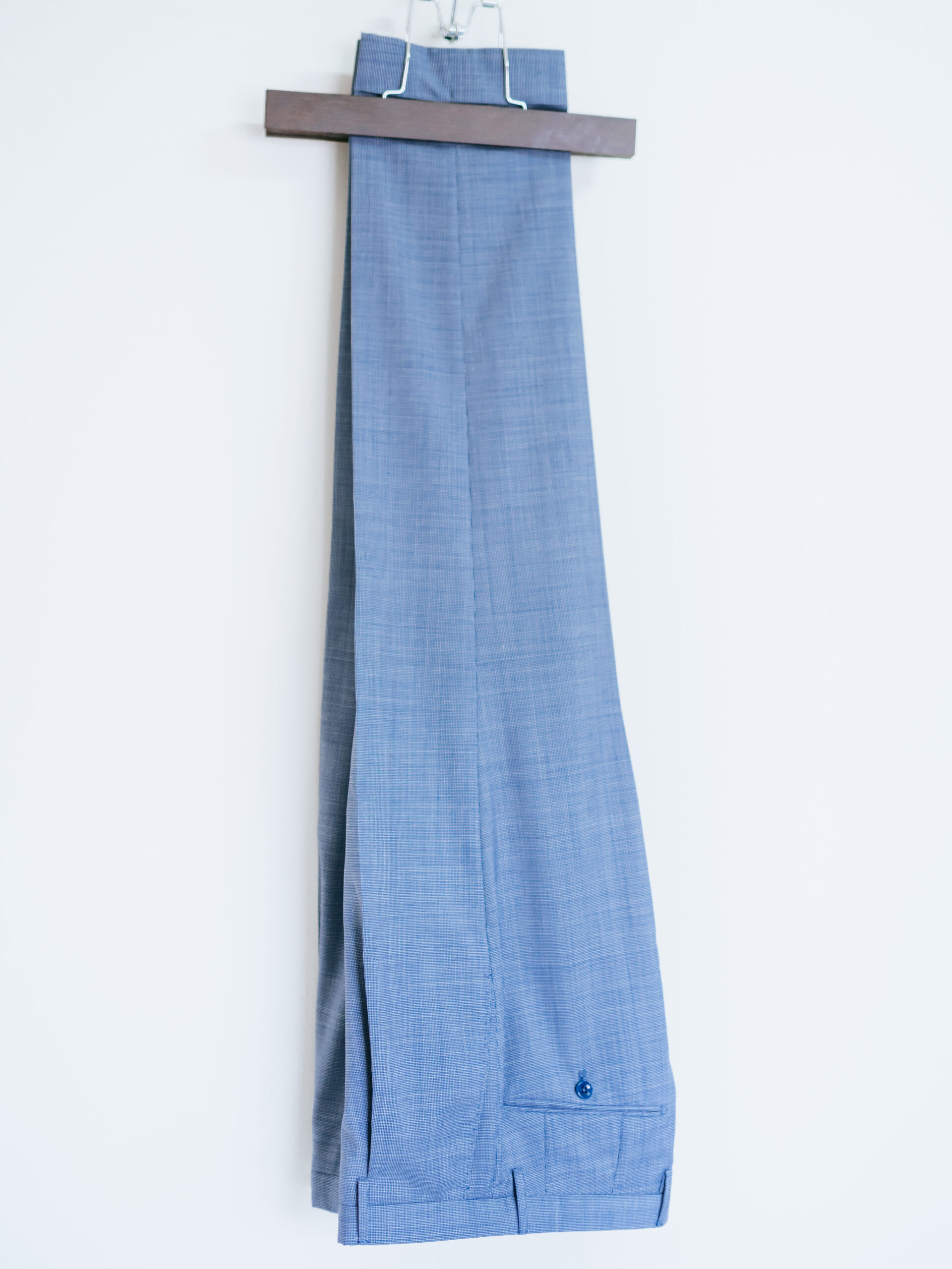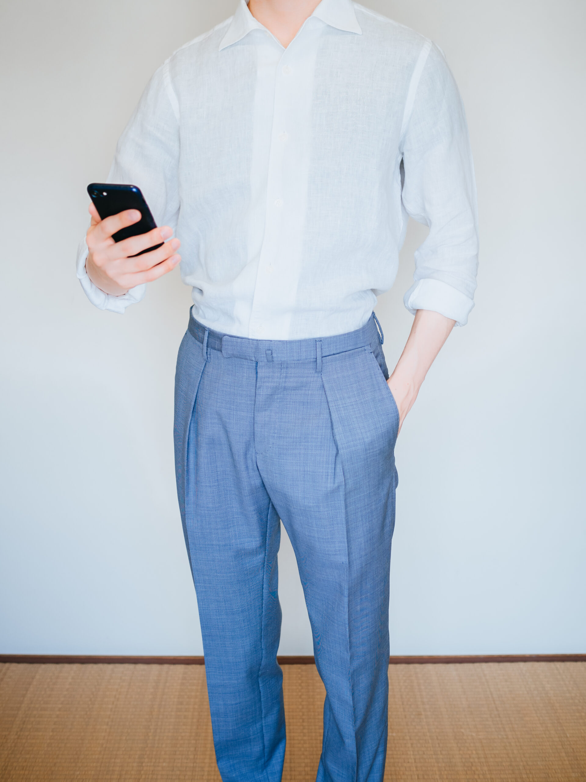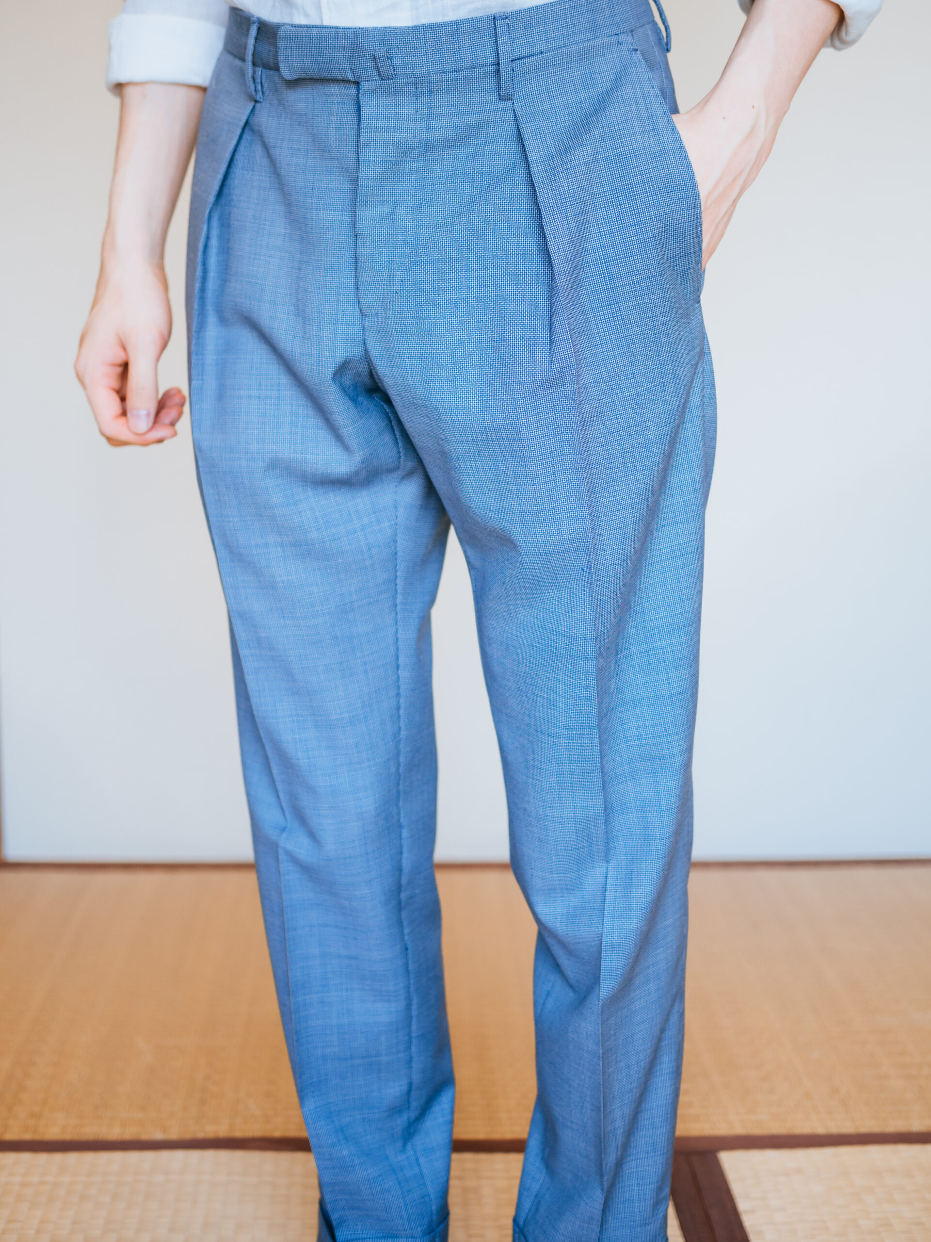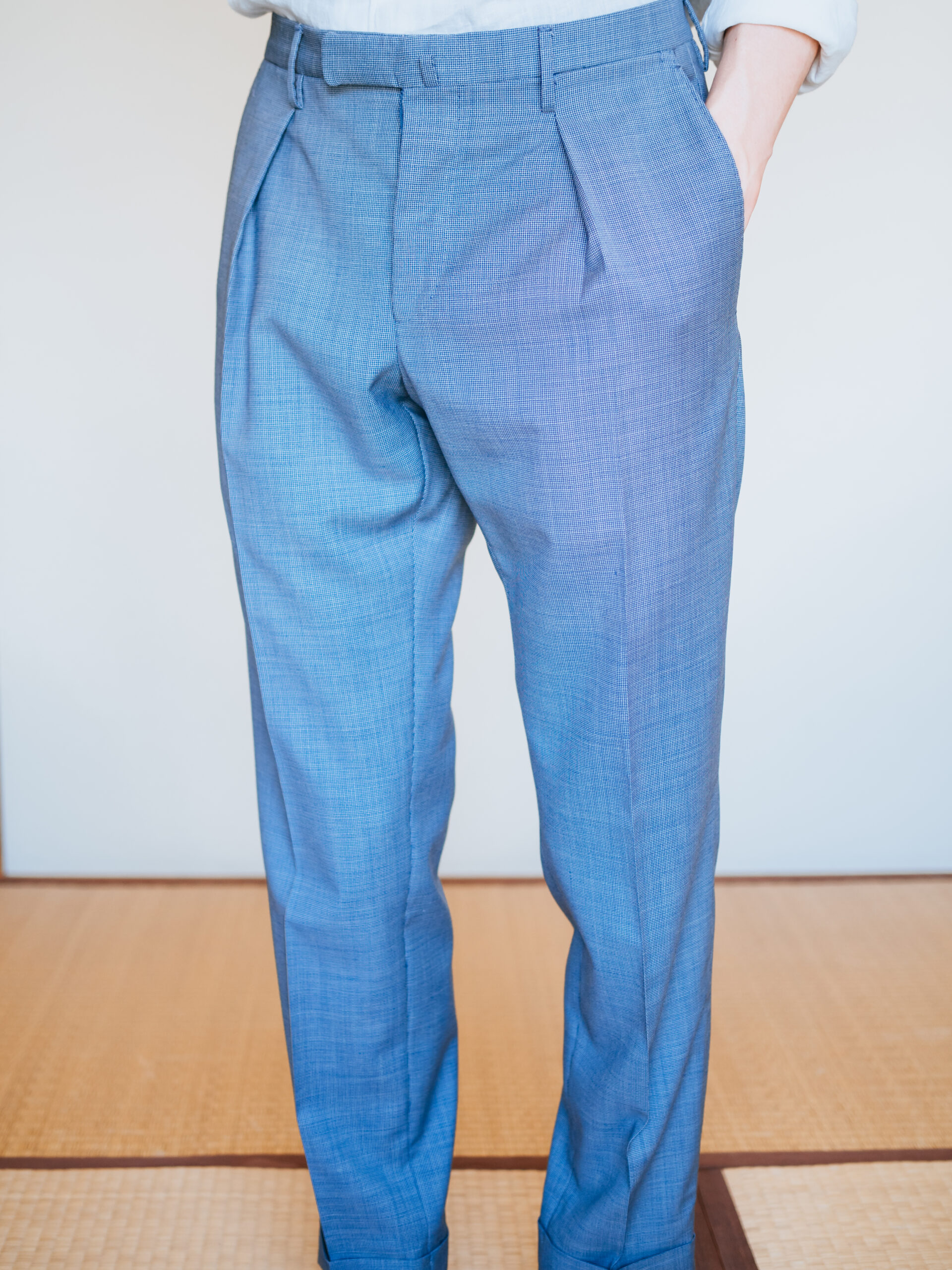 春夏のスラックスは定番色のネイビー、グレーのほか、オリーブを持っているため、春夏らしい爽やかな色のパンツを探していましたところ、GILTのセールで清涼感のあるライトブルー(ブルーグレー)のパンツを見つけました。4本目となるINCOTEX(インコテックス)のスラックスです。