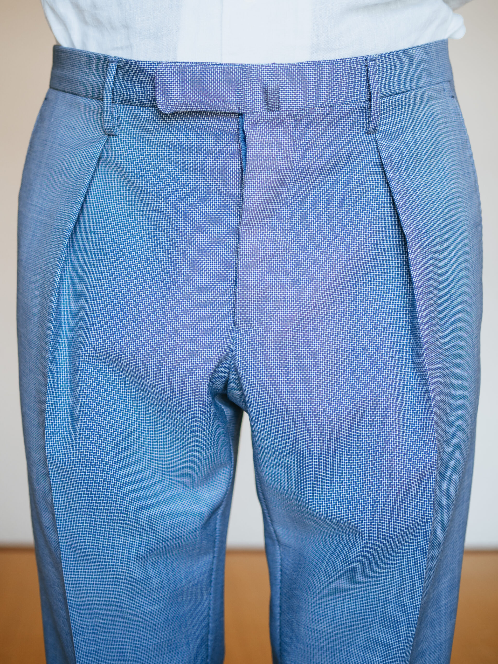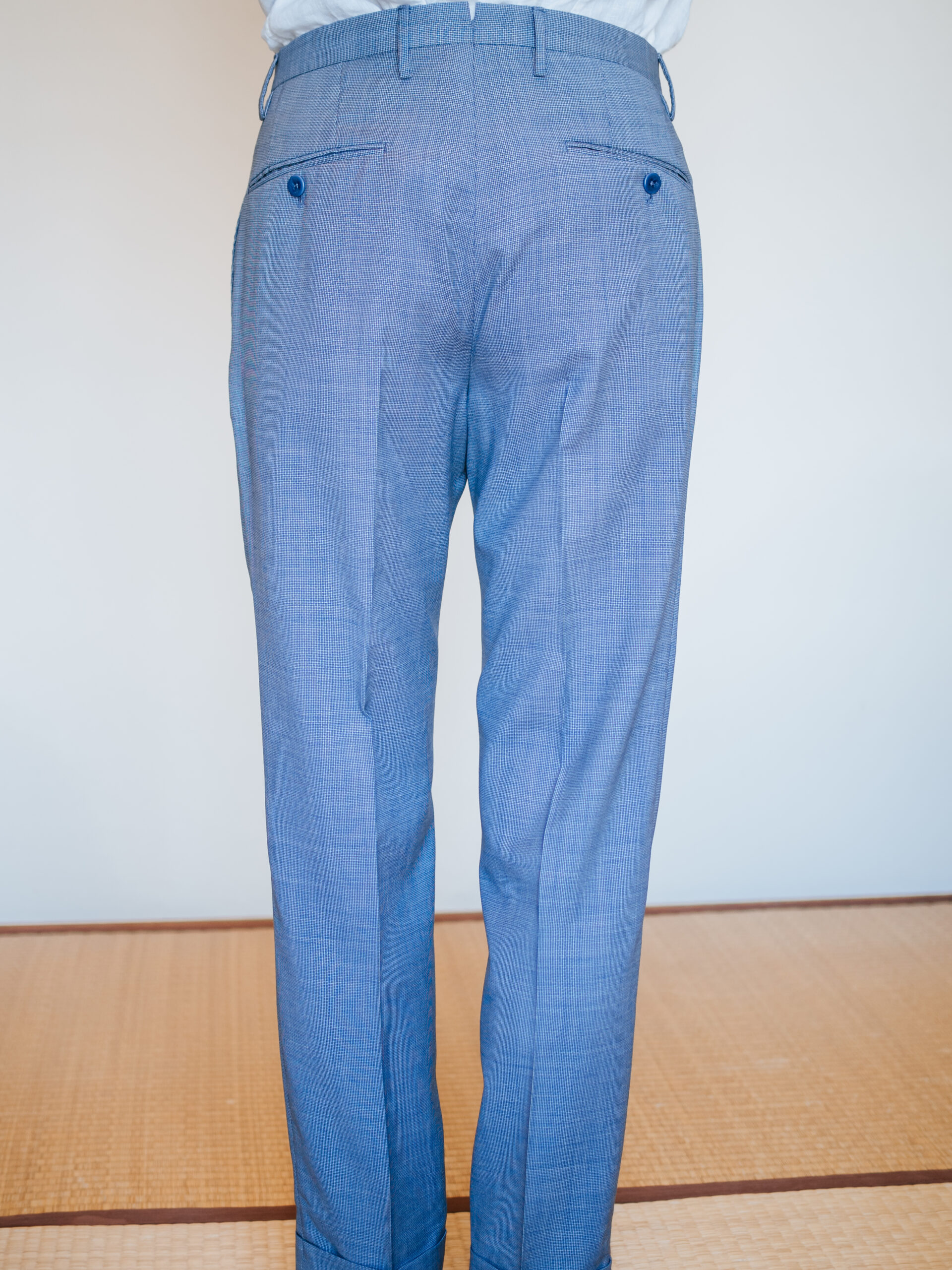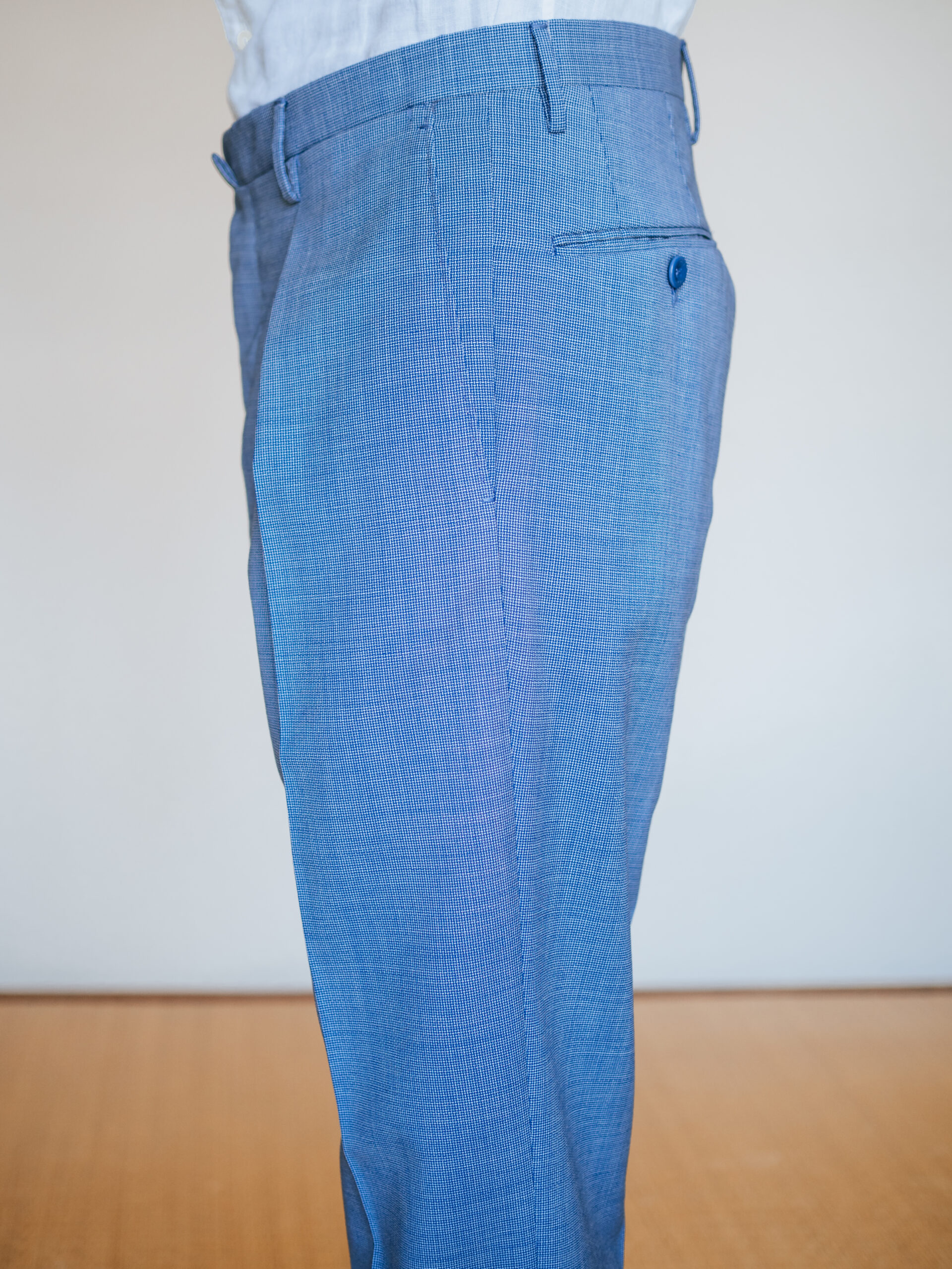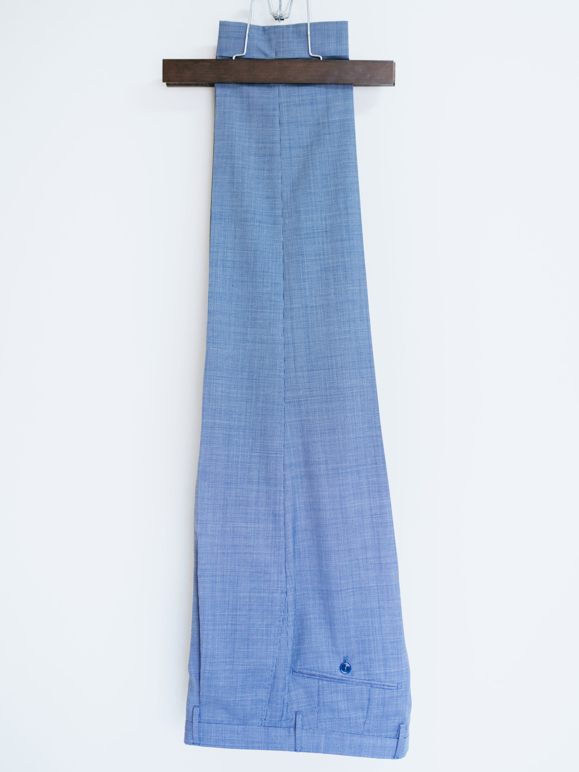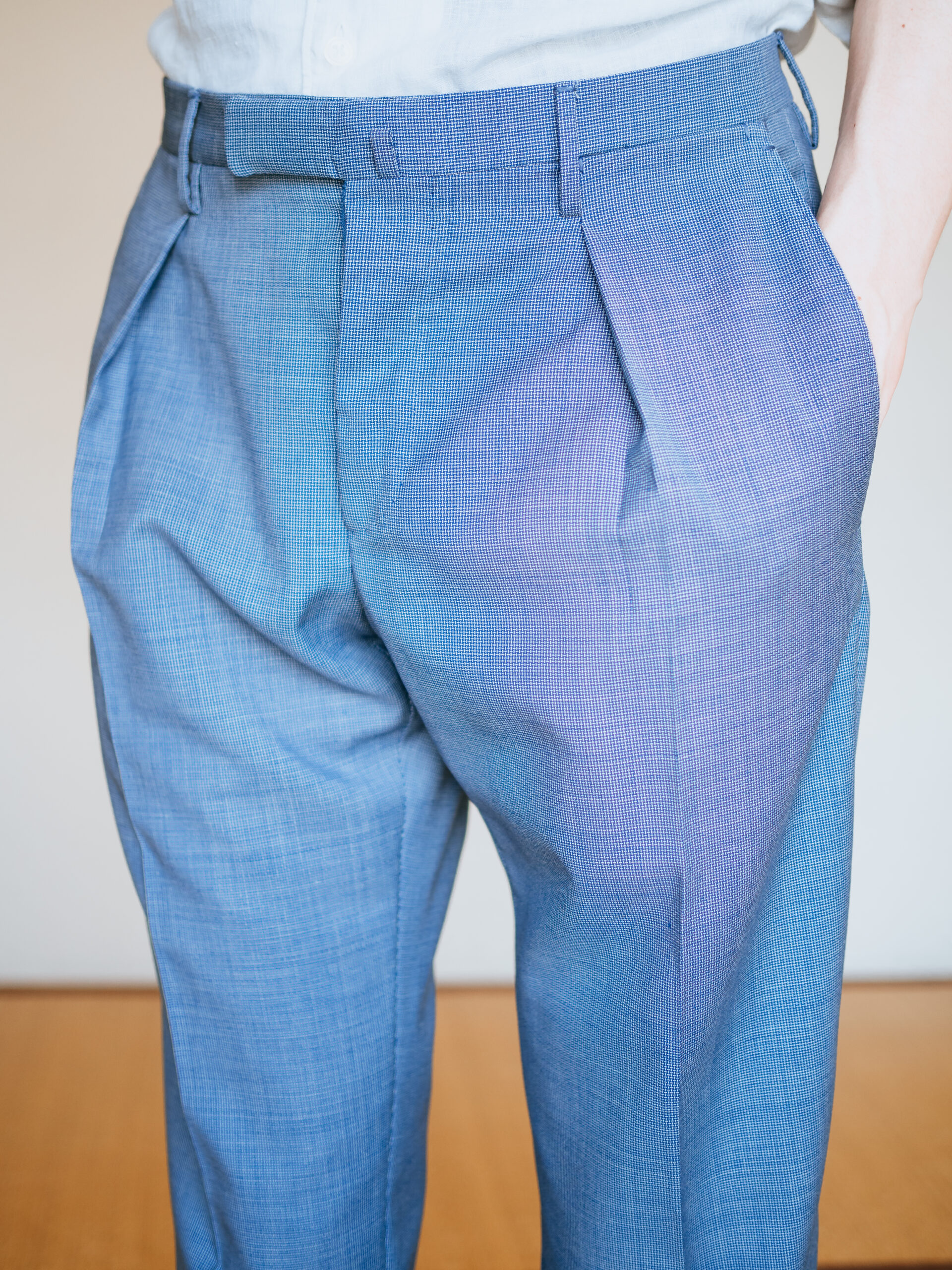春夏のスラックスは定番色のネイビー、グレーのほか、オリーブを持っているため、春夏らしい爽やかな色のパンツを探していましたところ、GILTのセールで清涼感のあるライトブルー(ブルーグレー)のパンツを見つけました。4本目となるINCOTEX(インコテックス)のスラックスです。