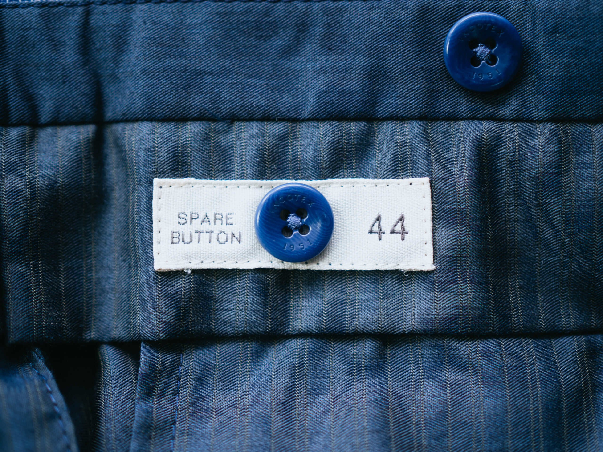 ボタンは水牛に次ぐ高級ボタンの「ナットボタン」。染色されていますが、年輪のような模様がしっかり見えます。