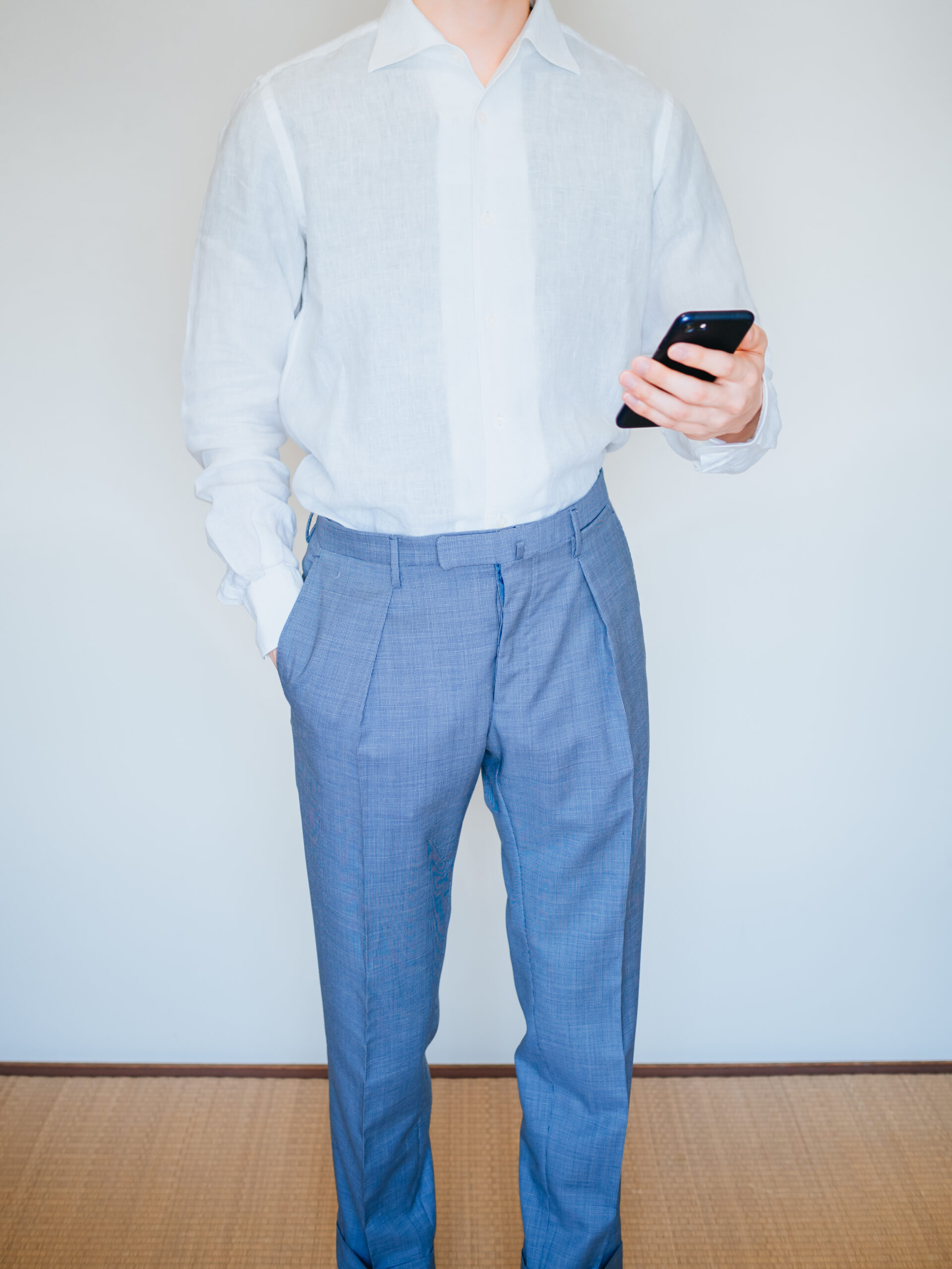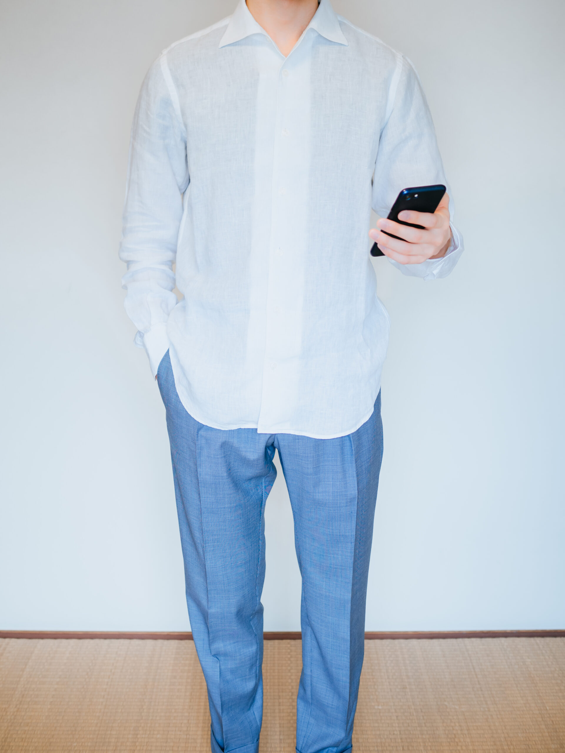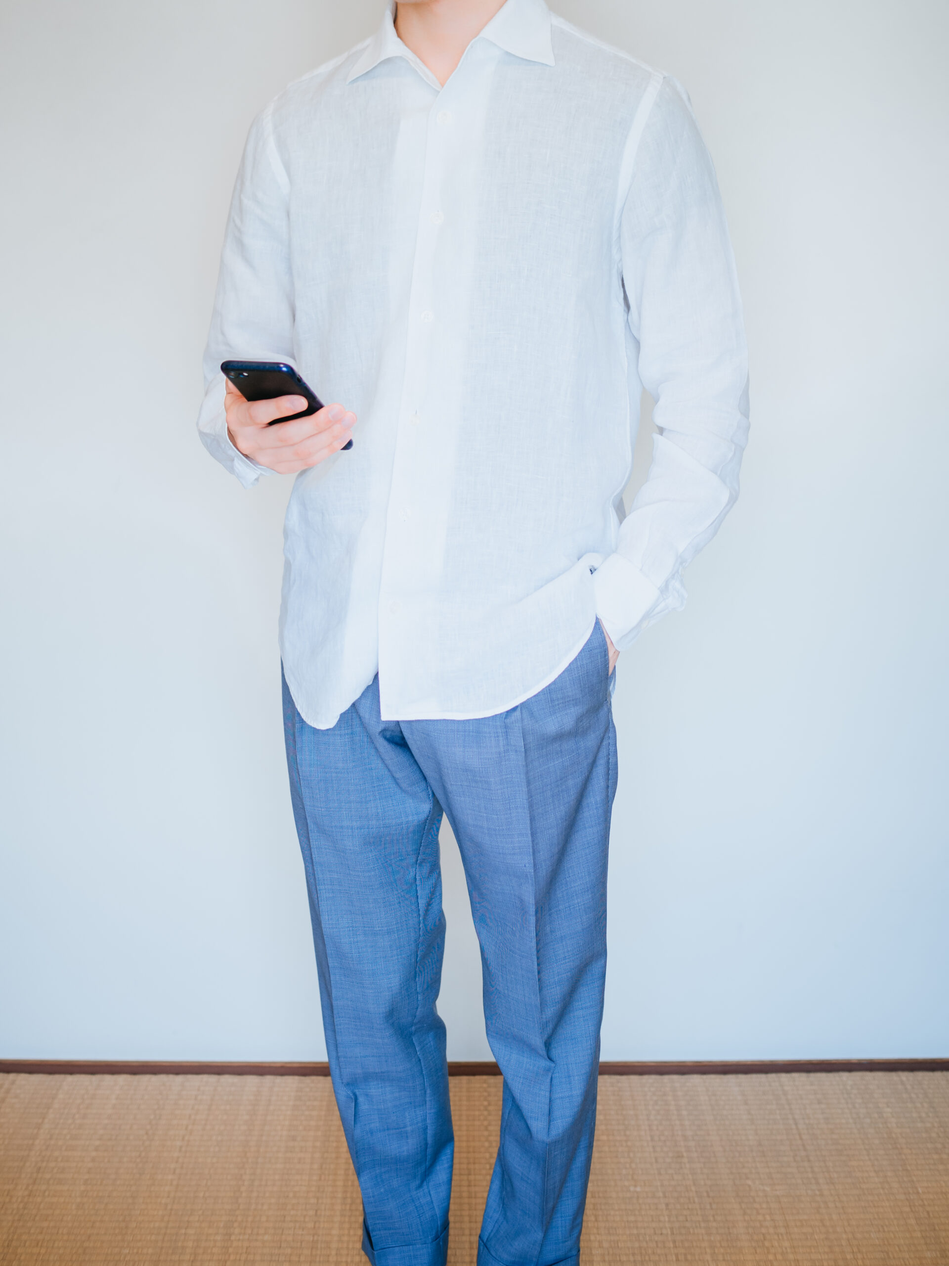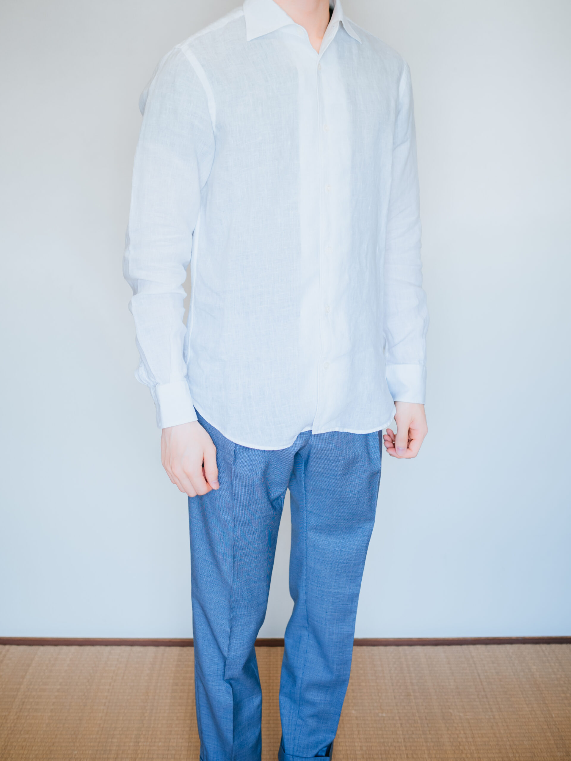 ウールですが、春夏モデルのため、サラッとした肌触りで涼しいです。淡い水色(ブルーグレー)が爽やかな印象を与えるのでリネンシャツと合わせると清涼感のあるコーディネートになります。